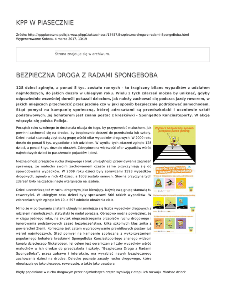 KPP W PIASECZNIE Źródło: http://kpppiaseczno.policja.waw.pl/pp1/aktualnosci/17457,Bezpieczna-droga-z-radami-SpongeBoba.html Wygenerowano: Sobota, 4 marca 2017, 13:19 Strona znajduje się w archiwum. BEZPIECZNA DROGA Z RADAMI SPONGEBOBA 128 dzieci zginęło, a ponad 5 tys. zostało rannych – to tragiczny bilans wypadków z udziałem najmłodszych, do jakich doszło w ubiegłym roku. Wielu z tych zdarzeń można by uniknąć, gdyby odpowiednio wcześniej dorośli pokazali dzieciom, jak należy zachować się podczas jazdy rowerem, w jakich miejscach przechodzić przez jezdnię czy w jaki sposób bezpiecznie podróżować samochodem. Stąd pomysł na kampanię społeczną, której adresatami są przedszkolaki i uczniowie szkół podstawowych. Jej bohaterem jest znana postać z kreskówki - SpongeBob Kanciastoporty. W akcję włączyła się polska Policja. Początek roku szkolnego to doskonała okazja do tego, by przypomnieć maluchom, jak powinni zachować się na drodze, by bezpiecznie dotrzeć do przedszkola lub szkoły. Dzieci nadal stanowią zbyt dużą grupę wśród ofiar wypadków drogowych. W 2009 roku doszło do ponad 5 tys. wypadków z ich udziałem. W wyniku tych zdarzeń zginęło 128 dzieci, a ponad 5 tys. doznało obrażeń. Zdecydowana większość ofiar wypadków wśród najmłodszych dzieci to pasażerowie pojazdów i piesi. Nieznajomość przepisów ruchu drogowego i brak umiejętności przewidywania zagrożeń sprawiają, że maluchy swoim zachowaniem często same przyczyniają się do spowodowania wypadków. W 2009 roku dzieci były sprawcami 1593 wypadków drogowych, zginęło w nich 42 dzieci, a 1608 zostało rannych. Główną przyczyną tych zdarzeń było najczęściej nagłe wtargnięcia na jezdnię. Dzieci uczestniczą też w ruchu drogowym jako kierujący. Największą grupę stanowią tu rowerzyści. W ubiegłym roku dzieci były sprawcami 566 takich wypadków. W zdarzeniach tych zginęło ich 19, a 597 odniosło obrażenia ciała. Mimo że w porównaniu z latami ubiegłymi zmniejsza się liczba wypadków drogowych z udziałem najmłodszych, statystyki te nadal porażają. Obrazowo można powiedzieć, że w ciągu jednego roku, na skutek nieprzestrzegania przepisów ruchu drogowego i ignorowania podstawowych zasad bezpieczeństwa, kilka szkolnych klas znika z powierzchni Ziemi. Konieczne jest zatem wypracowywanie prawidłowych postaw już wśród najmłodszych. Stąd pomysł na kampanię społeczną z wykorzystaniem popularnego bohatera kreskówki SpongeBoba Kanciastoportego znanego widzom kanału dziecięcego Nickelodeon. Jej celem jest ograniczenie liczby wypadków wśród maluchów w ich drodze do przedszkola i szkoły. "Bezpieczna Droga z Radami SpongeBoba", przez zabawę i interakcję, ma wyrabiać nawyk bezpiecznego zachowania dzieci na drodze. Dziecko poznaje zasady ruchu drogowego, które obowiązują go jako pieszego, rowerzystę, a także jako pasażera. Błędy popełniane w ruchu drogowym przez najmłodszych często wynikają z etapu ich rozwoju. Młodsze dzieci: - nie są w stanie podzielić swojej uwagi, koncentrują się tylko na jednej sprawie, rozmowie albo zabawie, - nie rozumieją zagrożeń występujących w ruchu drogowym, - mimo że znają niektóre zasady ruchu, nie stosują ich na drodze, - mają duże trudności ze zlokalizowaniem źródła dźwięku, oceną odległości i prędkości, Dlatego też mimo popularności tematu, stacja dziecięca Nickelodeon, Biuro Ruchu Drogowego Komendy Głównej Policji oraz Ministerstwo Zdrowia wraz z partnerami, magazynem „Mamo to ja” i firmą „Newsoudoor”, postanowiło zorganizować kolejną akcję, której celem jest wyrobienie nawyku bezpiecznego zachowania na drodze. SpongeBob nie poucza, ale w ciekawy sposób angażuje dzieci i przez zabawę zmusza do myślenia. Dziecko poznaje zasady bezpiecznego zachowania na drodze, odpowiadając na zadane przez SpongeBoba pytania. Odpowiedzi skonstruowane są w dowcipny sposób, dzięki czemu najmłodsi nie tylko uczą się, ale także fantastycznie bawią. Kampania skłąda się z dwóch etapów: W pierwszym etapie kampanii, w sierpniu, na terenie całego kraju zobaczyć można było billboardy akcji, które angażowały dzieci do myślenia, te młodsze zaś do rozmowy z rodzicem na temat bezpiecznego zachowania na drodze. Paweł Szkuta Dyrektor Sprzedaży i Marketingu News Outdoor: „Kiedy moje pokolenie było w wieku adresatów akcji Nickelodeona w Polsce było ok. 5 mln. samochodów. Dziś jest ich blisko 20 mln., a zagrożenie, jakie stanowią, jest niewspółmiernie większe niż wtedy. Sam jestem ojcem, dlatego wiem, jak wiele niebezpieczeństw czyha na nieświadome niebezpieczeństw dziecko. Dlatego trzymam kciuki za powodzenia akcji Nickelodeona i innych podobnych przedsięwzięć. Szczególnie tych, w których nauka ma formę zabawy, a w miejsce poważnych autorytetów, pojawiają się tak bliscy dzieciom, znani i lubiani bohaterowie kreskówek. Głęboko wierzę, że podobne inicjatywy nie tylko uczą właściwego zachowania na drodze, ale przede wszystkim kształtują postawy, które być może sprawią, że z małych piechurów i pasażerów wyrosną odpowiedzialni rowerzyści i motorowerzyści, a później świadomi kierowcy”. Drugi etap kampanii to ponad 50 tys. płyt DVD z programem "Bezpieczna Droga z Radami SpongeBoba", które we wrześniu trafią do wszystkich szkół i przedszkoli w całej Polsce. Na płycie, poza materiałem dydaktycznym, zamieszczono teledysk z piosenką dla dzieci, której treści także promują bezpieczeństwo. Słuchając tej piosenki, ucząc się jej i powtarzając tekst, dzieci w przedszkolach i szkołach będą przyswajały sobie treści związane z bezpieczeństwem w ruchu drogowym. Chcemy dzięki takim działaniom wyrobić wśród dzieci nawyk zapinania pasów, noszenia odblasków, przechodzenia przez jezdnię w miejscach dozwolonych i na zielonym świetle. Warto dodać, że akcja jest wyjątkowa 
