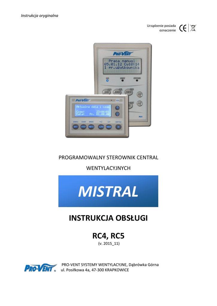 Instrukcja oryginalna Urządzenie posiada oznaczenie PROGRAMOWALNY STEROWNIK CENTRAL WENTYLACYJNYCH MISTRAL INSTRUKCJA OBSŁUGI RC4, RC5 (v. 2015_11) PRO-VENT SYSTEMY WENTYLACYJNE, Dąbrówka Górna ul. Posiłkowa 4a, 47-300 KRAPKOWICE Instrukcja obsługi RC4, RC5 SPIS TREŚCI 1. WPROWADZENIE ................................................................................................................................. 3 2. WYGLĄD MANIPULATORÓW ............................................................................................................... 3 2.1. 2.2. 2.3. 2.4. 3. PRZEGLĄDANIE NASTAW URZĄDZEŃ (WIDOKI) ................................................................................... 6 3.1. 3.2. 3.3. 3.4. 3.5. 3.6. 3.7. 3.8. 3.9. 3.10. 4. ZNACZENIE PRZYCISKÓW .................................................................................................................. 4 KOMUNIKATY INFORMACYJNE.......................................................................................................... 4 STEROWANIE WYDAJNOŚCIĄ WENTYLACJI ....................................................................................... 5 TRYBY PRACY ..................................................................................................................................... 5 PODSTAWOWE INFORMACJE O CENTRALI – WIDOK CENTRALA (PODSTAWOWY) ........................... 6 SPRAWDZENIE USTAWIEŃ WENTYLACJI – WIDOK WENTYLACJA ...................................................... 7 SPRAWDZENIE USTAWIEŃ NAGRZEWNICY – WIDOK NAGRZEWNICA............................................... 8 SPRAWDZENIE USTAWIEŃ CHŁODNICY – WIDOK CHŁODNICA.......................................................... 8 SPRAWDZENIE USTAWIEŃ PRZEPUSTNICY STREFOWEJ – WIDOK STREFA ........................................ 9 SPRAWDZENIE USTAWIEŃ PRACY WG WILGOTNOŚCI – WIDOK WILGOTNOŚĆ ................................ 9 SPRAWDZENIE USTAWIEŃ STEROWANIA WG CO2 – WIDOK STEROWANIE CO2 ............................ 10 SPRAWDZENIE USTAWIEŃ ODZYSKU CIEPŁA – WIDOK BYPASS ....................................................... 11 SPRAWDZENIE USTAWIEŃ GRUNTOWEGO WYMIENNIKA CIEPŁA – WIDOK GWC .......................... 12 USUNIĘCIE OGRANICZENIA CZASU DZIAŁANIA CENTRALI (WIDOK DEMO) ..................................... 13 ZMIANA USTAWIEŃ STEROWNIKA (MENU) ....................................................................................... 13 4.1. MENU GŁÓWNE – NAJCZĘŚCIEJ ZMIENIANE PARAMETRY ............................................................... 13 4.2. MENU PROGRAM AUTO .................................................................................................................. 14 4.2.1. ZMIANA PROGRAMU.................................................................................................................. 14 4.2.2. PODGLĄD I EDYCJA – PRZEGLĄDANIE POZYCJI PROGRAMU ...................................................... 16 4.2.3. PODGLĄD I EDYCJA – EDYCJA POZYCJI PROGRAMU ................................................................... 17 4.2.4. PODGLĄD I EDYCJA – USUWANIE POZYCJI PROGRAMU ............................................................ 18 4.2.5. PODGLĄD I EDYCJA – DODAWANIE NOWYCH POZYCJI DO PROGRAMU ................................... 18 4.2.6. KOPIOWANIE DNIA ..................................................................................................................... 19 4.2.7. ZAPIS I ZAPAMIĘTANIE PROGRAMU AUTOMATYCZNEGO ......................................................... 20 4.3. ZMIANA USTAWIEŃ WENTYLACJI – MENU WENTYLACJA................................................................ 20 4.4. ZMIANA USTAWIEŃ NAGRZEWNICY – MENU NAGRZEWNICA ........................................................ 21 4.5. ZMIANA USTAWIEŃ CHŁODNICY – MENU CHŁODNICA ................................................................... 22 4.6. ZMIANA USTAWIEŃ STREFY – MENU STREFA .................................................................................. 22 4.7. ZMIANA USTAWIEŃ ODZYSKU CIEPŁA – MENU BYPASS .................................................................. 23 4.8. ZMIANA USTAWIEŃ GRUNTOWEGO WYMIENNIKA CIEPŁA – MENU GWC ..................................... 23 4.9. ZMIANA USTAWIEŃ PRACY WG WILGOTNOŚCI – MENU WILGOTNOŚĆ ......................................... 24 4.10. ZMIANA USTAWIEŃ PRACY WG STĘŻENIA CO2 – MENU STĘŻENIE CO2 ........................................... 25 4.11. WYMIANA FILTRÓW I LICZNIK PRZYDATNOŚCI FILTRÓW – MENU FILTRY ....................................... 27 4.12. USTAWIENIA WIETRZENIA – MENU WIETRZENIE ............................................................................ 28 4.13. MENU AKTUALNA DATA I CZAS ....................................................................................................... 28 4.14. MENU SERWIS ................................................................................................................................. 29 4.14.1. INFORMACJE O CENTRALI (CENTRALA) ..................................................................................... 29 4.14.2. REGULACJA PODŚWIETLENIA MANIPULATORA (PODŚWIETLENIE) ........................................... 29 4.14.3. TEST INSTALACJI ........................................................................................................................ 30 4.14.4. NASTAWY FABRYCZNE............................................................................................................... 31 4.14.5. DIAGNOSTYKA ........................................................................................................................... 31 5. KOMUNIKATY ALARMOWE................................................................................................................ 33 5.1. 5.2. 5.3. 6. UWAGI I ALARMY ...........................................................