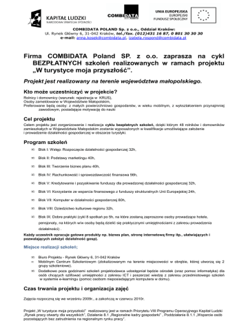 COMBIDATA POLAND Sp. z o.o., Oddział Kraków: Ul. Rynek Główny 6, 31-042 Kraków, tel./fax. (012)431 16 87, 0 801 30 30 30 e-mail: [email protected], [email protected] Firma COMBIDATA Poland SP. z o.o. zaprasza na cykl BEZPŁATNYCH szkoleń realizowanych w ramach projektu „W turystyce moja przyszłość”. Projekt jest realizowany na terenie województwa małopolskiego. Kto może uczestniczyć w projekcie? Rolnicy i domownicy (warunek: rejestracja w KRUS), Osoby zameldowane w Województwie Małopolskim, Preferowane będą osoby: z małych powierzchniowo gospodarstw, w wieku mobilnym, z wykształceniem przynajmniej zawodowym, posiadające motywację do nauki Cel projektu Celem projektu jest zorganizowanie i realizacja cyklu bezpłatnych szkoleń, dzięki którym 48 rolników i domowników zamieszkałych w Województwie Małopolskim zostanie wyposażonych w kwalifikacje umożliwiające założenie i prowadzenie działalności gospodarczej w obszarze turystyki. Program szkoleń • Blok I: Wstęp: Rozpoczęcie działalności gospodarczej 32h, • Blok II: Podstawy marketingu 40h, • Blok III: Tworzenie biznes planu 40h, • Blok IV: Rachunkowość i sprawozdawczość finansowa 56h, • Blok V: Kredytowanie i pozyskiwanie funduszy dla prowadzonej działalności gospodarczej 32h, • Blok VI: Korzystanie ze wsparcia finansowego z funduszy strukturalnych Unii Europejskiej 24h, • Blok VII: Komputer w działalności gospodarczej 80h, • Blok VIII: Dziedzictwo kulturowe regionu 32h, • Blok IX: Dobre praktyki (cykl 8 spotkań po 5h, na które zostaną zaproszone osoby prowadzące hotele, pensjonaty, na których w/w osoby będą dzielić się praktycznymi umiejętnościami z zakresu prowadzenia działalności) . Każdy uczestnik opracuje gotowe produkty np. biznes plan, stronę internetową firmy itp., ułatwiających i pozwalających założyć działalność gosp). Miejsce realizacji szkoleń; • • • Biuro Projektu - Rynek Główny 6, 31-042 Kraków Mobilnym Centrum Szkoleniowym (zlokalizowanym na terenie miejscowości w obrębie, której utworzą się 2 grupy szkoleniowe). Dodatkowo poza godzinami szkoleń projektodawca udostępniał będzie ośrodek (oraz pomoc informatyka) dla osób chcących szlifować umiejętności z zakresu ICT i poszerzać wiedzę z zakresu przedmiotowego szkoleń w systemie e-learningu (pomoc osobom nieposiadającym komputera w domu). Czas trwania projektu i organizacja zajęć Zajęcia rozpoczną się we wrześniu 2009r., a zakończą w czerwcu 2010r. Projekt „W turystyce moja przyszłość” realizowany jest w ramach Priorytetu VIII Programu Operacyjnego Kapitał Ludzki „Rynek pracy otwarty dla wszystkich”, Działanie 8.1 „Regionalne kadry gospodarki” , Poddziałanie 8.1.1 „Wsparcie osób pozostających bez zatrudnienia na regionalnym rynku pracy”. COMBIDATA POLAND Sp. z o.o., Oddział Kraków: Ul. Rynek Główny 6, 31-042 Kraków, tel./fax. (012)431 16 87, 0 801 30 30 30 e-mail: [email protected], [email protected] Zajęcia odbywać się będą w dni powszednie popołudniami i weekendy, zgodnie z harmonogramem stworzonym na podstawie ankiet zgłoszeniowych. Rekrutacja oraz warunki przyjęcia: • • • • • • • Należy pobrać i wypełnić kartę zgłoszeniową ze strony internetowej www.eduportal.pl , albo bezpośrednio w Biurze Projektu - Rynek Główny 6, 31-042 Kraków. Ankietę zgłoszeniową możecie Państwo otrzymać na wskazany adres pocztowy, bądź e-mailem. Wypełnioną kartę zgłoszeniową należy przesłać lub dostarczyć do COMBIDATA: Faksem na nr: (0-12) 431 16 87 Mailem na adres: [email protected] [email protected] (na pierwsze spotkanie informacyjne należy dostarczyć oryginał karty) pocztą na adres: COMBIDATA Poland sp. z o. o. Rynek Główny 6, 31-042 Kraków. osobiście do Biura Projektu w Krakowie Do karty zgłoszeniowej należy dołączyć ksero dowodu osobistego Każda z osób nadsyłających kartę zgłoszeniową otrzyma na jej podstawie liczbę punktów rekrutacyjnych. Oceniane będą kryteria formalne (kwalifikowalności osoby do grupy docelowej projektu) oraz miejsce zameldowania, wielkość gospodarstwa, wiek, wykształcenie, postawy. W przypadku otrzymania przez więcej niż jedną osobę takiej samej ilości punktów, decydujący wpływ będzie miała kolejność zgłoszeń. Do projektu może zakwalifikować się TYLKO 48 osób Wszyscy zainteresowani zostaną powiadomieni o wynikach procesu rekrutacji; Zakwalifikowane osoby zostaną poproszone o podpisanie oświadczenia potwierdzającego przynależność do grupy adresatów projektu oraz deklaracji uczestnictwa w projekcie; Odpłatność: Uczestnicy szkoleń nie wnoszą żadnych opłat za uczestnictwo w projekcie (projekt współfinansowany ze środków Europejskiego Funduszu Społecznego). Bezpłatnie otrzymują wparcie w postaci szkoleń, podręczników, materiałów pomocniczych do nauki, wyżywienie podczas zajęć. Dodatkowo każdy otrzyma częściowy zwrot kosztów dojazdów. Projekt „W turystyce moja przyszłość” realizowany jest w ramach Priorytetu VIII Programu Operacyjnego Kapitał Ludzki „Rynek pracy otwarty dla wszystkich”, Działanie 8.1 „Regionalne kadry gospodarki” , Poddziałanie 8.1.1 „Wsparcie osób pozostających bez zatrudnienia na regionalnym rynku pracy”.