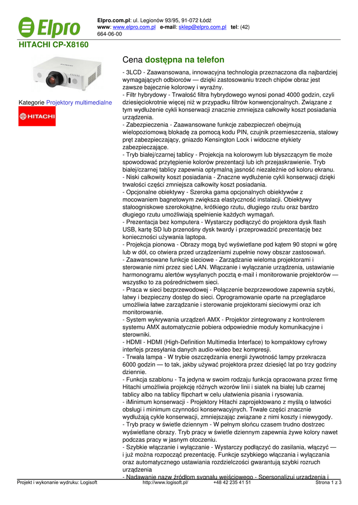 Elpro.com.pl: ul. Legionów 93/95, 91-072 Łódź www: www.elpro.com.pl e-mail: [email protected] tel: (42) 664-06-00 HITACHI CP-X8160 Cena dostępna na telefon Kategorie Projektory multimedialne Projekt i wykonanie wydruku: Logisoft - 3LCD - Zaawansowana, innowacyjna technologia przeznaczona dla najbardziej wymagających odbiorców — dzięki zastosowaniu trzech chipów obraz jest zawsze bajecznie kolorowy i wyraźny. - Filtr hybrydowy - Trwałość filtra hybrydowego wynosi ponad 4000 godzin, czyli dziesięciokrotnie więcej niż w przypadku filtrów konwencjonalnych. Związane z tym wydłużenie cykli konserwacji znacznie zmniejsza całkowity koszt posiadania urządzenia. - Zabezpieczenia - Zaawansowane funkcje zabezpieczeń obejmują wielopoziomową blokadę za pomocą kodu PIN, czujnik przemieszczenia, stalowy pręt zabezpieczający, gniazdo Kensington Lock i widoczne etykiety zabezpieczające. - Tryb białej/czarnej tablicy - Projekcja na kolorowym lub błyszczącym tle może spowodować przytępienie kolorów prezentacji lub ich przejaskrawienie. Tryb białej/czarnej tablicy zapewnia optymalną jasność niezależnie od koloru ekranu. - Niski całkowity koszt posiadania - Znaczne wydłużenie cykli konserwacji dzięki trwałości części zmniejsza całkowity koszt posiadania. - Opcjonalne obiektywy - Szeroka gama opcjonalnych obiektywów z mocowaniem bagnetowym zwiększa elastyczność instalacji. Obiektywy stałoogniskowe szerokokątne, krótkiego rzutu, długiego rzutu oraz bardzo długiego rzutu umożliwiają spełnienie każdych wymagań. - Prezentacja bez komputera - Wystarczy podłączyć do projektora dysk flash USB, kartę SD lub przenośny dysk twardy i przeprowadzić prezentację bez konieczności używania laptopa. - Projekcja pionowa - Obrazy mogą być wyświetlane pod kątem 90 stopni w górę lub w dół, co otwiera przed urządzeniami zupełnie nowy obszar zastosowań. - Zaawansowane funkcje sieciowe - Zarządzanie wieloma projektorami i sterowanie nimi przez sieć LAN. Włączanie i wyłączanie urządzenia, ustawianie harmonogramu alertów wysyłanych pocztą e-mail i monitorowanie projektorów — wszystko to za pośrednictwem sieci. - Praca w sieci bezprzewodowej - Połączenie bezprzewodowe zapewnia szybki, łatwy i bezpieczny dostęp do sieci. Oprogramowanie oparte na przeglądarce umożliwia łatwe zarządzanie i sterowanie projektorami sieciowymi oraz ich monitorowanie. - System wykrywania urządzeń AMX - Projektor zintegrowany z kontrolerem systemu AMX automatycznie pobiera odpowiednie moduły komunikacyjne i sterowniki. - HDMI - HDMI (High-Definition Multimedia Interface) to kompaktowy cyfrowy interfejs przesyłania danych audio-wideo bez kompresji. - Trwała lampa - W trybie oszczędzania energii żywotność lampy przekracza 6000 godzin — to tak, jakby używać projektora przez dziesięć lat po trzy godziny dziennie. - Funkcja szablonu - Ta jedyna w swoim rodzaju funkcja opracowana przez firmę Hitachi umożliwia projekcję różnych wzorów linii i siatek na białej lub czarnej tablicy albo na tablicy flipchart w celu ułatwienia pisania i rysowania. - iMinimum konserwacji - Projektory Hitachi zaprojektowano z myślą o łatwości obsługi i minimum czynności konserwacyjnych. Trwałe części znacznie wydłużają cykle konserwacji, zmniejszając związane z nimi koszty i niewygody. - Tryb pracy w świetle dziennym - W pełnym słońcu czasem trudno dostrzec wyświetlane obrazy. Tryb pracy w świetle dziennym zapewnia żywe kolory nawet podczas pracy w jasnym otoczeniu. - Szybkie włączanie i wyłączanie - Wystarczy podłączyć do zasilania, włączyć — i już można rozpocząć prezentację. Funkcje szybkiego włączania i wyłączania oraz automatycznego ustawiania rozdzielczości gwarantują szybki rozruch urządzenia - Nadawanie nazw źródłom sygnału wejściowego - Spersonalizuj urządzenia i http://www.logisoft.pl/ +48 42 235 41 51 Strona 1 z 3 źródła sygnału dla projektora, nadając im łatwo rozpoznawalne nazwy, np. „Laptop Tomka”. - Ultraciche - Wewnętrzny wentylator zainstalowany w naszych najnowszych modelach emituje dźwięk o natężeniu zaledwie 29 dB, co czyni go jednym z najcichszych w swojej klasie. Widzowie słyszą prezentera, nie odgłosy pracy urządzenia. - Funkcja „Mój przycisk” - Do programowalnego przycisku na pilocie zdalnego sterowania można przypisać funkcje użytkownika lub często wykonywane zadania. - Funkcja wiadomości błyskawicznych - Jednoczesne wysyłanie wiadomości tekstowych i anonsów do wielu projektorów w sieci. Funkcja nadaje się idealnie do wyświetlania harmonogramów pracy i powiadomień przez wiele projektorów w tym samym czasie. - Funkcja scentralizowanego raportowania - Za pomocą jednego komputera można tworzyć raporty HTML dotyczące grupy projektorów w sieci, co upraszcza ich konserwację. - Funkcja przelotowego sygnału audio - Kiedy prezenter potrzebuje tylko dźwięku, a nie obrazu, ta przydatna funkcja umożliwia odtwarzanie ścieżki audio z głośników projektora, podczas gdy pozostałe komponenty działają w trybie gotowości, co pozwala przedłużyć żywotność lampy. - Korekcja zniekształcenia trapezowego w pionie - Automatyczna poprawa nierównych obrazów dzięki funkcji korekcji zniekształcenia trapezowego w pionie. - Skanowanie progresywne - Ruchome obrazy są zazwyczaj wyświetlane w dwóch etapach: najpierw linie nieparzyste każdej klatki, potem linie parzyste. Skanowanie progresywne umożliwia jednoczesne wyświetlanie wszystkich linii klatki wideo, co daje w wyniku ostry obraz, płynny efekt ruchu i zmniejsza migotanie obrazu i jego drżenie. - Menu ekranowe (OSD) - Nowe menu jest o wiele łatwiejsze w użyciu. Nawigacja jest prostsza, a nazwy ustawień jasne. - Oszczędność energii - Firma Hitachi pamięta o środowisku naturalnym, projektując telewizory LCD z myślą o niskim poborze energii, odpowiedzialnie dobierając materiały i ko