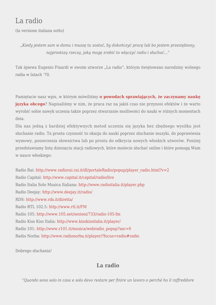 La radio (la versione italiana sotto) „Kiedy jestem sam w domu i muszę tu zostać, by dokończyć pracę lub bo jestem przeziębiony, najprostszą rzeczą, jaką mogę zrobić to włączyć radio i słuchać…” Tak śpiewa Eugenio Finardi w swoim utworze „La radio”, którym świętowano narodziny wolnego radia w latach ‘70. Pamiętacie nasz wpis, w którym mówiliśmy o powodach sprawiających, że zaczynamy naukę języka obcego? Napisaliśmy w nim, że praca raz na jakiś czas nie przynosi efektów i że warto wyrobić sobie nawyk uczenia także poprzez stwarzanie możliwości do nauki w różnych momentach dnia. Dla nas jedną z bardziej efektywnych metod uczenia się języka bez zbędnego wysiłku jest słuchanie radio. Ta prosta czynność to okazja do nauki poprzez słuchanie muzyki, do poprawienia wymowy, poszerzenia słownictwa lub po prostu do odkrycia nowych włoskich utworów. Poniżej przedstawiamy listę dziesięciu stacji radiowych, które możecie słuchać online i które pomogą Wam w nauce włoskiego: Radio Rai: http://www.radiorai.rai.it/dl/portaleRadio/popup/player_radio.html?v=2 Radio Capital: http://www.capital.it/capital/radio/live Radio Italia Solo Musica Italiana: http://www.radioitalia.it/player.php Radio Deejay: http://www.deejay.it/radio/ RDS: http://www.rds.it/diretta/ Radio RTL 102.5: http://www.rtl.it/FM Radio 105: http://www.105.net/sezioni/733/radio-105-fm Radio Kiss Kiss Italia: http://www.kisskissitalia.it/player/ Radio 101: http://www.r101.it/musica/webradio_popup?asc=0 Radio Norba: http://www.radionorba.it/player/?focus=radio#radio Dobrego słuchania! La radio “Quando sono solo in casa e solo devo restare per finire un lavoro o perché ho il raffreddore c’è qualcosa di molto facile che io posso fare accendere la radio e mettermi ad ascoltare”… Così canta Eugenio Finardi nel suo celebre brano “La radio” che celebrava la nascita delle radio libere negli anni ’70. Ricordate il post che parlava delle motivazioni che ci portano a imparare una lingua? In quel post abbiamo scritto che studiare una volta ogni tanto non dà tanti effetti e che bisogna sempre avere una certa abitudine nell’apprendimento di una lingua, anche usando l’immaginazione e cercando di utilizzare al meglio i vari momenti della giornata. Per noi uno dei metodi più efficaci per apprendere una lingua senza tanta fatica è ascoltare la radio: questo gesto semplicissimo è un ottimo strumento per imparare l’italiano ascoltando musica, migliorare la propria pronuncia e il proprio vocabolario o semplicemente scoprire nuove canzoni italiane. Sotto vi presentiamo una lista di dieci radio che potete ascoltare online e che vi aiuteranno a migliorare il vostro italiano: Radio Rai: http://www.radiorai.rai.it/dl/portaleRadio/popup/player_radio.html?v=2 Radio Capital: http://www.capital.it/capital/radio/live Radio Italia Solo Musica Italiana: http://www.radioitalia.it/player.php Radio Deejay: http://www.deejay.it/radio/ RDS: http://www.rds.it/diretta/ Radio RTL 102.5: http://www.rtl.it/FM Radio 105: http://www.105.net/sezioni/733/radio-105-fm Radio Kiss Kiss Italia: http://www.kisskissitalia.it/player/ Radio 101: http://www.r101.it/musica/webradio_popup?asc=0 Radio Norba: http://www.radionorba.it/player/?focus=radio#radio Buon ascolto :)