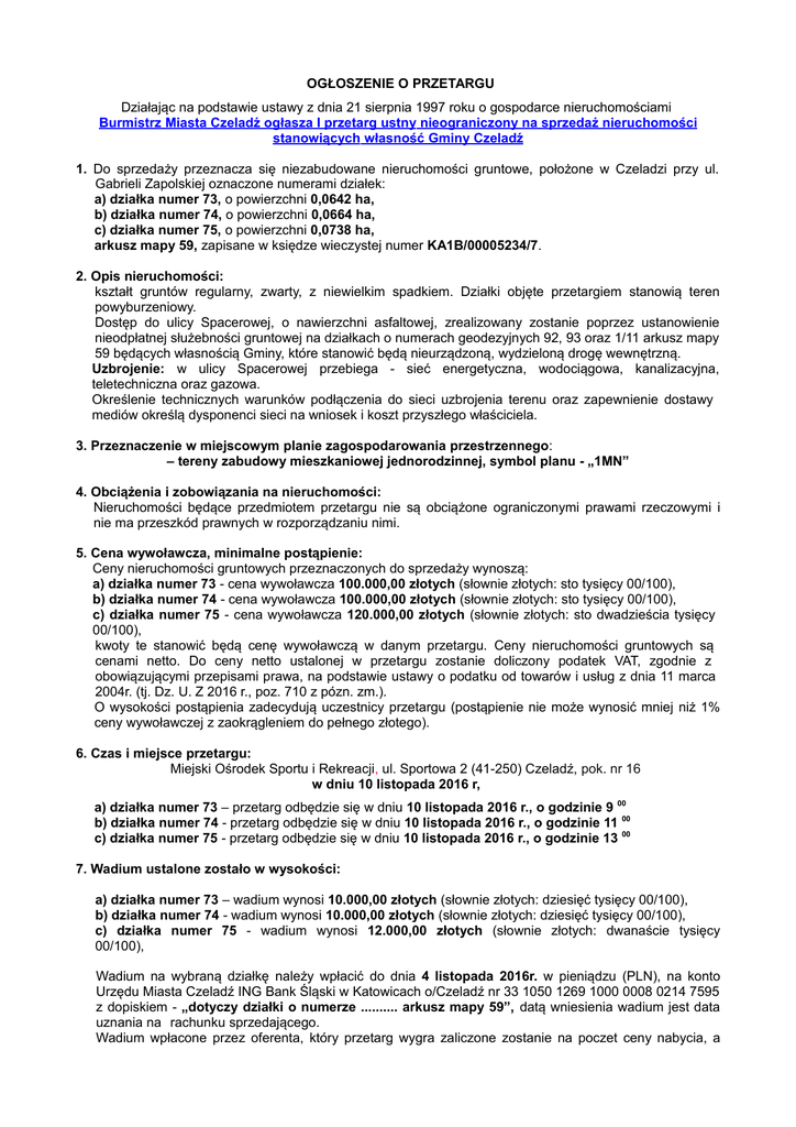 OGŁOSZENIE O PRZETARGU Działając na podstawie ustawy z dnia 21 sierpnia 1997 roku o gospodarce nieruchomościami Burmistrz Miasta Czeladź ogłasza I przetarg ustny nieograniczony na sprzedaż nieruchomości stanowiących własność Gminy Czeladź 1. Do sprzedaży przeznacza się niezabudowane nieruchomości gruntowe, położone w Czeladzi przy ul. Gabrieli Zapolskiej oznaczone numerami działek: a) działka numer 73, o powierzchni 0,0642 ha, b) działka numer 74, o powierzchni 0,0664 ha, c) działka numer 75, o powierzchni 0,0738 ha, arkusz mapy 59, zapisane w księdze wieczystej numer KA1B/00005234/7. 2. Opis nieruchomości: kształt gruntów regularny, zwarty, z niewielkim spadkiem. Działki objęte przetargiem stanowią teren powyburzeniowy. Dostęp do ulicy Spacerowej, o nawierzchni asfaltowej, zrealizowany zostanie poprzez ustanowienie nieodpłatnej służebności gruntowej na działkach o numerach geodezyjnych 92, 93 oraz 1/11 arkusz mapy 59 będących własnością Gminy, które stanowić będą nieurządzoną, wydzieloną drogę wewnętrzną. Uzbrojenie: w ulicy Spacerowej przebiega - sieć energetyczna, wodociągowa, kanalizacyjna, teletechniczna oraz gazowa. Określenie technicznych warunków podłączenia do sieci uzbrojenia terenu oraz zapewnienie dostawy mediów określą dysponenci sieci na wniosek i koszt przyszłego właściciela. 3. Przeznaczenie w miejscowym planie zagospodarowania przestrzennego: – tereny zabudowy mieszkaniowej jednorodzinnej, symbol planu - „1MN” 4. Obciążenia i zobowiązania na nieruchomości: Nieruchomości będące przedmiotem przetargu nie są obciążone ograniczonymi prawami rzeczowymi i nie ma przeszkód prawnych w rozporządzaniu nimi. 5. Cena wywoławcza, minimalne postąpienie: Ceny nieruchomości gruntowych przeznaczonych do sprzedaży wynoszą: a) działka numer 73 - cena wywoławcza 100.000,00 złotych (słownie złotych: sto tysięcy 00/100), b) działka numer 74 - cena wywoławcza 100.000,00 złotych (słownie złotych: sto tysięcy 00/100), c) działka numer 75 - cena wywoławcza 120.000,00 złotych (słownie złotych: sto dwadzieścia tysięcy 00/100), kwoty te stanowić będą cenę wywoławczą w danym przetargu. Ceny nieruchomości gruntowych są cenami netto. Do ceny netto ustalonej w przetargu zostanie doliczony podatek VAT, zgodnie z obowiązującymi przepisami prawa, na podstawie ustawy o podatku od towarów i usług z dnia 11 marca 2004r. (tj. Dz. U. Z 2016 r., poz. 710 z pózn. zm.). O wysokości postąpienia zadecydują uczestnicy przetargu (postąpienie nie może wynosić mniej niż 1% ceny wywoławczej z zaokrągleniem do pełnego złotego). 6. Czas i miejsce przetargu: Miejski Ośrodek Sportu i Rekreacji, ul. Sportowa 2 (41-250) Czeladź, pok. nr 16 w dniu 10 listopada 2016 r, a) działka numer 73 – przetarg odbędzie się w dniu 10 listopada 2016 r., o godzinie 9 00 b) działka numer 74 - przetarg odbędzie się w dniu 10 listopada 2016 r., o godzinie 11 00 c) działka numer 75 - przetarg odbędzie się w dniu 10 listopada 2016 r., o godzinie 13 00 7. Wadium ustalone zostało w wysokości: a) działka numer 73 – wadium wynosi 10.000,00 złotych (słownie złotych: dziesięć tysięcy 00/100), b) działka numer 74 - wadium wynosi 10.000,00 złotych (słownie złotych: dziesięć tysięcy 00/100), c) działka numer 75 - wadium wynosi 12.000,00 złotych (słownie złotych: dwanaście tysięcy 00/100), Wadium na wybraną działkę należy wpłacić do dnia 4 listopada 2016r. w pieniądzu (PLN), na konto Urzędu Miasta Czeladź ING Bank Śląski w Katowicach o/Czeladź nr 33 1050 1269 1000 0008 0214 7595 z dopiskiem - „dotyczy działki o numerze .......... arkusz mapy 59”, datą wniesienia wadium jest data uznania na rachunku sprzedającego. Wadium wpłacone przez oferenta, który przetarg wygra zaliczone zostanie na poczet ceny nabycia, a w przypadku uchylania się od zawarcia umowy notarialnej wniesione wadium przepada na rzecz gminy. Wadium wpłacone przez pozostałych uczestników przetargu zostanie zwrócone w terminie do 3 dni od dnia rozstrzygnięcia przetargu na wskazane konto bankowe. 8. Warunki uczestnictwa w przetargu: • wniesienie wadium w wymaganym terminie i wysokości, • posiadanie dowodu tożsamości w przypadku osób fizycznych, • w przypadku osób fizycznych zamierzających nabyć nieruchomość w związku z prowadzoną działalnością gospodarczą – aktualny wydruk z Centralnej Ewidencji i Informacji o Działalności Gospodarczej ( CEIDG ), • w przypadku osób prawnych oraz innych jednostek organizacyjnych nie posiadających osobowości prawnej, a podlegających rejestracji - aktualnego wypisu z rejestru, właściwych pełnomocnictw, dowodów tożsamości osób reprezentujących podmiot, • jeżeli uczestnikiem przetargu jest konsorcjum, holding lub grupa podmiotów gospodarczych nie będących osobą prawną w rozumieniu przepisów prawa polskiego, to wówczas za uczestnika przetargu będzie się uważać osobę wskazaną przez pozostałych członków konsorcjum, holdingu lub grupy podmiotów gospodarczych stosownymi pełnomocnictwami i wpłacającą w imieniu wszystkich wadium, • w przypadku ustanowienia pełnomocnictwa przez osobę fizyczną lub prawną, wymagane jest notarialnie poświadczone pełnomocnictwo, • w przypadku przedsiębiorstw występujących wspólnie – m.in. spółki cywilne, konsorcja – wymagane jest zaświadczenie o wpisie do ewidencji działalności gospodarczej w formie aktualnego wydruku z Centralnej Ewidencji i Informacji o Działalności Gospodarczej ( CEIDG ) lub odpis z właściwego rejestru każdego ze wspólników, • w przypadku nabywania nieruchomości przez jednego ze współmałżonków wymagana jest zgoda drugiego współmałżonka na nabycie wylicytowanej nieruchomości z majątku odrębnego (art. 37§1 pkt 1 ustawy z 25 lutego 1964r. Kodeks rodzinny i opiekuńczy) • przy zakupie nieruchomości przez osobę będącą cudzoziemce