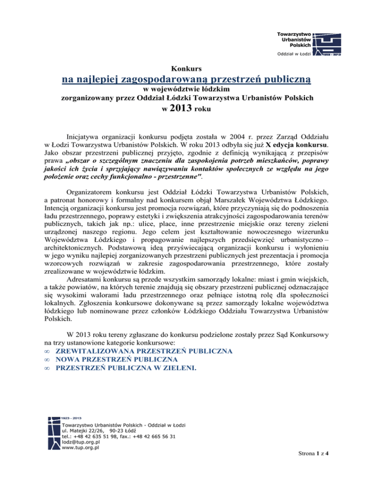 Towarzystwo Urbanistów Polskich Oddział w Łodzi Konkurs na najlepiej zagospodarowaną przestrzeń publiczną w województwie łódzkim zorganizowany przez Oddział Łódzki Towarzystwa Urbanistów Polskich w 2013 roku Inicjatywa organizacji konkursu podjęta została w 2004 r. przez Zarząd Oddziału w Łodzi Towarzystwa Urbanistów Polskich. W roku 2013 odbyła się juŜ X edycja konkursu. Jako obszar przestrzeni publicznej przyjęto, zgodnie z definicją wynikającą z przepisów prawa „obszar o szczególnym znaczeniu dla zaspokojenia potrzeb mieszkańców, poprawy jakości ich Ŝycia i sprzyjający nawiązywaniu kontaktów społecznych ze względu na jego połoŜenie oraz cechy funkcjonalno - przestrzenne". Organizatorem konkursu jest Oddział Łódzki Towarzystwa Urbanistów Polskich, a patronat honorowy i formalny nad konkursem objął Marszałek Województwa Łódzkiego. Intencją organizacji konkursu jest promocja rozwiązań, które przyczyniają się do podnoszenia ładu przestrzennego, poprawy estetyki i zwiększenia atrakcyjności zagospodarowania terenów publicznych, takich jak np.: ulice, place, inne przestrzenie miejskie oraz tereny zieleni urządzonej naszego regionu. Jego celem jest kształtowanie nowoczesnego wizerunku Województwa Łódzkiego i propagowanie najlepszych przedsięwzięć urbanistyczno – architektonicznych. Podstawową ideą przyświecającą organizacji konkursu i wyłonieniu w jego wyniku najlepiej zorganizowanych przestrzeni publicznych jest prezentacja i promocja wzorcowych rozwiązań w zakresie zagospodarowania przestrzennego, które zostały zrealizowane w województwie łódzkim. Adresatami konkursu są przede wszystkim samorządy lokalne: miast i gmin wiejskich, a takŜe powiatów, na których terenie znajdują się obszary przestrzeni publicznej odznaczające się wysokimi walorami ładu przestrzennego oraz pełniące istotną rolę dla społeczności lokalnych. Zgłoszenia konkursowe dokonywane są przez samorządy lokalne województwa łódzkiego lub nominowane przez członków Łódzkiego Oddziału Towarzystwa Urbanistów Polskich. W 2013 roku tereny zgłaszane do konkursu podzielone zostały przez Sąd Konkursowy na trzy ustanowione kategorie konkursowe: • ZREWITALIZOWANA PRZESTRZEŃ PUBLICZNA • NOWA PRZESTRZEŃ PUBLICZNA • PRZESTRZEŃ PUBLICZNA W ZIELENI. Towarzystwo Urbanistów Polskich - Oddział w Łodzi ul. Matejki 22/26, 90-23 Łódź tel.: +48 42 635 51 98, fax.: +48 42 665 56 31 [email protected] www.tup.org.pl Strona 1 z 4 Towarzystwo Urbanistów Polskich Oddział w Łodzi Podstawą zakwalifikowania zgłoszonego obszaru do konkursu był jego publiczny charakter – a więc zagwarantowany powszechny, ogólnospołeczny dostęp do wskazanego obszaru, co nie wykluczało terenów stanowiących własność prywatną lub własność instytucji zachowujących publiczny charakter. Drugim warunkiem było połoŜenie typowanej przestrzeni w granicach administracyjnych województwa łódzkiego. Dnia 16 grudnia 2013 r. odbyło się posiedzenie Sądu Konkursowego. W jego skład weszli skład: • ElŜbieta Muszyńska – prezes Zarządu TUP Oddział w Łodzi • GraŜyna Ojrzyńska – wiceprezes Zarządu TUP Oddział w Łodzi • Aneta Tomczak - sekretarz Zarządu TUP Oddział w Łodzi • Marek Kolejwa – członek Zarządu TUP Oddział w Łodzi • Mirosława Adamkiewicz – członek Zarządu TUP Oddział w Łodzi • Danuta Mirowska-Walas – członek Zarządu TUP Oddział w Łodzi • Ewa Boryczka - członek Zarządu TUP Oddział w Łodzi Do konkursu w terminie do dnia 15 grudnia 2013 roku ze strony samorządów lokalnych wpłynęło trzynaście zgłoszeń pretendujących do nagrody na najlepiej zagospodarowaną przestrzeń publiczną w województwie łódzkim. Udział w konkursie wzięły następujące obszary przestrzeni publicznych: 1. ŚcieŜka pieszo - rowerowa z placem zabaw przy Zalewie Drzewickim - zgłaszający Miasto i Gmina w Drzewicy; 2. Plac 11 Listopada w Łasku - zgłaszający Gmina Łask; 3. Park Miejski w Rawie Mazowieckiej - zgłaszający Miasto Rawa Mazowiecka; 4. Zamek Kazimierza Wielkiego w Inowłodzu z otoczeniem - zgłaszający Gmina Inowłódz; 5. Plac Jana Pawła II - zgłaszający Miasto Ozorków; 6. Zagroda Młynarska - zgłaszający Gmina Uniejów; 7. Obszar przestrzeni dworca PKP, PKS w Radomsku - zgłaszający Miasto Radomsko; 8. Zagospodarowanie centralnej części Uzdrowiska Uniejów poprzez rozbudowę i restaurację obiektów kompleksu termalno - basenowego Termy Uniejów zgłaszający Gmina Uniejów; 9. Plac Jagiełły w Wolborzu - zgłaszający Gmina Wolbórz; 10. Miejski Ośrodek Sportu i Rekreacji im. W. Smolarka w Aleksandrowie Łódzkim zgłaszający Miasto Aleksandrów Łódzki; 11. Plac Wolności w Głownie - zgłaszający Miasto Głowno; 12. Targowisko stałe "Mój Rynek" w JeŜowie - zgłaszający Gmina JeŜów; 13. Gminno Parkowe Centrum Kultury i Ekologii w Plichtowie - zgłaszający Gmina Nowosolna. Towarzystwo Urbanistów Polskich - Oddział w Łodzi ul. Matejki 22/26, 90-23 Łódź tel.: +48 42 635 51 98, fax.: +48 42 665 56 31 [email protected] www.tup.org.pl Strona 2 z 4 Towarzystwo Urbanistów Polskich Oddział w Łodzi Po zapoznaniu się z dostarczonymi przez zgłaszające samorządy materiałami i prezentacjami oraz po długotrwałej dyskusji nad jakością zagospodarowania przestrzennego nominowanych terenów Komisja Konkursowa przyznała honorowe nagrody Oddziału Łódzkiego Towarzystwa Urbanistów Polskich w trzech róŜnych kategoriach. W kategorii ZREWITALIZOWANA PRZESTRZEŃ PUBLICZNA Nagrodę otrzymał Plac 11 Listopada w Łasku. W kategorii NOWA PRZESTRZEŃ PUBLICZNA Nagrodę otrzymała ŚcieŜka pieszo - rowerowa z placem zabaw przy Zalewie Drzewickim w Drzewicy. W kategorii PRZESTRZEŃ W ZIELENI Nagrodę otrzymał Park Miejski w Rawie Mazowieckiej. Werdykt Komisja Konkursowa uzasadniła następująco: Plac 11 Listopada w Łasku Nagrodę przyznano za zrewitalizowanie 