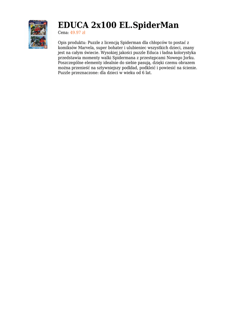 EDUCA 2x100 EL.SpiderMan Cena: 49.97 zł Opis produktu: Puzzle z licencją Spiderman dla chłopców to postać z komiksów Marvela, super bohater i ulubieniec wszystkich dzieci, znany jest na całym świecie. Wysokiej jakości puzzle Educa i ładna kolorystyka przedstawia momenty walki Spidermana z przestępcami Nowego Jorku. Poszczególne elementy idealnie do siebie pasują, dzięki czemu obrazem można przenieść na sztywniejszy podkład, podkleić i powiesić na ścienie. Puzzle przeznaczone: dla dzieci w wieku od 6 lat.