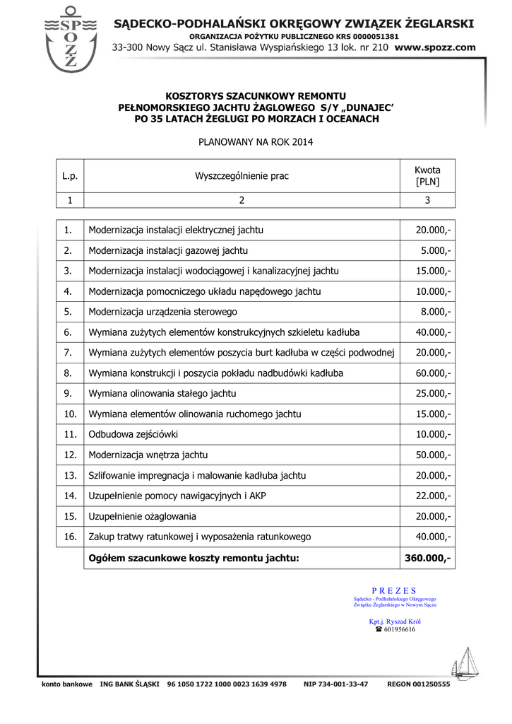 KOSZTORYS SZACUNKOWY REMONTU PEŁNOMORSKIEGO JACHTU ŻAGLOWEGO S/Y „DUNAJEC’ PO 35 LATACH ŻEGLUGI PO MORZACH I OCEANACH PLANOWANY NA ROK 2014 L.p. Wyszczególnienie prac Kwota [PLN] 1 2 3 1. Modernizacja instalacji elektrycznej jachtu 2. Modernizacja instalacji gazowej jachtu 3. Modernizacja instalacji wodociągowej i kanalizacyjnej jachtu 15.000,- 4. Modernizacja pomocniczego układu napędowego jachtu 10.000,- 5. Modernizacja urządzenia sterowego 6. Wymiana zużytych elementów konstrukcyjnych szkieletu kadłuba 40.000,- 7. Wymiana zużytych elementów poszycia burt kadłuba w części podwodnej 20.000,- 8. Wymiana konstrukcji i poszycia pokładu nadbudówki kadłuba 60.000,- 9. Wymiana olinowania stałego jachtu 25.000,- 10. Wymiana elementów olinowania ruchomego jachtu 15.000,- 11. Odbudowa zejściówki 10.000,- 12. Modernizacja wnętrza jachtu 50.000,- 13. Szlifowanie impregnacja i malowanie kadłuba jachtu 20.000,- 14. Uzupełnienie pomocy nawigacyjnych i AKP 22.000,- 15. Uzupełnienie ożaglowania 20.000,- 16. Zakup tratwy ratunkowej i wyposażenia ratunkowego 40.000,- Ogółem szacunkowe koszty remontu jachtu: 20.000,5.000,- 8.000,- 360.000,- PREZES Sądecko - Podhalańskiego Okręgowego Związku Żeglarskiego w Nowym Sączu Kpt.j. Ryszad Król 601956616