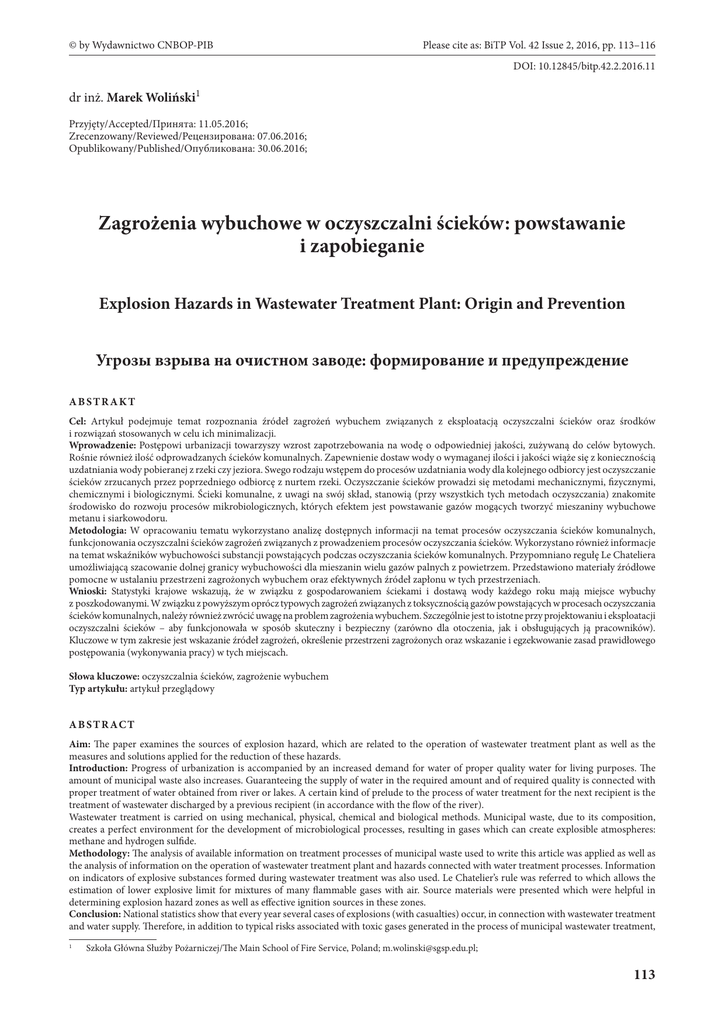 © by Wydawnictwo CNBOP-PIB Please cite as: BiTP Vol. 42 Issue 2, 2016, pp. 113–116 DOI: 10.12845/bitp.42.2.2016.11 dr inż. Marek Woliński1 Przyjęty/Accepted/Принята: 11.05.2016; Zrecenzowany/Reviewed/Рецензирована: 07.06.2016; Opublikowany/Published/Опубликована: 30.06.2016; Zagrożenia wybuchowe w oczyszczalni ścieków: powstawanie i zapobieganie Explosion Hazards in Wastewater Treatment Plant: Origin and Prevention Угрозы взрыва на очистном заводе: формирование и предупреждение ABSTRAKT Cel: Artykuł podejmuje temat rozpoznania źródeł zagrożeń wybuchem związanych z eksploatacją oczyszczalni ścieków oraz środków i rozwiązań stosowanych w celu ich minimalizacji. Wprowadzenie: Postępowi urbanizacji towarzyszy wzrost zapotrzebowania na wodę o odpowiedniej jakości, zużywaną do celów bytowych. Rośnie również ilość odprowadzanych ścieków komunalnych. Zapewnienie dostaw wody o wymaganej ilości i jakości wiąże się z koniecznością uzdatniania wody pobieranej z rzeki czy jeziora. Swego rodzaju wstępem do procesów uzdatniania wody dla kolejnego odbiorcy jest oczyszczanie ścieków zrzucanych przez poprzedniego odbiorcę z nurtem rzeki. Oczyszczanie ścieków prowadzi się metodami mechanicznymi, fizycznymi, chemicznymi i biologicznymi. Ścieki komunalne, z uwagi na swój skład, stanowią (przy wszystkich tych metodach oczyszczania) znakomite środowisko do rozwoju procesów mikrobiologicznych, których efektem jest powstawanie gazów mogących tworzyć mieszaniny wybuchowe metanu i siarkowodoru. Metodologia: W opracowaniu tematu wykorzystano analizę dostępnych informacji na temat procesów oczyszczania ścieków komunalnych, funkcjonowania oczyszczalni ścieków zagrożeń związanych z prowadzeniem procesów oczyszczania ścieków. Wykorzystano również informacje na temat wskaźników wybuchowości substancji powstających podczas oczyszczania ścieków komunalnych. Przypomniano regułę Le Chateliera umożliwiającą szacowanie dolnej granicy wybuchowości dla mieszanin wielu gazów palnych z powietrzem. Przedstawiono materiały źródłowe pomocne w ustalaniu przestrzeni zagrożonych wybuchem oraz efektywnych źródeł zapłonu w tych przestrzeniach. Wnioski: Statystyki krajowe wskazują, że w związku z gospodarowaniem ściekami i dostawą wody każdego roku mają miejsce wybuchy z poszkodowanymi. W związku z powyższym oprócz typowych zagrożeń związanych z toksycznością gazów powstających w procesach oczyszczania ścieków komunalnych, należy również zwrócić uwagę na problem zagrożenia wybuchem. Szczególnie jest to istotne przy projektowaniu i eksploatacji oczyszczalni ścieków – aby funkcjonowała w sposób skuteczny i bezpieczny (zarówno dla otoczenia, jak i obsługujących ją pracowników). Kluczowe w tym zakresie jest wskazanie źródeł zagrożeń, określenie przestrzeni zagrożonych oraz wskazanie i egzekwowanie zasad prawidłowego postępowania (wykonywania pracy) w tych miejscach. Słowa kluczowe: oczyszczalnia ścieków, zagrożenie wybuchem Typ artykułu: artykuł przeglądowy A B S T R AC T Aim: The paper examines the sources of explosion hazard, which are related to the operation of wastewater treatment plant as well as the measures and solutions applied for the reduction of these hazards. Introduction: Progress of urbanization is accompanied by an increased demand for water of proper quality water for living purposes. The amount of municipal waste also increases. Guaranteeing the supply of water in the required amount and of required quality is connected with proper treatment of water obtained from river or lakes. A certain kind of prelude to the process of water treatment for the next recipient is the treatment of wastewater discharged by a previous recipient (in accordance with the flow of the river). Wastewater treatment is carried on using mechanical, physical, chemical and biological methods. Municipal waste, due to its composition, creates a perfect environment for the development of microbiological processes, resulting in gases which can create explosible atmospheres: methane and hydrogen sulfide. Methodology: The analysis of available information on treatment processes of municipal waste used to write this article was applied as well as the analysis of information on the operation of wastewater treatment plant and hazards connected with water treatment processes. Information on indicators of explosive substances formed during wastewater treatment was also used. Le Chatelier’s rule was referred to which allows the estimation of lower explosive limit for mixtures of many flammable gases with air. Source materials were presented which were helpful in determining explosion hazard zones as well as effective ignition sources in these zones. Conclusion: National statistics show that every year several cases of explosions (with casualties) occur, in connection with wastewater treatment and water supply. Therefore, in addition to typical risks associated with toxic gases generated in the process of municipal wastewater treatment, 1 Szkoła Główna Służby Pożarniczej/The Main School of Fire Service, Poland; [email protected]; 113 BADANIA I ROZWÓJ BiTP Vol. 42 Issue 2, 2016, pp. 113–116 DOI:10.12845/bitp.42.2.2016.11 also the problem of hazardous areas must be taken into consideration when designing and operating wastewater treatment plants in order for them to function effectively and safely (both for the environment and for the personnel). A key factor in this matter is to identify sources of danger, determine endangered areas, indicate and properly enforce rules of conduct (work) in endangered areas. Keywords: wastewater treatment plant, explosion hazard Type of article: review article А Н Н О ТА Ц И Я Цель: Статья затрагивает вопрос изучения источников урго