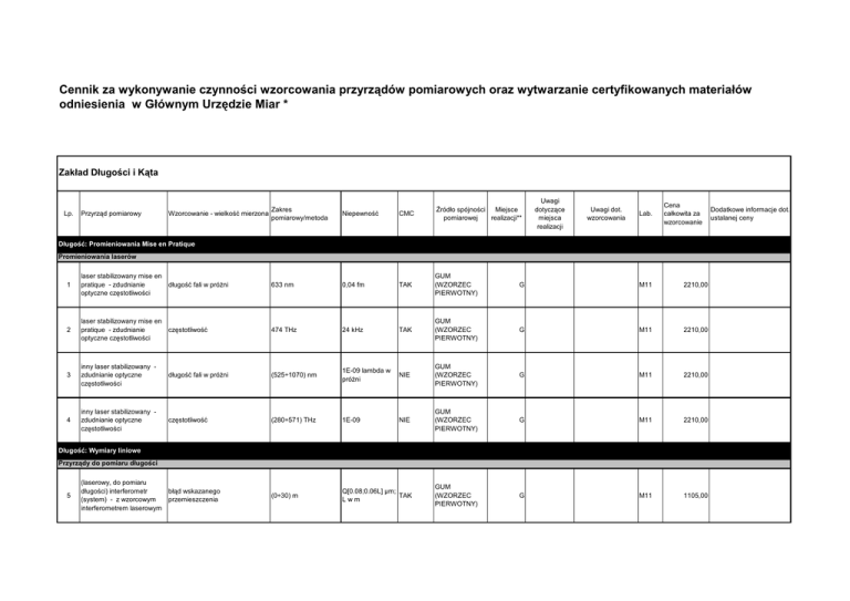 Cennik za wykonywanie czynności wzorcowania przyrządów pomiarowych oraz wytwarzanie certyfikowanych materiałów odniesienia w Głównym Urzędzie Miar * Zakład Długości i Kąta Lp. Przyrząd pomiarowy Wzorcowanie - wielkość mierzona Zakres pomiarowy/metoda Niepewność CMC Źródło spójności Miejsce pomiarowej realizacji** Uwagi dotyczące miejsca realizacji Uwagi dot. wzorcowania Lab. Cena całkowita za wzorcowanie Długość: Promieniowania Mise en Pratique Promieniowania laserów 1 laser stabilizowany mise en pratique - zdudnianie optyczne częstotliwości długość fali w próżni 633 nm 0,04 fm TAK GUM (WZORZEC PIERWOTNY) G M11 2210,00 2 laser stabilizowany mise en pratique - zdudnianie optyczne częstotliwości częstotliwość 474 THz 24 kHz TAK GUM (WZORZEC PIERWOTNY) G M11 2210,00 3 inny laser stabilizowany zdudnianie optyczne częstotliwości długość fali w próżni (525÷1070) nm 1E-09 lambda w próżni NIE GUM (WZORZEC PIERWOTNY) G M11 2210,00 4 inny laser stabilizowany zdudnianie optyczne częstotliwości częstotliwość (280÷571) THz 1E-09 NIE GUM (WZORZEC PIERWOTNY) G M11 2210,00 błąd wskazanego przemieszczenia (0÷30) m Q[0.08;0.06L] µm; TAK Lwm GUM (WZORZEC PIERWOTNY) G M11 1105,00 Długość: Wymiary liniowe Przyrządy do pomiaru długości 5 (laserowy, do pomiaru długości) interferometr (system) - z wzorcowym interferometrem laserowym Dodatkowe informacje dot. ustalanej ceny 6 (laserowy, do pomiaru długości) interferometr (refraktometr) - z wzorcowym barometrem, higrometrem i miernikiem temperatury 7 przyrząd EDM (dalmierz laserowy) - z interferometrem laserowym 8 9 kompensacja długości fali 1.00000209 ÷ 1.00027601 1,5E-07n TAK GUM (WZORZEC PIERWOTNY) G M11 780,00 G M11 cena za 1 odcinek pomiarowy; za każdy 195,00 kolejny odcinek pomiarowy 0,5 × stawka za 1 rbg (0÷50) m 0,7 mm NIE GUM (WZORZEC PIERWOTNY) maszyna pomiarowa 1-D do błąd wskazanego [wymiaru; pomiaru długości - z przemieszczenia] interferometrem laserowym (0÷3) m Q[1.06; 0.93L] µm; L w m TAK GUM (WZORZEC PIERWOTNY) P M11 2600,00 do podanej ceny należy doliczyć koszty delegacji komparator do wzorcowania płytek wzorcowych - z błąd wskazanego kontrolnymi płytkami przemieszczenia wzorcowymi ±20 µm 12 nm NIE GUM (WZORZEC PIERWOTNY) P M11 1300,00 do podanej ceny należy doliczyć koszty delegacji błąd wskazanej odległości Wzorce końcowe 10 płytka wzorcowa interferencyjnie (reszty ułamkowe, lampa Cd) długość środkowa (0.5÷100) mm Q[34; 0.44L] nm; L w mm TAK GUM (WZORZEC PIERWOTNY) G M11 130,00 11 płytka wzorcowa interferencyjnie (reszty ułamkowe, lasery) długość środkowa (0.5÷305) mm Q[20.4; 0.2L] nm; NIE L w mm GUM (WZORZEC PIERWOTNY) G M11 130,00 12 płytka wzorcowa interferencyjnie odchylenie od płaskości (0÷5,7) µm 17 nm PTB G M11 65,00 13 płytka wzorcowa - z komparatorem dwuczujnikowym długość środkowa (0.5÷100) mm Q[49; 0.6L] nm; L TAK w mm GUM (WZORZEC PIERWOTNY) G M11 26,00 14 płytka wzorcowa - z komparatorem dwuczujnikowym 19 nm GUM (WZORZEC PIERWOTNY) M11 65,00 zmienność długości (0÷350) nm NIE NIE G dla płytek wzorcowych o długości (0.5÷100) mm dla płytek wzorcowych o długości (0.5÷100) mm 15 długa płytka wzorcowa interferencyjnie, bezdotykowo (125÷500) mm Q[0.05; 0.47L] µm; L w m NIE GUM (WZORZEC PIERWOTNY) G M11 650,00 16 długa płytka wzorcowa interferencyjnie, dotykowo w długość środkowa pozycji poziomej (z płytką 10 mm) (125÷3000) mm Q[112; 0.59L] nm; TAK L w mm GUM (WZORZEC PIERWOTNY) G M11 650,00 17 długa płytka wzorcowa porównawczo, dotykowo w pozycji poziomej długość środkowa (125÷1000) mm Q[119; 0.39L] nm; NIE L w mm GUM (WZORZEC PIERWOTNY) G M11 650,00 18 długa płytka wzorcowa - z komparatorem dwuczujnikowym w pozycji pionowej zmienność długości (0÷600) nm 19 nm NIE GUM (WZORZEC PIERWOTNY) G M11 65,00 19 wzorzec nastawczy do mikrometrów interferencyjnie, dotykowo w długość środkowa pozycji poziomej (z płytką 10 mm) (125÷3000) mm Q[112; 0.59L] nm; TAK L w mm GUM (WZORZEC PIERWOTNY) G M11 455,00 20 długa płytka wzorcowa interferencyjnie odchylenie od płaskości (0÷5,7) µm 17 nm PTB G dla płytek wzorcowych o M11 długości (125÷1000) mm 65,00 21 wzorzec schodkowy - za pomocą maszyny WMP odległość powierzchni do 700 mm Q[0.5;0,9L] µm, L TAK wm GUM (WZORZEC PIERWOTNY) G M13 650,00 (1÷500) mm Q[198; 0.41L] nm; TAK L w mm GUM (WZORZEC PIERWOTNY) M11 cena za 10 odcinków pomiarowych; za każdy 650,00 kolejny odcinek pomiarowy 0,1 × stawka za 1 rbg 198 nm GUM (WZORZEC PIERWOTNY) M11 cena za 10 odcinków pomiarowych; za każdy 390,00 kolejny odcinek pomiarowy 0,1 × stawka za 1 rbg długość środkowa NIE dla płytek wzorcowych o długości (125÷500) mm cena za wzorzec chodkowy do 300 mm; za każde kolejne 100 mm 1,75 x stawka za rbg Wzorce kreskowe 22 wzorzec kreskowy dokładny - z interferometrem odległość kresek laserowym 23 wzorzec kreskowy mikroskopowy - z interferometrem laserowym odległość kresek (0,01÷10) mm NIE G G 24 przymiar wstęgowy - z interferometrem laserowym 25 przymiar sztywny - z interferometrem laserowym 26 przymiar półsztywny - z interferometrem laserowym 27 przymiar półsztywny do pomiaru średnicy i obwodu odległość kresek z interferometrem laserowym odległość kresek odległość kresek odległość kresek (0÷50) m Q[20; 5.5L] µm; L TAK wm GUM (WZORZEC PIERWOTNY) (0÷5) m Q[20; 5.0L] µm; L NIE wm GUM (WZORZEC PIERWOTNY) (0÷5) m Q[20; 5.0L] µm; L NIE wm GUM (WZORZEC PIERWOTNY) (0÷5) m Q[20; 5.0L] µm; L NIE wm GUM (WZORZEC PIERWOTNY) M11 cena za 1 odcinek pomiarowy; za każdy 273,00 kolejny odcinek pomiarowy 0,1 × stawka za 1 rbg M11 cena za 1 odcinek pomiarowy; za każdy 143,00 kolejny odcinek pomiarowy 0,1 × stawka za 1 rbg M11 cena za 1 odcinek pomiarowy; za każdy 143,00 kolejny odcinek pomiarowy 0,1 × stawka za 1 rbg G M11 cena za 1 odcinek pomiarowy; za każdy 143,00 kolejny odcinek pomiarowy 0,1 × stawka za 1 r