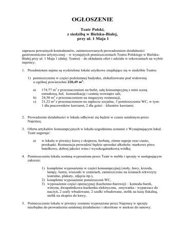 OGŁOSZENIE Teatr Polski, z siedzibą w Bielsku-Białej, przy ul. 1 Maja 1 zaprasza poważnych kontrahentów, zainteresowanych prowadzeniem działalności gastronomiczno-artystycznej – w wynajętych pomieszczeniach Teatru Polskiego w BielskuBiałej przy ul. 1 Maja 1 (dalej: Teatru) – do składania ofert i udziału w rokowaniach na wybór najemcy. 1. Przedmiotem najmu są wydzielone lokale użytkowe znajdujące się w siedzibie Teatru: 1) pomieszczenia w części podziemnej budynku, zlokalizowane pod widownią o ogólnej powierzchni 220,49 m2: a) b) c) 174,77 m2 z przeznaczeniem na bufet, salę konsumpcyjną z mini sceną estradową, hol, komunikację i szatnię wewnątrz sali, 24,50 m2 z przeznaczeniem na magazyny restauracji, 21,22 m2 z przeznaczeniem na zaplecze socjalne, 3 pomieszczenia WC, w tym: 1 dla pracowników kawiarni, 2 dla gości – klientów kawiarni; 2. Prowadzenie działalności w lokalu odbywać się będzie w czasie ustalonym przez Najemcę. 3. Oferta artykułów konsumpcyjnych w lokalu uzgodniona zostanie z Wynajmującym lokal. Teatr sugeruje: a) w lokalu w piwnicy kawę z ekspresu, herbatę, zimne napoje oraz ciasto, przekąski. Restauracja prowadzić będzie sprzedaż alkoholu: markowe piwo butelkowe, dobrej jakości wino i wysokogatunkową wódkę; 4. Pomieszczenia lokalu zostaną wyposażone przez Teatr w meble i sprzęty w następującym zakresie: 1) kompletne wyposażenie w części konsumpcyjnej (stoły, ławy, krzesła, lampy, lustra, wieszaki w szatniach, zamieszczone na ścianach rekwizyty teatralne, plakaty, zdjęcia itp.), 2) kompletne wyposażenie pomieszczeń WC, 3) wyposażenie części operacyjnej (kuchenno-barowej) – komoda-barek, witryna, dwupalnikowa kuchenka elektryczna, zmywarka - wyparzacz do naczyń, 2 szafy wbudowane, 2 szafki wbudowane, stolik na kasę fiskalną, stolik na ekspres do kawy, 5. Pomieszczenie lokalu w piwnicy zostanie wyposażone przez Najemcę w sprzęty niezbędne do prowadzenia ustalonej działalności i określone w aneksie do umowy. 6. Do obowiązków Wynajmującego należy, w szczególności: a) b) c) d) zapewnienie sprawnej sieci elektrycznej, ciepłowniczej, wodno-kanalizacyjnej, oświetlenie przedmiotu najmu, ogrzewanie budynku w okresie grzewczym, konserwacja i remonty dotyczące zewnętrznej i wewnętrznej substancji budynku. 7. Do obowiązków Najemcy należy, w szczególności: a) b) c) d) e) sprzątanie wynajmowanych powierzchni, wywóz nieczystości stałych i odpadów technologicznych, spełnienie warunków sanitarnych zgodnych z obowiązującymi przepisami, terminowe regulowanie kosztów zużycia energii elektrycznej zgodnie ze zużyciem na podstawie zainstalowanego przez Teatr podlicznika, terminowe regulowanie zobowiązań z tytułu czynszu za wynajem lokalu 8. Oferta na najem lokalu powinna zawierać: a) imię i nazwisko oferenta (nazwę firmy), dokładny adres, datę sporządzenia oferty, b) aktualny odpis z właściwego rejestru albo aktualne zaświadczenie o wpisie do ewidencji działalności gospodarczej, c) kopię potwierdzenia zgłoszenia rejestracyjnego podatnika podatku od towarów i usług oraz podatku akcyzowego d) zaświadczenie o numerze identyfikacyjnym REGON, e) dane osobowe osób upoważnionych do składania oświadczeń woli, f) pełnomocnictwo (w przypadku działania pełnomocnika), g) propozycję stawki czynszu (netto) za jeden metr kwadratowy powierzchni lokalu, h) oświadczenie o posiadanym doświadczeniu zawodowym w gastronomii oraz ewentualnych referencjach i osiągnięciach w prowadzeniu dotychczasowej działalności gastronomicznej (Oferent powinien się wykazać co najmniej 3letnim doświadczeniem w działalności gastronomicznej), i) propozycję oferty handlowej z przykładowymi cenami, j) informacje o koncie bankowym Oferenta, na które ma być zwrócone wadium, k) zaświadczenie z ZUS o niezaleganiu w opłacaniu składek (aktualne) l) zaświadczenie z Urzędu Skarbowego o niezaleganiu w podatkach (aktualne) m) propozycje innej niż gastronomiczna działalności 9. Warunkiem przystąpienia do rokowań jest dokonanie wpłaty wadium w wysokości 3.000,- zł na konto Teatru Polskiego, ul 1 Maja 1, 43-300 Bielsko-Biała w ING Bank Śląski O/Bielsko-Biała nr 20 10501070 1000 0001 0004 1284, najpóźniej do dnia 30.10.2014 r., a dowód wpłaty należy przedstawić Komisji ds. rokowań w dniu rokowań. Wadium nabywcy zostanie zaliczone na poczet ceny najmu, a pozostałym uczestnikom przelane na ich konta niezwłocznie po odwołaniu lub zamknięciu rokowań, jednak nie później niż przed upływem 3 dni od dnia odwołania lub zamknięcia rokowań. W przypadku uchylenia się od zawarcia umowy Oferent, który wygra rokowania traci wadium na rzecz Teatru. 2 10. Oferty dotyczące rokowań należy składać w zamkniętej kopercie z odpowiednim dopiskiem: „rokowania na wynajem lokalu gastronomiczno-handlowego” w sekretariacie administracji przy ul. Kołłątaja 4, w terminie do dnia 30.10.2014 r. do godz. 1000. 11. Komisyjne otwarcie ofert w obecności Oferentów nastąpi w dniu 30.10.2014 r. w siedzibie Teatru – w świetlicy, o godz. 1300. 12. Teatr zastrzega sobie prawo swobodnego wyboru ofert i nieprzyjęcia oferty bez podania uzasadnienia i bez podania przyczyny, że rokowania nie dały rezultatu. 13. Wybrany Oferent zostanie zawiadomiony o wyniku rokowań, na piśmie w terminie do 7.11.2014 r. 14. Zabezpieczenie ewentualnych przyszłych roszczeń Wynajmującego stanowić będzie porozumienie wekslowe oraz weksel in blanco podpisany przez Najemcę. 15. Zainteresowanym przysługuje prawo uzyskania bliższych informacji dotyczących składania ofert i przedmiotu rokowań (w tym wizji lokalnej). Pomieszczenia lokalu udostępnione do obejrzenia będą od dnia 22.10.2014 r. wyłącznie w godzinach od 14.00 – 16.00 po uprzednim skontaktowaniu się z panią Danutą Cieśla – (tel. 033/ 812 31 88). Bielsko-Biała, dn. 22.10.2014 r. Dyrektor Naczelny i Artystyczny Witold Mazurkiewicz 