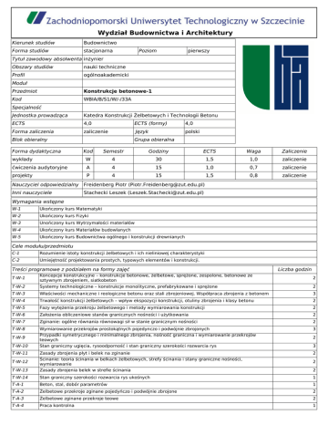 [ logo uczelni ] Wydział Budownictwa i Architektury Kierunek studiów Budownictwo Forma studiów stacjonarna Poziom pierwszy Tytuł zawodowy absolwenta inżynier Obszary studiów nauki techniczne Profil ogólnoakademicki Moduł Przedmiot Konstrukcje betonowe-1 Kod WBIA/B/S1/W/-/33A Specjalność Jednostka prowadząca Katedra Konstrukcji Żelbetowych i Technologii Betonu ECTS 4,0 ECTS (formy) 4,0 Forma zaliczenia zaliczenie Język polski Blok obieralny Forma dydaktyczna Grupa obieralna Kod Semestr Godziny ECTS Waga Zaliczenie wykłady W 4 30 1,5 1,0 zaliczenie ćwiczenia audytoryjne A 4 15 1,0 0,7 zaliczenie projekty P 4 15 1,5 0,8 zaliczenie Nauczyciel odpowiedzialny Freidenberg Piotr ([email protected]) Inni nauczyciele Stachecki Leszek ([email protected]) Wymagania wstępne W-1 Ukończony kurs Matematyki W-2 Ukończony kurs Fizyki W-3 Unończony kurs Wytrzymałości materiałów W-4 Ukończony kurs Materiałów budowlanych W-5 Ukończony kurs Budownictwa ogólnego i konstrukcji drewnianych Cele modułu/przedmiotu C-1 Rozumienie istoty konstrukcji żelbetowych i ich nieliniowej charakterystyki C-2 Umiejętność projektowania prostych, typowych elementów i konstrukcji. Treści programowe z podziałem na formy zajęć Liczba godzin T-W-1 Koncepcje konstrukcyjne – konstrukcje betonowe, żelbetowe, sprężone, zespolone, betonowe ze sztywnym zbrojeniem, siatkobeton 2 T-W-2 Systemy technologiczne – konstrukcje monolityczne, prefabrykowane i sprężone 2 T-W-3 Właściwości mechaniczne i reologiczne betonu oraz stali zbrojeniowej. Współpraca zbrojenia z betonem 3 T-W-4 Trwałość konstrukcji żelbetowych – wpływ ekspozycji konstrukcji, otuliny zbrojenia i klasy betonu 2 T-W-5 Fazy wytężenia przekroju żelbetowego i metody wymiarowania konstrukcji 2 T-W-6 Założenia obliczeniowe stanów granicznych nośności i użytkowania 2 T-W-7 Zginanie: ogólne równania równowagi sił w stanie granicznym nośności 2 T-W-8 Wymiarowanie przekrojów prostokątnych pojedynczo i podwójnie zbrojonych 3 T-W-9 Przypadki symetrycznego i minimalnego zbrojenia, nośność graniczna i wymiarowanie przekrojów teowych 2 T-W-10 Stan graniczny ugięcia, rysoodporność i stan graniczny szerokości rozwarcia rys 3 T-W-11 Zasady zbrojenia płyt i belek na zginanie 2 T-W-12 Ścinanie: teoria ścinania w belkach żelbetowych, strefy ścinania i stany graniczne nośności, wymiarowanie 2 T-W-13 Zasady zbrojenia belek w strefie ścinania 2 T-W-14 Stan graniczny szerokości rozwarcia rys ukośnych 1 T-A-1 Beton, stal, dobór parametrów 1 T-A-2 Żelbetowe przekroje zginane pojedyńczo i podwójnie zbrojone 2 T-A-3 Żelbetowe zginane przekroje teowe 2 T-A-4 Praca kontrolna 1 [ logo uczelni ] Wydział Budownictwa i Architektury Treści programowe z podziałem na formy zajęć Liczba godzin T-A-5 Ścinanie 4 T-A-6 Praca kontrolna 1 T-A-7 Stany graniczne użytkowalności - ugięcie, zarysowanie 3 T-A-8 Praca kontrolna 1 T-P-1 Projekt stropu płytowo-żebrowego. Obliczenia statyczne i wymiarowanie elementów stropu: płyty wieloprzęsłowej jednokierunkowo pracującej, oraz wieloprzęsłowego żebra stropowego. Sprawdzenie zarysowania i ugięcia elementów stropu. Rysunki konstrukcyjne projektowanych elementów stropu 15 Obciążenie pracą studenta - formy aktywności Liczba godzin A-W-1 Uczestnictwo w wykładach A-W-2 Udział w konsultacjach 30 2 A-W-3 Oprocowywanie materiału-studia literaturowe 8 A-W-4 Przygotowanie do zaliczenia 3 A-W-5 Udział w zaliczeniu A-A-1 uczestnictwo w zajęciach A-A-2 Udział w konsultacjach A-P-1 Uczestnictwo w zajęciach projektowych A-P-2 Udział w konsultacjach A-P-3 Samodzielna realizacja zadania projektowego A-P-4 Przygotowanie do zaliczenia projektu 3 A-P-5 Zaliczenie projektu 1 2 15 4 15 4 22 Metody nauczania / narzędzia dydaktyczne M-1 Wykład informacyjny M-2 Metoda projektów Sposoby oceny (F - formująca, P - podsumowująca) S-1 P Egzamin pisemny z wykładów S-2 P Zaliczenie pracy projektowej Odniesienie do efektów kształcenia prowadzących do Cel uzyskania tytułu przedmiotu zawodowego inżyniera Odniesienie do efektów kształcenia dla kierunku studiów Odniesienie do efektów zdefiniowanych dla obszaru kształcenia B_1A_C/33A_W01 Zna i rozumie założenia teoretyczne konstrukcji żelbetowych B_1A_W08 T1A_W03 T1A_W04 C-1 B_1A_C/33A_W02 Zna założenia stanów granicznych nosności i użytkowalności B_1A_W08 T1A_W03 T1A_W04 C-1 C-2 B_1A_C/33A_W03 Zna zasady konstruowania podstawowych elementów konstrukcji budowlanych B_1A_W07 B_1A_W08 B_1A_W15 T1A_W03 T1A_W04 T1A_W05 T1A_W06 T1A_W07 Zamierzone efekty kształcenia Treści programowe Metody nauczania Sposób oceny M-1 S-1 M-1 M-2 S-1 S-2 M-1 M-2 S-1 S-2 M-2 S-2 M-2 S-2 M-1 M-2 S-1 S-2 Wiedza InzA_W01 InzA_W02 InzA_W05 C-1 C-2 T-W-1 T-W-2 T-W-5 T-W-6 T-W-7 T-P-1 T-W-8 T-W-11 T-W-3 T-W-4 T-W-9 T-W-10 T-W-14 T-W-12 T-W-13 T-P-1 T-W-8 T-W-11 T-W-13 Umiejętności B_1A_C/33A_U01 Projektuje proste elementy konstrukcji budowlanych B_1A_U02 B_1A_U07 B_1A_U17 B_1A_C/33A_U02 Wykonuje rysunki konstrukcyjne prostych elementów konstrukcji B_1A_U11 T1A_U09 T1A_U10 T1A_U13 T1A_U14 T1A_U15 T1A_U16 T1A_U02 T1A_U07 T1A_U15 InzA_U02 InzA_U03 InzA_U05 InzA_U06 InzA_U07 InzA_U08 C-2 InzA_U07 C-2 T-W-11 Inne kompetencje społeczne i personalne B_1A_C/33A_K01 Rozumie potrzebę samodzielnego uczenia się. B_1A_K01 T1A_K01 C-1 C-2 T-P-1 T-W-1 T-W-2 T-W-3 T-W-4 T-W-5 T-W-6 T-W-7 T-W-8 T-W-9 T-W-10 T-W-11 T-W-12 T-W-13 T-W-14 [ logo uczelni ] Wydział Budownictwa i Architektury Efekt Ocena Kryterium oceny Wiedza B_1A_C/33A_W01 2,0 3,0 B_1A_C/33A_W02 3,5 4,0 4,5 5,0 2,0 3,0 B_1A_C/33A_W03 Rozwiązanie zachowujące podstawowe wymagania poprawności merytorycznej i formalnej (kompletność, porządek, czytelność, estetyka) z wyraźnie widocznymi błędami, tyle że z analizy przedstawionego opracowania wynika, że student po wskazaniu mu błędów będzie w stanie je bez problemu poprawić. Rozwiązanie zachowujące podstawowe wymagania po