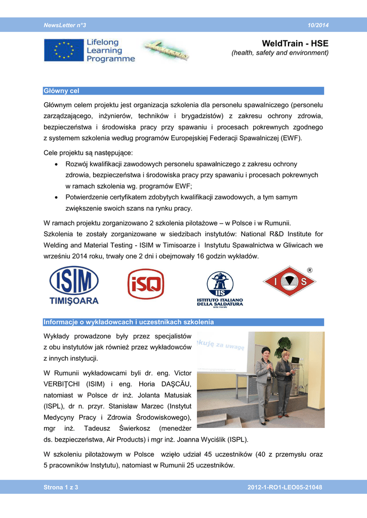 NewsLetter n°3 10/2014 WeldTrain - HSE (health, safety and environment) Główny cel Głównym celem projektu jest organizacja szkolenia dla personelu spawalniczego (personelu zarządzającego, inżynierów, techników i brygadzistów) z zakresu ochrony zdrowia, bezpieczeństwa i środowiska pracy przy spawaniu i procesach pokrewnych zgodnego z systemem szkolenia według programów Europejskiej Federacji Spawalniczej (EWF). Cele projektu są następujące: Rozwój kwalifikacji zawodowych personelu spawalniczego z zakresu ochrony zdrowia, bezpieczeństwa i środowiska pracy przy spawaniu i procesach pokrewnych w ramach szkolenia wg. programów EWF; Potwierdzenie certyfikatem zdobytych kwalifikacji zawodowych, a tym samym zwiększenie swoich szans na rynku pracy. W ramach projektu zorganizowano 2 szkolenia pilotażowe – w Polsce i w Rumunii. Szkolenia te zostały zorganizowane w siedzibach instytutów: National R&D Institute for Welding and Material Testing - ISIM w Timisoarze i Instytutu Spawalnictwa w Gliwicach we wrześniu 2014 roku, trwały one 2 dni i obejmowały 16 godzin wykładów. Informacje o wykładowcach i uczestnikach szkolenia Wykłady prowadzone były przez specjalistów z obu instytutów jak również przez wykładowców z innych instytucji. W Rumunii wykładowcami byli dr. eng. Victor VERBIŢCHI (ISIM) i eng. Horia DAŞCĂU, natomiast w Polsce dr inż. Jolanta Matusiak (ISPL), dr n. przyr. Stanisław Marzec (Instytut Medycyny Pracy i Zdrowia Środowiskowego), mgr inż. Tadeusz Świerkosz (menedżer ds. bezpieczeństwa, Air Products) i mgr inż. Joanna Wyciślik (ISPL). W szkoleniu pilotażowym w Polsce wzięło udział 45 uczestników (40 z przemysłu oraz 5 pracowników Instytutu), natomiast w Rumunii 25 uczestników. Strona 1 z 3 2012-1-RO1-LEO05-21048 NewsLetter n°3 10/2014 WeldTrain - HSE (health, safety and environment) Większość uczestników z obu krajów posiadała wyższe wykształcenie oraz doświadczenie zawodowe dłuższe niż 3 lata. Zakres tematyczny szkolenia 1. Definicje i rodzaje zagrożeń 2. Zagrożenia przy spawaniu i procesach pokrewnych 3. Zagrożenia chemiczne podczas spawania 4. Zagrożenia fizyczne podczas spawania 5. Zagrożenia mechaniczne 6. Zagrożenia elektryczne 7. Zagrożenie pożarowe oraz ryzyko wystąpienia eksplozji 8. Gazy sprężone 9. Niebezpieczne atmosfery 10. Ergonomia w środowisku pracy 11. Schorzenia układu mięśniowo-szkieletowego 12. Mikroklimat 13. Ocena ryzyka zawodowego 14. Środki ochrony indywidualnej 15. Spawanie w zamkniętych przestrzeniach 16. Wentylacja 17. Wykaz norm w zakresie bezpieczeństwa i higieny pracy oraz ochrony środowiska Ogólne informacje o uczestnikach szkolenia pilotażowego Strona 2 z 3 2012-1-RO1-LEO05-21048 NewsLetter n°3 10/2014 WeldTrain - HSE (health, safety and environment) Ocena szkolenia pilotażowego Ocena szkolenia pilotażowego składała się z dwóch etapów: 1. ocena wewnętrzna kursu, która polegała na wypełnieniu ankiety przez uczestników szkolenia; 2. ocena zewnętrzna, która została przeprowadzona przez pracownika uczelni wyższej mającego doświadczenie merytoryczne w obszarze inżynierii środowiska pracy. Duże zainteresowanie udziałem w szkoleniu ukazało potrzebę organizacji kursu z zakresu zdrowia i bezpieczeństwa przy spawaniu i procesach pokrewnych. Tematy omówione podczas szkolenia były, zdaniem uczestników, interesujące i spełniły ich oczekiwania. Doceniono również przygotowane przez partnerów Projektu materiały szkoleniowe, które otrzymał każdy z uczestników. Uczestnicy uznali je za kompendium występujących wiedzy przy w obszarze spawaniu i zagrożeń procesach pokrewnych, które będzie bardzo przydatne w ich pracy zawodowej. Szczegółowe informacje dostępne są na stronie internetowej projektu www.hseweldtrain.org i portalu Facebook WeldTrain - HSE Projekt ten realizowany jest przy wsparciu finansowym Komisji Europejskiej. Informacje zawarte w niniejszej ulotce odzwierciedlają jedynie stanowisko autora i Komisja Europejska nie ponosi odpowiedzialności za zamieszczoną treść. Strona 3 z 3 2012-1-RO1-LEO05-21048