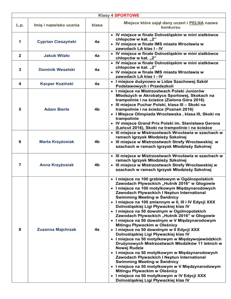 Klasy 4 SPORTOWE L.p. Imię i nazwisko ucznia klasa 1 Cyprian Cieszyński 4a 2 Jakub Wlizło 4a 3 Dominik Weselski 4a 4 Kacper Koziński 4a 5 Adam Bierła 4b 6 Marta Krzyżosiak 4b 7 8 Anna Krzyżosiak Zuzanna Majchrzak 4b 4e Miejsce które zajął dany uczeń i PEŁNA nazwa konkursu IV miejsce w finale Dolnośląskim w mini siatkówce chłopców w kat. „2” IV miejsce w finale IMS miasta Wrocławia w zawodach LA klas I - IV IV miejsce w finale Dolnośląskim w mini siatkówce chłopców w kat. „2” IV miejsce w finale Dolnośląskim w mini siatkówce chłopców w kat. „2” IV miejsce w finale IMS miasta Wrocławia w zawodach LA klas I - IV I miejsce dużynowo w Lidze Szachowej Szkół Podstawowych i Przedszkoli I miejsce na Mistrzostwach Polski Juniorów Młodszych w Akrobatyce Sportowej, Skokach na trampolinie i na ścieżce (Zielona Góra 2016) III miejsce Puchar Polski, klasa III – Skoki na trampolinie i na ścieżce (Poznań 2016) I Miejsce Olimpiada Wrocławska , klasa III, Skoki na trampolinie IV miejsce Grand Prix Polski im. Stanisława Gerona (Łańcut 2016), Skoki na trampolinie i na ścieżce III miejsce w Mistrzostwach Wrocławia w szachach w ramach Igrzysk Młodzieży Szkolnej III miejsce w Mistrzostwach Strefy Wrocławskiej w szachach w ramach Igrzysk Młodzieży Szkolnej III miejsce w Mistrzostwach Wrocławia w szachach w ramach Igrzysk Młodzieży Szkolnej III miejsce w Mistrzostwach Strefy Wrocławskiej w szachach w ramach Igrzysk Młodzieży Szkolnej I miejsce na 100 grzbietowym w Ogólnopolskich Zawodach Pływackich „Hutnik 2016” w Głogowie I miejsce na 100 motylkowym Międzynarodowych Zawodach Pływackich I Neptun International Swimming Meeting w Świdnicy I miejsce na 100 zmiennym w II, III i IV Edycji XXX Dolnośląskiej Ligi Pływackiej klas IV I miejsce na 50 dowolnym w Ogólnopolskich Zawodach Pływackich „Hutnik 2016” w Głogowie I miejsce na 50 dowolnym w V Międzynarodowym Mitingu Pływackim w Oleśnicy I miejsce na 50 dowolnym w II Edycji XXX Dolnośląskiej Ligi Pływackiej klas IV I miejsce na 50 motylkowym w Międzywojewódzkich Drużynowych Mistrzostwach Młodzików 11 letnich w Nowej Rudzie I miejsce na 50 motylkowym w Międzynarodowych Zawodach Pływackich I Neptun International Swimming Meeting w Świdnicy I miejsce na 50 motylkowym w V Międzynarodowym Mitingu Pływackim w Oleśnicy I miejsce na 50 motylkowym w IV Edycji XXX Dolnośląskiej Ligi Pływackiej klas IV I miejsce w klasyfikacji generalnej Ogólnopolskich Zawodów Pływackich „Hutnik 2016” w Głogowie I miejsce w klasyfikacji generalnej XXX Dolnośląskiej Ligi Pływackiej klas IV II miejsce na 100 dowolnym w Międzywojewódzkich Drużynowych Mistrzostwach Młodzików 11 letnich w Nowej Rudzie II miejsce na 100 zmiennym w Ogólnopolskich Zawodach Pływackich „Hutnik 2016” w Głogowie II miejsce na 100 zmiennym w V Międzynarodowym Mitingu Pływackim w Oleśnicy II miejsce na 50 grzbietowym w V Międzynarodowym Mitingu Pływackim w Oleśnicy II miejsce na 50 klasycznym w III Edycji XXX Dolnośląskiej Ligi Pływackiej klas IV III miejsce na 100 dowolnym w Ogólnopolskich Zawodach Pływackich „Hutnik 2016” w Głogowie III miejsce na 100 dowolnym w V Międzynarodowym Mitingu Pływackim w Oleśnicy III miejsce na 50 dowolnym w Międzynarodowych Zawodach Pływackich I Neptun International Swimming Meeting w Świdnicy 9 Maciej Lipiec 4e 10 Liwia Bawolska 4e II miejsce na 50 dowolnym w Międzynarodowych Zawodach Pływackich I Neptun International Swimming Meeting w Świdnicy II miejsce na 50 grzbietowym w Międzynarodowych Zawodach Pływackich I Neptun International Swimming Meeting w Świdnicy II miejsce na 50 motylkowym w Międzynarodowych Zawodach Pływackich I Neptun International Swimming Meeting w Świdnicy III miejsce na 50 dowolnym w Międzywojewódzkich Drużynowych Mistrzostwach Młodzików 11 letnich w Nowej Rudzie III miejsce na 100 zmiennym w Międzywojewódzkich Drużynowych Mistrzostwach Młodzików 11 letnich w Nowej Rudzie III miejsce na 50 klasycznym w Międzynarodowych Zawodach Pływackich I Neptun International Swimming Meeting w Świdnicy I miejsce na 50 dowolnym w Międzywojewódzkich Drużynowych Mistrzostwach Młodzików 11 letnich w Nowej Rudzie I miejsce na 50 dowolnym w V Międzynarodowym Mitingu Pływackim w Oleśnicy II miejsce na 100 zmiennym w Międzywojewódzkich Drużynowych Mistrzostwach Młodzików 11 letnich w Nowej Rudzie II miejsce na 100 zmiennym w V Międzynarodowym Mitingu Pływackim w Oleśnicy II miejsce na 50 grzbietowym w V Międzynarodowym Mitingu Pływackim w Oleśnicy II miejsce na 50 klasycznym w Międzywojewódzkich Drużynowych Mistrzostwach Młodzików 11 letnich w Nowej Rudzie II miejsce na 50 klasycznym w Międzynarodowych Zawodach Pływackich I Neptun International Swimming Meeting w Świdnicy 11 Tamara Jach 4e 12 Mateusz Lech 4e II miejsce na 50 motylkowym w Międzynarodowych Zawodach Pływackich I Neptun International Swimming Meeting w Świdnicy III miejsce na 100 dowolnym w V Międzynarodowym Mitingu Pływackim w Oleśnicy III miejsce na 50 dowolnym w Międzynarodowych Zawodach Pływackich I Neptun International Swimming Meeting w Świdnicy III miejsce na 50 dowolnym w II Edycji XXX Dolnośląskiej Ligi Pływackiej klas IV III miejsce na 50 grzbietowym w V Międzynarodowym Mitingu Pływackim w Oleśnicy III miejsce na 50 grzbietowym w Międzywojewódzkich Drużynowych Mistrzostwach Młodzików 11 letnich w Nowej Rudzie III miejsce na 50 klasycznym w V Międzynarodowym Mitingu Pływackim w Oleśnicy II miejsce na 50 klasycznym w Międzywojewódzkich Drużynowych Mistrzostwach Młodzików 11 letnich w Nowej Rudzie IV miejsce w finale IMS miasta Wrocławia w zawodach LA klas I - IV I miejsce na 50 grzbietowym w V Międzynarodowym Mitingu Pływackim w Oleśnicy I miejsce na 50 klasycznym w Międzynarodowych Zawodach Pływackich I Neptun International Swimming Meeting w Świdnicy II miejsce na 50 klasycznym w V M