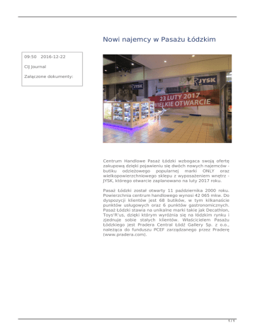 Nowi najemcy w Pasażu Łódzkim 09:50 2016-12-22 CIJ Journal Załączone dokumenty: Centrum Handlowe Pasaż Łódzki wzbogaca swoją ofertę zakupową dzięki pojawieniu się dwóch nowych najemców butiku odzieżowego popularnej marki ONLY oraz wielkopowierzchniowego sklepu z wyposażeniem wnętrz JYSK, którego otwarcie zaplanowano na luty 2017 roku. Pasaż Łódzki został otwarty 11 października 2000 roku. Powierzchnia centrum handlowego wynosi 42 065 mkw. Do dyspozycji klientów jest 68 butików, w tym kilkanaście punktów usługowych oraz 6 punktów gastronomicznych. Pasaż Łódzki stawia na unikalne marki takie jak Decathlon, Toys‘R’us, dzięki którym wyróżnia się na łódzkim rynku i zjednuje sobie stałych klientów. Właścicielem Pasażu Łódzkiego jest Pradera Central Łódź Gallery Sp. z o.o., należąca do funduszu PCEF zarządzanego przez Praderę (www.pradera.com). 1/1