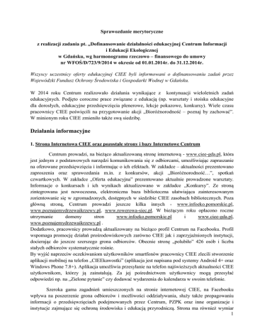 Sprawozdanie merytoryczne z realizacji zadania pt. „Dofinansowanie działalności edukacyjnej Centrum Informacji i Edukacji Ekologicznej w Gdańsku, wg harmonogramu rzeczowo – finansowego do umowy nr WFOŚ/D/723/9/2014 w okresie od 01.01.2014r. do 31.12.2014r. Wszyscy uczestnicy oferty edukacyjnej CIEE byli informowani o dofinansowaniu zadań przez Wojewódzki Fundusz Ochrony Środowiska i Gospodarki Wodnej w Gdańsku. W 2014 roku Centrum realizowało działania wynikające z kontynuacji wieloletnich zadań edukacyjnych. Podjęto coroczne prace związane z edukacją (np. warsztaty i stoiska edukacyjne dla dorosłych, edukacyjne przedsięwzięcia plenerowe, lekcje pokazowe, konkursy). Wiele czasu pracownicy CIEE poświęcili na przygotowanie akcji „Bioróżnorodność – poznaj by zachować”. W minionym roku CIEE zmieniło także swą siedzibę. Działania informacyjne 1. Strona Internetowa CIEE oraz pozostałe strony i bazy Internetowe Centrum Centrum prowadzi, na bieżąco aktualizowaną stronę internetową - www.ciee-gda.pl, która jest jednym z podstawowych narzędzi komunikowania się z odbiorcami, umożliwiając zapraszanie na oferowane przedsięwzięcia i informując o ich efektach. W zakładce – aktualności prezentowano zaproszenia oraz sprawozdania m.in. z konkursów, akcji „Bioróżnorodność…”, spotkań czwartkowych. W zakładce „Oferta edukacyjna” prezentowano aktualnie prowadzone warsztaty. Informacje o konkursach i ich wynikach aktualizowano w zakładce „Konkursy”. Ze stroną zintegrowana jest nowoczesna, elektroniczna baza biblioteczna ułatwiająca zainteresowanym zorientowanie się w zgromadzonych, dostępnych w siedzibie CIEE zasobach bibliotecznych. Poza główną stroną, Centrum prowadzi jeszcze kilka innych - www.infoeko.pomorskie.pl, www.poznajemydrzewaikrzewy.pl, www.rowerowa-siec.pl. W bieżącym roku opłacono roczne utrzymanie domeny stron www.infoeko.pomorskie.pl i www.ciee-gda.pl, www.poznajemydrzewaikrzewy.pl . Dodatkowo, pracownicy prowadzą aktualizowany na bieżąco profil Centrum na Facebooku. Profil wspomaga promocję działań prośrodowiskowych zarówno CIEE jak i zaprzyjaźnionych instytucji, docierając do jeszcze szerszego grona odbiorców. Obecnie stronę „polubiło” 426 osób i liczba stałych odbiorców systematycznie rośnie. By wyjść naprzeciw oczekiwaniom użytkowników smartfonów pracownicy CIEE zlecili stworzenie aplikacji mobilnej na telefon „CIEEkawostki” (aplikacja jest napisana pod systemy Android 4+ oraz Windows Phone 7.8+). Aplikacja umożliwia przesyłanie na telefon najświeższych aktualności CIEE użytkownikom, którzy ją zainstalują. Za jej pośrednictwem użytkownicy mogą przesyłać odpowiedzi np. na „Zielone pytanie” czy dodawać wydarzenia do kalendarza w swoim telefonie. Szeroka gama zagadnień umieszczonych na stronie internetowej CIEE, na Facebooku wpływa na poszerzenie grona odbiorców i możliwości oddziaływania, służy także propagowaniu informacji o przedsięwzięciach podejmowanych przez Centrum, PZPK oraz inne organizacje i instytucje zajmujące się ochroną środowiska i edukacją przyrodniczą. Strona ma również wymiar 1 edukacyjny dzięki zakładce “Ważne informacje”. Ten cel jest systematycznie osiągany, a liczba wizyt na stronach rośnie: [email protected] – 79 590 www.infoeko.pomorskie.pl – 60 355 www.rowerowa-siec.pl – 36 788 www.poznajemydrzewaikrzewy.pl – 18 131 Statystyki Facebooka: polubienia - 426, zasięg postów – cały Świat liczba osób udostępniających zdarzenia CIEE – 32 585 liczba osób, które zobaczyły posty CIEE w pasku aktywności lub wchodząc na stronę 1 706 435 2. Biblioteka Zakupy do biblioteki dokonano w drugim półroczu 2014 roku. W ciągu roku dotarło również do Centrum kilka bezpłatnych pozycji, podarowanych przez instytucje realizujące projekty prośrodowiskowe. Wszystkie pozycje zostały zinwentaryzowane i widnieją na stronie internetowej Centrum w zakładce „Biblioteka”. Efektem jest zwiększenie zasobów biblioteki wspierającej poszerzanie wiedzy mieszkańców województwa pomorskiego o sposobach prośrodowiskowego postępowania poprzez szerokie udostępnianie publikacji książkowych i na nośnikach elektronicznych. Pozycje biblioteczne wspierają działania mieszkańców Trójmiasta i pracowników Centrum oraz zaprzyjaźnionych instytucji. Po zmianie siedziby dostęp do biblioteki jest dla wielu osób utrudniony ze względu na odległość. W związku z tym pracownicy zaplanowali i rozpoczęli promocję biblioteki wśród mieszkańców i szkół dzielnicy Oliwa oraz na znajdującym się w pobliżu Uniwersytecie Gdańskim. 3. Informacja i promocja działalności Zakładki magnetyczne do książek W roku 2010 pracownicy Centrum wykonali w ramach projektu współfinansowanego przez NFOŚiGW, w partnerstwie z Politechniką Gdańską program do nauki rozpoznawania drzew. Ponieważ program jest niesłychanie przydatny do nauki rozpoznawania drzew rodzimych zaplanowano kolejną jego promocję, w związku z tym wydrukowano 17 600 sztuk zakładek magnetycznych do książek, na których widnieje m.in. adres strony www.poznajemydrzewaikrzewy.pl. Zakładki rozdawane są laureatom konkursów, uczestnikom warsztatów i akcji edukacyjnych. Po szeroko zakrojonej akcji promocyjnej widać efekty w postaci zwiększonej liczby odbiorców programu. Na uwagę zasługuje fakt iż program jest darmowy i wysoko oceniany przez użytkowników. Wywiady i artykuły: Dziennik Bałtycki 31.05.2014 – na temat projektu „Dojrzały smak przygody”; Wywiad dla telewizji kablowej na temat przyrody miejskiej i akcji „Bioróżnorodność – poznaj by zachować”; 2 Wywiad dla radia RMF, Radia Gdańsk (Magazyn Ekologiczny, wywiad do serwisu), Radia Plus związane z działaniami prośrodowiskowymi i przedsięwzięciami Centrum; Artykuł w piśmie PG dotyczący akcji edukacyjnej „Bioróżnorodność – poznaj by zachować