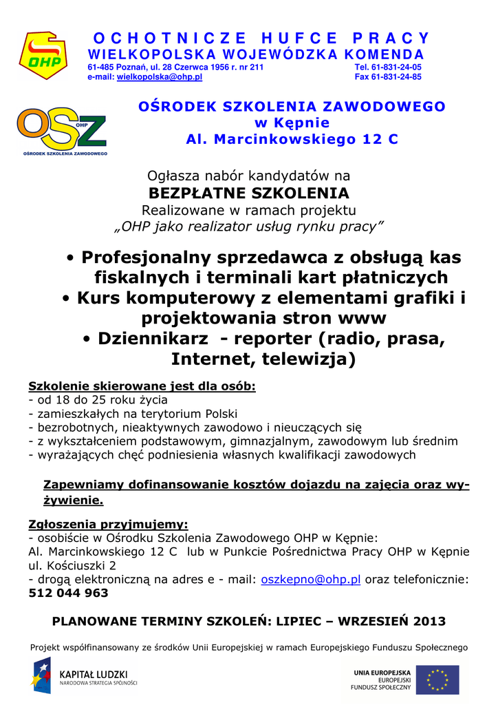 OCHOTNICZE HUFCE PRACY WIELKOPOLSKA WOJEWÓDZKA KOMENDA 61-485 Poznań, ul. 28 Czerwca 1956 r. nr 211 e-mail: [email protected] Tel. 61-831-24-05 Fax 61-831-24-85 OŚRODEK SZKOLENIA ZAWODOWEGO w Kępnie Al. Marcinkowskiego 12 C Ogłasza nabór kandydatów na BEZPŁATNE SZKOLENIA Realizowane w ramach projektu „OHP jako realizator usług rynku pracy” • Profesjonalny sprzedawca z obsługą kas fiskalnych i terminali kart płatniczych • Kurs komputerowy z elementami grafiki i projektowania stron www • Dziennikarz - reporter (radio, prasa, Internet, telewizja) Szkolenie skierowane jest dla osób: - od 18 do 25 roku życia - zamieszkałych na terytorium Polski - bezrobotnych, nieaktywnych zawodowo i nieuczących się - z wykształceniem podstawowym, gimnazjalnym, zawodowym lub średnim - wyrażających chęć podniesienia własnych kwalifikacji zawodowych Zapewniamy dofinansowanie kosztów dojazdu na zajęcia oraz wyżywienie. Zgłoszenia przyjmujemy: - osobiście w Ośrodku Szkolenia Zawodowego OHP w Kępnie: Al. Marcinkowskiego 12 C lub w Punkcie Pośrednictwa Pracy OHP w Kępnie ul. Kościuszki 2 - drogą elektroniczną na adres e - mail: [email protected] oraz telefonicznie: 512 044 963 PLANOWANE TERMINY SZKOLEŃ: LIPIEC – WRZESIEŃ 2013 Projekt współfinansowany ze środków Unii Europejskiej w ramach Europejskiego Funduszu Społecznego [Wpisz tekst]