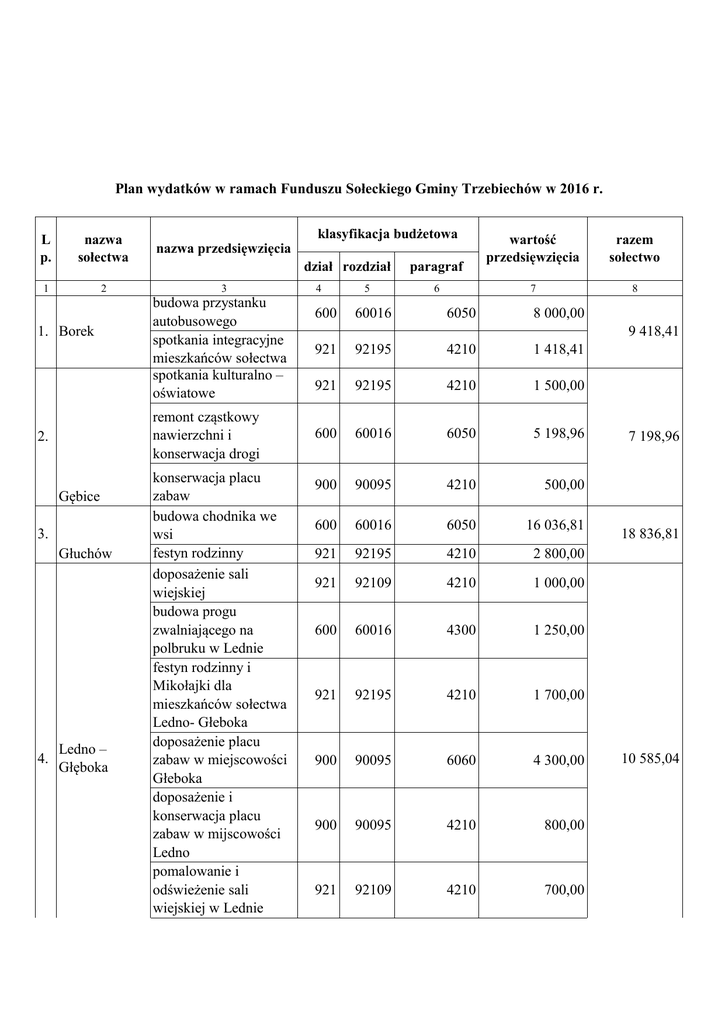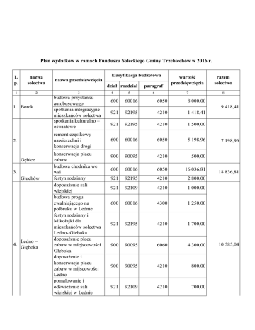 Plan wydatków w ramach Funduszu Sołeckiego Gminy Trzebiechów w 2016 r. L p. nazwa sołectwa 1 2 1. Borek Gębice 3. Głuchów Ledno – Głęboka klasyfikacja budżetowa dział rozdział 3 budowa przystanku autobusowego spotkania integracyjne mieszkańców sołectwa spotkania kulturalno – oświatowe remont cząstkowy nawierzchni i konserwacja drogi 2. 4. nazwa przedsięwzięcia konserwacja placu zabaw budowa chodnika we wsi festyn rodzinny doposażenie sali wiejskiej budowa progu zwalniającego na polbruku w Lednie festyn rodzinny i Mikołajki dla mieszkańców sołectwa Ledno- Głeboka doposażenie placu zabaw w miejscowości Głeboka doposażenie i konserwacja placu zabaw w mijscowości Ledno pomalowanie i odświeżenie sali wiejskiej w Lednie 4 5 paragraf 6 wartość przedsięwzięcia razem sołectwo 7 8 600 60016 6050 8 000,00 921 92195 4210 1 418,41 921 92195 4210 1 500,00 600 60016 6050 5 198,96 900 90095 4210 500,00 600 60016 6050 16 036,81 921 92195 4210 2 800,00 921 92109 4210 1 000,00 600 60016 4300 1 250,00 921 92195 4210 1 700,00 900 90095 6060 4 300,00 900 90095 4210 800,00 921 92109 4210 700,00 9 418,41 7 198,96 18 836,81 10 585,04 Głęboka L p. nazwa sołectwa 5. Mieszkowo 6. Ostrzyce 7. Podlegórz 8. Radowice 9. Swarzynice 10 Trzebiechów nazwa przedsięwzięcia klasyfikacja budżetowa dział rozdział upiększanie sołectwa – nasadzenia uzupełnienie wyposażenia świetlicy wiejskiej spotkania integracyjne mieszkańców budowa altany na placu zabaw zakup dodatkowego wyposażenia placu zabaw spotkania integracyjne dla mieszkańców sołectwa zakup i montaż klimatyzacji na świetlicy zakup i montaż urządzeń do ćwiczeń sportowych wykonanie chodnika modernizacja boiska do piłki siatkowej rozwój kulturalny mieszkańców wsi doposazenie sali wiejskiej budowa siłowni zewnętrznej festyn rodzinny rewitalizacja części parku paragraf wartość przedsięwzięcia 900 90095 4210 835,04 921 92109 6060 6 800,00 razem sołectwo 7 511,96 921 92195 4210 711,96 900 90095 6050 9 100,00 900 90095 4210 1 400,00 921 92195 4210 2 731,30 921 92109 6060 14 967,00 14 967,00 926 92601 6060 12 320,76 12 320,76 600 60016 6050 20 000,00 926 92601 4210 1 500,00 921 92195 4210 1 661,88 921 92109 4210 1 300,00 926 92601 6060 15 000,00 921 92195 4210 2 000,00 900 90019 6050 10 154,40 Razem z tego: wydatki bieżące wydatki majątkowe 13 231,30 23 161,88 28 454,40 145 686,52 23 808,59 121 877,93