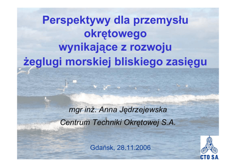 Perspektywy dla przemysłu okrętowego wynikające z rozwoju Ŝeglugi morskiej bliskiego zasięgu mgr inŜ. Anna Jędrzejewska Centrum Techniki Okrętowej S.A. Gdańsk, 28.11.2006 Sytuacja w sektorze transportowym • • • • • 1995-2004 2,3% średnie roczne tempo wzrostu gospodarczego w UE 2,8% średnie roczne tempo wzrostu przewozów towarowych w UE-25 35% wzrostu – transport drogowy 31% wzrostu – Ŝmbz 2001-2004 13,5% średnie roczne tempo wzrostu ogólnoświatowego ruchu kontenerowego Źródło:COM(2006)314 wersja ostateczna, 22.06.2006 Gdańsk, 28.11.2006 Centrum Techniki Okretowej S.A. 2 Prognozy rozwoju sektora transportowego • • • • 2000-2020 w UE-25 52% PKB 50% ogółem transport towarowy 59% Ŝmbz 55% transport drogowy Źródło:COM(2006)314 wersja ostateczna, 22.06.2006 Gdańsk, 28.11.2006 Centrum Techniki Okretowej S.A. 3 Przewozy ładunków Ŝmbz w UE-25 kontenery 10,2% ładunki ro-ro 12,7% inne 7,5% ładunki m asow e suche 18,9% Źródło: Transport - Statistics in Focus 4/2006 – Short Sea Shipping of Goods 2000-2004, EUROSTAT Gdańsk, 28.11.2006 ładunki m asow e płynne 50,7% Centrum Techniki Okretowej S.A. 4 Przewozy ładunków Ŝmbz Atlantyk Bałtyk M. Czarne M. Śródziemne M. Północne Źródło: Transport - Statistics in Focus 4/2006 – Short Sea Shipping of Goods 2000-2004, EUROSTAT Gdańsk, 28.11.2006 Centrum Techniki Okretowej S.A. 5 Przewozy ładunków ro-ro Ŝmbz w UE Pozostałe kraje Belgia UE Polska 6,5% 4,5% 0,5% Dania 6,0% Wlk. Brytania 25,3% Niemcy 10,2% Grecja 5,8% Hiszpania 3,9% Szwecja 11,7% Finlandia Źródło: Transport - Statistics in Focus 3,9% Holandia 4/2006 – Short Sea Shipping of Goods 4,5% Francja 7,2% Włochy 9,9% 2000-2004, EUROSTAT Gdańsk, 28.11.2006 Centrum Techniki Okretowej S.A. 6 Przewozy ładunków kontenerowych Ŝmbz w UE Pozostałe kraje UE Polska 7,6% 0,6% Wlk. Brytania 9,9% Belgia 8,9% Dania 1,5% Niem cy 14,5% Szw ecja 3,0% Finlandia 4,6% Grecja 5,2% Holandia 9,9% Hiszpania 12,6% Źródło: Transport - Statistics in Focus 4/2006 – Short Sea Shipping of Goods 2000-2004, EUROSTAT Gdańsk, 28.11.2006 Włochy 17,4% Francja 4,3% Centrum Techniki Okretowej S.A. 7 Flota statków do Ŝmbz • • • • • • • drobnicowce (45%) statki do przewozów płynnych (21%) statki ro-ro (16%) kontenerowce dowozowe, chłodniowce, statki pasaŜerskie i promy masowce Gdańsk, 28.11.2006 Centrum Techniki Okretowej S.A. 8 Gdańsk, 28.11.2006 Centrum Techniki Okretowej S.A. Wlk. Brytania 49088 47 582871 559511 liczba 60 1000000 33 6 50 40 liczba 62 Szwecja 653 0 1 Hiszpania 2 Portugalia 5 22045 238057 17 Polska Holandia 800000 Malta 63005 1 Luxemburg 9995 1 Litwa 2 9953 1352484 1264683 1400000 Łotwa 25984 1600000 Włochy 19 146372 6 Irlandia 32005 14 Grecja 8 34066 27 307609 CGT Niemcy 3 Francja 14 165698 600000 Finlandia 193765 1200000 Dania 200000 75556 400000 Cypr Belgia CGT Flota statków ro-ro 100 90 80 70 60 30 20 10 0 9 Gdańsk, 28.11.2006 Centrum Techniki Okretowej S.A. 1115688 1500000 Wlk. Brytania 869678 192 liczba 60 12 150 117 100 liczba CGT Szwecja 122371 5 Hiszpania 6378 10 Portugalia 18 35156 207 Polska 216855 12 Holandia 133649 7 Malta 105523 3 Litwa 46355 3 Łotwa 0 2149992 2500000 Włochy 31978 34 Irlandia 1644271 2000000 Grecja 671889 288994 47 Niemcy 39 Francja 28 485582 1000000 Finlandia 282334 25 Estonia 20 376330 343010 500000 Dania Cypr CGT Flota statków ropax 250 200 50 0 10 śmbz a budownictwo okrętowe KLIENT STOCZNIA FLOTA • zmiana struktury • odnowienie • nowoczesne statki Gdańsk, 28.11.2006 Centrum Techniki Okretowej S.A. 11 śmbz a budownictwo okrętowe WATERBORNE • utrzymanie czołowej pozycji m.in. w takich sektorach jak Ŝegluga i budowa statków Wizja 2020 • Bezpieczny, zrównowaŜony i efektywny transport wodny • Konkurencyjny, europejski sektor morski • Zarządzanie i wspomaganie rozwoju transportu oraz zmian struktury przewozów Gdańsk, 28.11.2006 Centrum Techniki Okretowej S.A. 12 śmbz a budownictwo okrętowe • Transport zrównowaŜony • Transport efektywny – zintegrowanie statków i systemów przeładunkowych – innowacyjne projekty statków i ich wyposaŜenia oraz urządzeń portowych • minimalizacja kosztów przeładunku • skrócenie czasu postoju w porcie Gdańsk, 28.11.2006 Centrum Techniki Okretowej S.A. 13 śmbz a budownictwo okrętowe WATERBORNE – WSRA • INNOWACJE: – projektowanie statku: • upraszczanie konstrukcji i wyposaŜenia • optymalizacja gospodarki energią elektryczną • zwiększanie automatyzacji – projektowanie styku statek-nabrzeŜe: • upraszczanie cumowania • upraszczanie załadunku i wyładunku Gdańsk, 28.11.2006 automatyzacja i robotyzacja systemów Centrum Techniki Okretowej S.A. 14 Europejski portfel zamówień Stan na 30.06.2006 Gdańsk, 28.11.2006 Centrum Techniki Okretowej S.A. 15 Struktura portfela zamówień polskich stoczni Stan na 31 grudnia 2005 roku prom y 4% m asow ce 4% ro-ro 1% gazow ce LNG 1% con-ro 11% sam ochodow ce 22% gazow ce LPG 3% kontenerow ce 48% w ielozadaniow e 3% chem ikaliow ce 3% wg liczby statków Źródło: OSSINT CTO S.A. Gdańsk, 28.11.2006 Centrum Techniki Okretowej S.A. 16 Struktura produkcji polskich stoczni offshore 7% rybackie 11% w ielozadaniow e 11% chem ikaliow ce 7% prom y 11% kontenerow ce 32% sam ochodow ce 21% Wg liczby statków – 2005 r. Gdańsk, 28.11.2006 Centrum Techniki Okretowej S.A. 17 Prognozy produkcji statków ro-ro w Europie Hiszpania Włochy Niemcy Polska Chorwacja Rosja Razem Gdańsk, 28.11.2006 2007 2 5 3 3 13 2008 2 2 3 1 1 2 11 Centrum Techniki Okretowej S.A. 2009 3 1 4 8 Razem 4 7 9 5 5 2 32 18 Prognozy produkcji statków typu ropax w Europie Hiszpania Włochy Niemcy Finlandia Razem Gdańsk, 28.11.2006 2007 1 3 1 5 10 2008 1 1 2 4 8 Centrum Techniki Okretowej S.A. Razem 2 4 3 9 18 19 Prognozy produkcji kontenerowców w Europie Hiszpania Holandia Rumunia Niemcy Polska Dania Rosja Razem Gdańsk, 28.11.2006 2007 3 15 3 59 15 3 4 102 2008 2 2 44 10 2 60 200