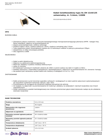 Data wydruku: 04-03-2017 strona 1/2 Kabel światłowodowy typu SL-ZH 12x9/125 uniwersalny, śr. 5.4mm, 1100N 0111123-SLA-9-01x12-ZH-D OPIS BUDOWA KABLA Zewnętrzny płaszcz wykonany z tworzywa bezhalogenowego nierozprzestrzeniającego płomienia (HFFR - halogen free, flame retardant), odporny na promieniowanie UV Zapora przeciwwilgociowa z włókna szklanego Średnica kabla 5.4mm, średnica płaszcza 1.0mm, średnica centralnej tuby 2.5mm Tuba wypełniona żelem tiksotropowym zawiera do 12 kolorowych włókien w pokryciu pierwotnym 250µm Zaopatrzony w nitkę rozrywającą powłokę Siła ciągnienia 1100N WŁAŚCIWOŚCI Kabel w pełni dielektryczny Odporny na zakłócenia elektromagnetyczne Może być układany w pobliżu instalacji elektrycznych Łatwy w montażu W instalacjach pionowych możliwość ułożenia do 100m w pionie (zaleca się robić 2-3 pętle co 50m) Powłoka wykonana z materiałów trudnopalnych, bezhalogenowych, odpornych na promieniowanie UV, ścieranie i korozję Na powłoce jest naniesiony symbol kabla oraz markery w odstępach co 1m (+/- 1%) ZASTOSOWANIE Kable przeznaczone są do transmisji sygnałów cyfrowych i analogowych w całym paśmie optycznym wykorzystywanym we wszystkich systemach transmisji: danych, wizji i fonii Przystosowane do zaciągania do kanalizacji kablowej pierwotnej lub wtórnej Ze względu na odporność na promieniowanie UV może być układany na estakadach i dachach budynków oraz liniach napowietrznych Dzięki zastosowaniu powłoki bezhalogenowej oraz niskiemu promieniowi gięcia kabel doskonale nadaje się do układania wewnątrz budynków DANE TECHNICZNE Średnica zewnętrzna 5.4 ± 0.5 mm Waga 35.5 kg/km Maksymalna siła ciągnienia dynamiczna 1100 N Odporność na zgniatanie 2000 N/10cm Minimalny promień zginania podczas instalacji 20 x średnica kabla Minimalny promień zginania podczas pracy 15 x średnica kabla Temperatura składowania -30 °C do + 70 °C Temperatura eksploatacji -20 °C do + 70 °C Grubość płaszcza 1.0 ± 0.2 mm http://www.dataoptics.pl [email protected] Data wydruku: 04-03-2017 strona 2/2 Kolor płaszcza czarny CENY I DOSTĘPNOŚĆ Kod towaru Nazwa 0111123-SLA-9-01x12-Z H-D Kabel światłowodowy typu SL-ZH 12x9/125 uniwersalny, śr. 5.4mm, 1100N Jedn. m http://www.dataoptics.pl [email protected] Powered by TCPDF (www.tcpdf.org)