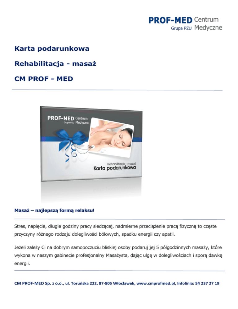 Karta podarunkowa Rehabilitacja - masaż CM PROF - MED Masaż – najlepszą formą relaksu! Stres, napięcie, długie godziny pracy siedzącej, nadmierne przeciążenie pracą fizyczną to częste przyczyny różnego rodzaju dolegliwości bólowych, spadku energii czy apatii. Jeżeli zależy Ci na dobrym samopoczuciu bliskiej osoby podaruj jej 5 półgodzinnych masaży, które wykona w naszym gabinecie profesjonalny Masażysta, dając ulgę w dolegliwościach i sporą dawkę energii. CM PROF-MED Sp. z o.o., ul. Toruńska 222, 87-805 Włocławek, www.cmprofmed.pl, Infolinia: 54 237 27 19 Zakres karty podarunkowej Klienci korzystający z karty podarunkowej ,,Rehabilitacja - Masaż” będą mieli możliwość skorzystania z 5 lub 2 półgodzinnych masaży klasycznych bądź relaksacyjnych kręgosłupa. Masaż relaksacyjny i masaż klasyczny do wyboru: 2 zabiegi masażu po 30 min. - 80 PLN - 180 PLN 5 zabiegów masażu po 30 min. Masaż relaksacyjny – to idealne rozwiązanie na zmęczenie zarówno fizyczne, jak i psychiczne. Problemy życia codziennego, ciągłe napięcie psychiczne, przemęczenie czy spadek energii. Wtedy najlepszym rozwiązaniem jest masaż relaksacyjny, który leczy obolałe i napięte mięśnie, a oprócz tego to uczucie przyjemności dla ciała i dla ducha. Masaż klasyczny– to zabieg relaksujący i leczniczy. Rozluźnia napięte mięśnie i pozwala ukoić nerwy. Stosowany jest przy nerwicach, stanach lękowych i depresji. Pozytywnie oddziałuje na psychikę osób przemęczonych. Zasady korzystania z karty Z karty mogą skorzystać osoby, które chcą połączyć masaże lecznicze wraz z relaksacyjnymi. Uprawienia do korzystania ze świadczeń objętych programem nadawane są w momencie zakupu karty. Realizacja karty jest możliwa w terminie 6 miesięcy od daty zakupu. Opłata dokonywana jest w CM PROF-MED przy ul. Toruńskiej 222 lub Polnej 26. Jeśli jesteś zainteresowany kartą: Skontaktuj się z nami: od poniedziałku do piątku w godzinach 7.00 – 15.00 pod numerem telefonu 54 237 23 19 lub 54 237 27 19 bądź napisz do nas: [email protected] CM PROF-MED Sp. z o.o., ul. Toruńska 222, 87-805 Włocławek, www.cmprofmed.pl, Infolinia: 54 237 27 19