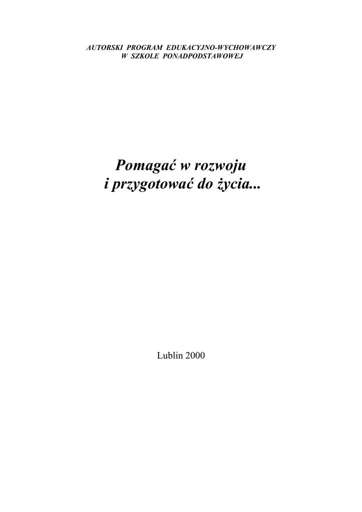 AUTORSKI PROGRAM EDUKACYJNO-WYCHOWAWCZY W SZKOLE PONADPODSTAWOWEJ Pomagać w rozwoju i przygotować do życia... Lublin 2000 Autorski program edukacyjno-wychowawczy w szkole ponadpodstawoowej dla klas I-IV opracowała mgr Grażyna Lizut zgodnie z Rozporządzeniem MEN z dnia 15 lutego 2000 r. oraz WSO Zespołu Szkół Ekonomicznych im. A.J. Vetterów w Lublinie Opracowanie redakcyjne i projekt okładki: Grażyna Lizut W opracowaniu: • Projekt edukacyjno- wychowawczy programu nauczania dla liceum profilowanego w zreformowanej szkole średniej • Propozycje scenariuszy lekcji GDDW 4 Spis treści I. CHARAKTERYSTYKA PROGRAMU................................................... 7 II. CELE EDUKACYJNE ............................................................................ 10 III. PROCEDURA OSIĄGANIA ZAŁOŻONYCH CELÓW W ZAKRESIE: WIEDZY, UMIEJĘTNOŚCI I POSTAW....................... 11 IV. TREŚCI KSZTAŁCENIA ........................................................................ 13 ................................................................................................................... Zadania ..................................................................................................... 14 Osiągnięcia ............................................................................................... 15 V. PROPOZYCJE REALIZACJI PROGRAMU ............................................. 16 Etapy kształcenia ........................................................................................ ⇒ etap – klasa I ..................................................................... ⇒ etap – klasa II .................................................................... ⇒ etap – klasa III................................................................... ⇒ etap – klasa IV................................................................... 16 16 17 18 19 VI. UWAGI O REALIZACJI PROGRAMU ................................................... 42 Metody realizacji treści kształcenia ......................................................... VII. BIBLIOGRAFIA ...................................................................................... 44 5 6 I. CHARAKTERYSTYKA PROGRAMU „Wychowawca pomaga w rozwoju wychowankowi, a przez to sam się rozwija i wzrasta” Program edukacyjno-wychowawczy jest korelacją godzin wychowawczych z różnymi przedmiotami. j. polski historia WOS nauka o człowieku GDDW informatyka zajęcia praktyczne plastyka inne Wprawdzie wychowanie i nauczanie to różne pojęcia i niewątpliwie jest między nimi wyraźna granica ukazująca różne sfery kształtowania osobowości, niemniej jednak istnieje też ścisła zależność między nimi. Domeną wychowanie jest dyspozycja, zaś nauczanie- to umiejętność wykorzystania instrumentalnych możliwości dyspozycji; słowem wychowanie – to emocje i wola (czym człowiek żyje), zaś nauczanie- to umiejętności i sprawność (jak człowiek dąży do tego, czym żyje). Życie pokazuje, że te dyspozycje nie zawsze idą w parze, bo inaczej kształtuje się sfera uczuć, a inaczej sfera umiejętności. Aby efekt naszej pracy był owocny, pedagog musi mieć świadomość tego, że uczyć może każdy, kto zna warsztat pracy, ale wychowywać ten, kto jest autorytetem, przewodnikiem, na kogo można liczyć i... jest dobry, odpowiedzialny oraz zatroskany o tego, kogo mu powierzono. Jak mówi Podstawa programowa: ...Nauka w zakresie kanonu – daje wiedzę, która się nie starzeje, tzn. jest kształceniem o charakterze ogólnym, w takim samym stopniu obowiązkowym dla wszystkich uczniów i służy temu, aby przyswajali oni sobie takie składniki 7 wiedzy podstawowej, nabywali tego rodzaju umiejętności i kształtowali takie postawy, które umożliwią im osobowy, wszechstronny rozwój, budowanie tożsamości indywidualnej, narodowej i ponadnarodowej, twórcze myślenie podczas całego życia, przygotowanie do studiów i możliwość skuteczności zmiany zawodu w przyszłości. Kształcenie w profilach, obejmujących łącznie pięć różnych działów wiedzy ogólnej i prozawodowej, powinno umożliwiać uczniom dokonywanie wyboru takiego kierunku, który odpowiada ich aspiracjom edukacyjnym, wynikającym z ich osobistych zainteresowań oraz zamierzeń dotyczących przyszłych studiów, dalszej w szkole nauki... Przygotowanie do życia – przez wszechstronny i zrównoważony rozwój ucznia, który...będzie cenił zarówno otwartość na świat jak i tożsamość kulturową i narodową, umiejętność posługiwania się informacją jak i rozumienie świata, twórcze myślenie, jak i wierność niezmiennym zasadom etycznym.... Warto więc znaleźć sposób, aby połączyć pewne treści programowe przedmiotów, bo cele w procesie osobotwórczym naszych uczniów są przecież wspólne. Wskazane byłoby, aby nauczyciel – wychowawca zapoznał się wcześniej z całościową propozycją programu i według swojego uznania, po uwzględnieniu specyfiki zespołu młodzieżowego, wybrał te zagadnienia, które będą odpowiadały jego koncepcji prowadzenia klasy, pamiętając o aktualizacji problematyki wychowawczej Sądzę, że program ten pozwoli Państwu zaplanować kolejne etapy pracy, bądź stworzyć własne programy, które pomogą realizować cele rozwijające u młodych ludzi umiejętności poznawania i rozumienia świata w jego złożoności. Chciałabym również, aby pomógł on w harmonijnym rozwoju oraz kształtowaniu osobowości i postaw Waszych wychowanków, by wchodząc w nowe tysiąclecie moli sprostać wyzwaniom stawianym polskiej szkole. Niniejsze, tabelaryczne opracowanie składa się z części merytorycznej (moduł, tematy lekcji; cele i treści kształcenia oraz wychowania) a także wskazówek metodycznych (pomoce dydaktyczne, literatura; propozycje realizacji i ewaluacji). Problematyka programu ogniskuje się wokół modułów – haseł powracających do realizacji w kolejnych klasach 