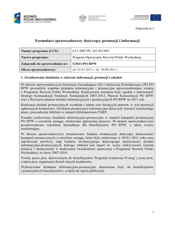 Załącznik nr 2 Formularz sprawozdawczy dotyczący promocji i informacji Numer programu (CCI): CCI 2007 PL 161 PO 003 Nazwa programu: Program Operacyjny Rozwój Polski Wschodniej Załącznik do sprawozdania nr: I/2011/PO RPW Okres sprawozdawczy: od: 01.01.2011 r. do: 30.06.2011 r. 1. Zrealizowane działania w zakresie informacji, promocji i szkoleń W okresie sprawozdawczym Instytucja Zarządzająca (IZ) i Instytucja Pośrednicząca (IP) PO RPW prowadziły wspólne działania informacyjne i promocyjne upowszechniające wiedzę o Programie Rozwój Polski Wschodniej. Realizowane działania były zgodne z założeniami Strategii Komunikacji Funduszy Europejskich 2007-2013, Planem Komunikacji PO RPW oraz z Rocznym planem działań informacyjnych i promocyjnych PO RPW na 2011 rok. Realizacja działań promocyjnych wynikała z planu oraz bieżących potrzeb, w tym promocji ogłaszanych konkursów. Działania promocyjno-informacyjne dotyczyły również monitoringu prasy, prowadzenia Infolinii w ramach Informatorium PARP. Ponadto realizowano działania informacyjno-promocyjne w ramach kampanii promocyjnej PO RPW o szerokim zasięgu, emitowano ogłoszenia prasowe. W okresie sprawozdawczym przeprowadzono szkolenia, konsultacje dla beneficjentów PO RPW, a także wizyty monitorujące. W okresie sprawozdawczym zrealizowano badania ewaluacyjne dotyczące skuteczności kampanii promocyjnych o szerokim zasięgu, które były emitowane w 2010 i 2011 roku oraz zakończono pierwszy etap badania ewaluacyjnego dotyczącego skuteczności działań informacyjno-promocyjnych, którego efektem jest raport nt. oceny efektywności ścieżek dotarcia i skuteczności w budowaniu świadomości społecznej o Programie Rozwój Polski Wschodniej, za okres 2007-2010. Trwały prace przy skierowanym do beneficjentów Programu konkursie Promuj z pomysłem, a także przy organizacji dwóch innych konkursów. Wykonywane działania informacyjno-promocyjne skierowane były do beneficjentów i potencjalnych beneficjentów, a także do opinii publicznej. 1 Tabela 1. Zrealizowane działania Lp. Opis działania Nazwa działania Informacja 1. Centralny Punkt Informacyjny w Warszawie 2. Punkty Konsultacyjne w całej Polsce W ramach działalności Infolinii PARP prowadzonej w ramach Informatorium odnotowano konsultacje, zapytania telefoniczne oraz zapytania e-mailowe dot. programu PO RPW. Najwięcej zapytań było w przypadku działania I.3 Wspieranie innowacji, działania I.4 Promocja i Współpraca oraz działania III.2. Infrastruktura turystyki kongresowej i targowej. Dynamika liczby konsultacji oraz ich zakres i tematyka były skorelowane z harmonogramem ogłaszanych konkursów w ramach Programu. Ponadto beneficjenci kontaktowali się w celu wyjaśnienia szczegółowych zagadnień związanych z danym działaniem, które polegały na przedłożeniu aktów prawnych dotyczących przeprowadzenia konkursu i Wytycznych w zakresie kwalifikowania wydatków w ramach PO RPW 2007- 2013. W okresie sprawozdawczym, w ramach zorganizowanej przez PARP sieci Krajowego Systemu Usług dla MSP, funkcjonowały na terenie całej Polski Punkty Konsultacyjne. Punkty Konsultacyjne, prowadzone przez podmioty zarejestrowane w KSU dla MSP świadczyły bezpłatne usługi informacyjne dla przedsiębiorców oraz osób zamierzających rozpocząć działalność gospodarczą z zakresu szeroko rozumianego rozwoju przedsiębiorczości oraz dostępnych form wsparcia dla przedsiębiorców, w tym w zakresie PO RPW. 3. Główne Punkty Informacyjne oraz Lokalne Punkty Informacyjne działające w ramach Systemu Informacji o Funduszach Europejskich. W okresie sprawozdawczym IZ PO RPW współpracowała z głównym Punktem Informacyjnym oraz Lokalnymi Punktami Informacyjnymi m.in. dostarczając materiały informacyjno-promocyjne o PO RPW. 4. Kampania informacyjna dot. konkursów ogłaszanych w 2011 r. w ramach PO RPW W okresie sprawozdawczym opublikowano ogłoszenia ogólnopolskie („Gazeta Wyborcza”) oraz ogłoszenia w gazetach regionalnych woj. podkarpackiego oraz warmińsko-mazurskiego („Nowiny”, „Gazeta Olsztyńska Dziennik Elbląski”) Promocja 1. Kampania promocyjna PO RPW o szerokim zasięgu Kampania promocyjna PO RPW o szerokim zasięgu była powtórką kampanii realizowanej wspólnie z IK NSRO w 2010 r. Cała kampania została zrealizowana zgodnie z planem tj. w okresie maj-czerwiec 2011r., a część dotycząca PO RPW w maju 2011 r. Wiodącym medium była komunikację telewizyjną. telewizja, radio wspierało Celem głównym etapu poświęconego PO RPW było zaprezentowanie przemian zachodzących w Polsce Wschodniej dzięki inwestycjom z PO RPW oraz pokazanie, że Polska Wschodnia staje się dynamicznie rozwijającą i nowoczesną gospodarką, miejscem do inwestowania, pracy i studiowania. 2. Konkurs Promuj z pomysłem Działanie było kontynuacją rozpoczętej w 2010 r. inicjatywy obejmującej szkolenia, wymianę dobrych praktyk oraz organizację konkursu dla beneficjentów PO RPW na najlepszą promocję projektu realizowanego w ramach Programu. Działanie przebiegało zgodnie z planem, ocenie podlegały 2 działania promocyjne zrealizowane przez beneficjentów PO RPW w okresie od 1 października 2010 r. do 31 maja 2011 r. Trwa przygotowanie publikacji Promuj z pomysłem. Podręcznik dobrych praktyk. Konkurs zakończy się 18 października 2011 r., kiedy to odbędzie się konferencja podsumowująca i wręczenie nagród laureatom wybranym w lipcu 2011 r. przez kapitułę konkursu. 3. Konkurs Nie przegap zmian na wschodzie II edycja Działanie miało objąć przeprowadzenie konkursu dla dziennikarzy z pięciu województw Polski Wschodniej oraz dziennikarzy ogólnopolskich. Konkurs miał być kontynuacją przeprowadzonego na przełomie 2009 i 2010 r. konkursu Nie przegap zmian na wschodzie. Działanie zostało zmodyfikowane, planowane jest zorganizowanie na przełomie września i października 2011 r. dwóch lokalnych wizyt studyjnych dziennikarzy regio