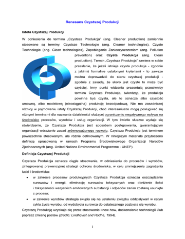 Renesans Czystszej Produkcji Istota Czystszej Produkcji W odniesieniu do terminu „Czystsza Produkcja” (ang. Cleaner production) zamiennie stosowane są terminy: Czystsze Technologie (ang. Cleaner technologies), Czyste Technologie (ang. Clean technologies), Zapobieganie Zanieczyszczeniom (ang. Pollution prevention) oraz Czysta Produkcja (ang. Clean production). Termin „Czystsza Produkcja” zawiera w sobie przesłanie, Ŝe jeŜeli istnieje czysta produkcja - zgodnie z jakimiś formalnie ustalonymi kryteriami - to zawsze moŜna doprowadzić do stanu czystszej produkcji zgodnie z zasadą, Ŝe skoro jest czysto to moŜe być czyściej. Inny punkt widzenia prezentują przeciwnicy terminu Czystsza Produkcja, twierdząc, Ŝe produkcja powinna być czysta, ale to oznacza albo czystość umowną, albo modelową (nieosiągalną) produkcję bezodpadową. Nie ma zasadniczej róŜnicy w pojmowaniu istoty Czystszej Produkcji, choć interesariusze mogą posługiwać się róŜnymi terminami dla nazwania działalności słuŜącej ograniczeniu negatywnego wpływu na środowisko procesów, wyrobów i usług organizacji. W tym świetle słuszne wydaje się stwierdzenie, Ŝe Czystsza Produkcja jest sposobem postępowania, gwarantującym organizacji wdraŜanie zasad zrównowaŜonego rozwoju. Czystsza Produkcja jest terminem powszechnie stosowanym, ale róŜnie definiowanym. W niniejszym materiale przytoczono definicję opracowaną w ramach Programu Środowiskowego Organizacji Narodów Zjednoczonych (ang. United Nations Environmental Programme - UNEP). Definicja Czystszej Produkcji Czystsza Produkcja oznacza ciągłe stosowanie, w odniesieniu do procesów i wyrobów, zintegrowanej prewencyjnej strategii ochrony środowiska, w celu zmniejszenia zagroŜenia ludzi i środowiska: • w zakresie procesów produkcyjnych Czystsza Produkcja oznacza oszczędzanie surowców i energii, eliminację surowców toksycznych oraz obniŜenie ilości i toksyczności wszystkich emitowanych substancji i odpadów zanim zostaną usunięte z procesu; • w zakresie wyrobów strategia skupia się na ustaleniu związku oddziaływań w całym cyklu Ŝycia wyrobu, od wydobycia surowca do ostatecznego pozbycia się wyrobu. Czystszą Produkcję uzyskuje się przez stosowanie know-how, doskonalenie technologii i/lub poprzez zmianę postaw (źródło: Lindhqvist and Rodhe, 1994). 1 Odnowiona polityka przemysłowa Unii Europejskiej W Komunikacie Komisji Europejskiej z dnia 10 października 2012 r., zatytułowanym „Silniejszy przemysł europejski na rzecz wzrostu i oŜywienia gospodarczego” przedstawiono wizję rozwoju przemysłowego państw Unii w bieŜącej dekadzie. Utrzymujący się światowy kryzys finansowy wywiera presję na przemysł europejski - produkcja jest o około 10% niŜsza niŜ przed kryzysem. Zlikwidowano ponad 3 mln miejsc pracy w przemyśle. Niskie jest zaufanie konsumentów i przedsiębiorstw. Problemy w sektorze bankowym spowodowały utrudnienia w dostępie do finansowania. Unia Europejska musi w XXI w. przywrócić przemysłowi naleŜną mu rolę. Jest to jedyny sposób, by zapewnić zrównowaŜony wzrost gospodarczy, tworzyć wysokiej jakości miejsca pracy i rozwiązywać problemy społeczne. Aby to osiągnąć, potrzebna jest całościowa wizja, skupiająca się na inwestycjach i innowacjach, ale zakładająca zmobilizowanie wszelkich takŜe środków presji dostępnych na poziomie UE. W komunikacie proponuje partnerstwo między UE, się jej państwami członkowskimi i przemysłem, by zdecydowanie przyspieszyć inwestycje w nowe technologie i stworzyć dla Europy przewagę konkurencyjną w nowej rewolucji przemysłowej. Po przeprowadzeniu konsultacji społecznych Komisja Europejska zaproponowała ukierunkowanie inwestycji i innowacji na sześć priorytetowych obszarów działania, obejmujących: 1) Rynki zaawansowanych technologii produkcyjnych w zakresie czystej produkcji Istotnym elementem nowej rewolucji przemysłowej są zaawansowane technologie produkcyjne, które umoŜliwiają czystą produkcję. Fabryki jutra będą stosować wysoce energo- i materiałooszczędne procesy oraz wykorzystywać materiały odnawialne i pochodzące z recyklingu, a takŜe coraz częściej przyjmować zrównowaŜone modele biznesowe, takie jak symbioza przemysłowa mająca na celu odzyskanie materiałów oraz rozproszonego ciepła i energii. 2 2) Rynki kluczowych technologii wspomagających Prognozuje się, Ŝe światowy rynek kluczowych technologii wspomagających, który obejmuje mikro- i nanoelektronikę, materiały zaawansowane, biotechnologię przemysłową, fotonikę, nanotechnologię oraz zaawansowane systemy produkcyjne, wzrośnie o ponad 50% z 646 mld EUR do ponad 1 bln EUR w 2015 r., co stanowi około 8% unijnego PKB. Unia Europejska jest światowym liderem w dziedzinie badań i rozwoju w zakresie kluczowych technologii wspomagających i posiada ponad 30% patentów w tej dziedzinie. Jednak w przeszłości UE nie była w stanie przejść od etapu badań do wprowadzenia na rynek towarów i usług tak szybko jak jej partnerzy handlowi. 3) Rynki bioproduktów Bioprzemysł wykorzystuje zasoby odnawialne lub stosuje bioprocesy w procesach produkcyjnych. Bioprodukty oferują szereg korzyści dla konkurencyjności przemysłowej i środowiska naturalnego. W porównaniu z procesami wykorzystującymi paliwa kopalne większość biologicznych procesów produkcyjnych zakłada zuŜycie mniejszej ilości energii, emisję mniejszej ilości dwutlenku węgla (CO2) i lotnych związków organicznych (LZO) oraz wytwarzanie mniejszej ilości toksycznych odpadów. Procesy te mogą przyczynić się zarówno do obniŜenia kosztów produkcji, jak i zwiększenia efektywności środowiskowej. Wzrost wielkości unijnej produkcji bioproduktów chemicznych do 2020 r., w tym biologicznych tworzyw sztucznych, biologicznych środków smarnych, biorozpuszczalników, biologicznych środków powierzchniowo czynnych i półproduktów (surowców) chemi