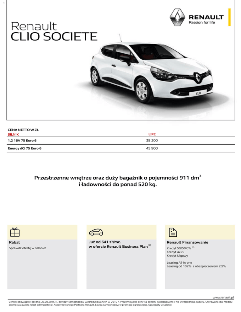 4 CENA NETTO W ZŁ SILNIK LIFE 1.2 16V 75 Euro 6 38 200 Energy dCi 75 Euro 6 45 900 Przestrzenne wnętrze oraz duży bagażnik o pojemności 911 dm3 i ładowności do ponad 520 kg. Rabat Sprawdź ofertę w salonie! Już od 641 zł/mc. (2) w ofercie Renault Business Plan Renault Finansowanie Kredyt 50/50 0% (2) Kredyt 4x25 Kredyt Ulgowy Leasing All-in-one Leasing od 102% z ubezpieczeniem 2,9% Cennik obowiązuje od dnia 28.08.2015 r., dotyczy samochodów wyprodukowanych w 2015 r. Prezentowane ceny są cenami katalogowymi i nie uwzględniają rabatu. Oferowana dla modelu promocja zawiera rabat od Importera i Autoryzowanego Partnera Renault. Liczba samochodów w promocji ograniczona. Szczegóły w salonie. LIFE BEZPIECZEŃSTWO CZYNNE I BIERNE ABS z systemem wspomagania nagłego hamowania Przednie poduszki powietrzne kierowcy i pasażera Dezaktywacja poduszki powietrznej pasażera z przodu Boczne poduszki powietrzne Regulator - ogranicznik prędkości System wspomagania ruszania pod górę (Hill Start Assist) System dynamicznej kontroli toru jazdy (ESC) z funkcją zapobiegania poślizgowi kół pędnych przy ruszaniu (ASR) ● ● ● ● ● ● Sygnał niezapiętych pasów bezpieczeństwa Przednie pasy bezpieczeństwa z regulacją wysokości, ogranicznikiem napięcia i napinaczem ● ● ● WYGLĄD ZEWNĘTRZNY Zderzak przedni i tylny w kolorze nadwozia ● Górna listwa ozdobna chłodnicy w kolorze lśniącej czerni z chromowanym logo Renault ● Boczne listwy ochronne i listwa zderzaka tylnego w kolorze czarnym o ziarnistej fakturze ● Obudowa lusterek bocznych w kolorze czarnym Przednie zewnętrzne klamki drzwi w kolorze czarnym Tylne zewnętrzne klamki drzwi ukryte przy tylnym słupku Tylny spojler dachowy Stalowe obręcze kół 15", wzór Extreme Lakier metalizowany / metalizowany specjalny Lakier niemetalizowany / niemetalizowany specjalny ● ● ● ● ● 1545/1707 0/528 WYGLĄD WNĘTRZA Tonacja grafitowa wnętrza Tapicerka czarno-czerwona Fortunate Wewnętrzne klamki drzwi chromowane ● ● ● WIDOCZNOŚĆ I OŚWIETLENIE Światła przeciwmgłowe Światła do jazdy dziennej z diodami LED Lusterka boczne regulowane elektrycznie, podgrzewane, z czujnikiem temperatury zewnętrznej P Wycieraczki przednie o zmiennej częstotliwości pracy Automatyczne włączanie tylnej wycieraczki podczas cofania P ● ● ● LIFE PROWADZENIE POJAZDU i URZĄDZENIA KONTROLNE Karta Renault sterująca zdalnie centralnym zamkiem i służąca do uruchamiania auta (zamiast kluczyka) ● Elektryczne, zmienne wpomaganie układu kierowniczego System kontroli ciśnienia w oponach Kierownica z regulacją wysokości i głębokości Komputer pokładowy Zespół wskaźników analogowo-cyfrowych Wskaźnik zmiany biegów Autostradowy tryb pracy kierunkowskazów Zestaw do naprawy uszkodzenia opony Koło zapasowe ● ● ● ● ● ● ● ● 252 KOMFORT Klimatyzacja manualna Szyby przednie regulowane elektrycznie Osłona przeciwsłoneczna z zamykanym lusterkiem po stronie kierowcy Osłona przeciwsłoneczna po stronie pasażera bez lusterka Fotel kierowcy z regulacją wysokości Zagłówki przednie z regulacją wysokości Przegroda oddzielająca część pasażerską od ładunkowej 1626/P ● ● ● ● ● ● MULTIMEDIA Instalacja do montażu radioodtwarzacza ● System Renault BASS REFLEX ● Radioodtwarzacz 2x20W, zintegrowany wyświetlacz, Bluetooth®, gniazdo USB i jack System multimedialny MEDIA NAV EVOLUTION*: z ekranem dotykowym 7", nawigacją, radioodtwarzaczem 4x20W, Bluetooth® , gniazdem USB i jack P P PAKIETY Pakiet Klimat: klimatyzacja manualna, radioodtwarzacz z Bluetooth®, złącze USB i Jack oraz Bass Reflex 2358 Pakiet Komfort: klimatyzacja manualna, system multimedialny MediaNav Evolution* z ekranem dotykowym 7", nawigacją, radioodtwarzaczem z Bluetooth®, złączem USB i Jack oraz Bass Reflex 4065 Pakiet PLUS: światła przeciwmgłowe, wycieraczki o zmiennej częstotliwości pracy 407 * Dla samochodów produkowanych do T.35 - Media Nav ● = seryjnie P = element pakietu - = niedostępne Niektóre opcje wymagają zamówienia dodatkowego wyposażenia opcjonalnego lub wykluczają się wzajemnie. Szczegóły u Autoryzowanych Partnerów Renault. SILNIKI 1.2 16V 75 Energy dCi 75 mechaniczna 5-biegowa mechaniczna 5-biegowa Euro 6 1 149 wielopunktowy sekwencyjny benzyna Euro 6 1 461 bezpośredni z Common Rail diesel wolnossący, wielopunktowy sekwencyjny turbo, wtrysk bezpośredni z common rail 54 (73) przy 5500 55 (75) przy 4000 Maksymalny moment obrotowy Nm EWG przy (obr./min) 107 przy (4250) 200 przy (1750) Stop & Start i układ odzyskiwania energii podczas hamowania Układ kierowniczy Wymiary opon standardowych tak zmienne elektryczne wspomaganie układu kierowniczego (w standardzie) 15” : 185 / 65 R15 88T Typ skrzyni biegów Norma emisji spalin Pojemność skokowa (cm3) Rodzaj wtrysku Rodzaj paliwa Typ silnika Moc maksymalna w kW EWG (KM) przy (obr./min) OSIĄGI Prędkość maksymalna (km/h) 0 - 100 km/h (s) 400 m ze startu zatrzymanego / 1000 m ze startu zatrzymanego (s) 167 14"5 19”5 / 36”1 168 14"0 19”1 / 35”8 128 7,2/4,7/5,6 85 3,5/3,1/3,3 ZUŻYCIE PALIWA I EMISJA CO2 Emisja CO2 (g/km) Cykl miejski / pozamiejski / mieszany (l/100 km) POJEMNOŚĆ BAGAŻNIKA VDA 3 563 Pojemność bagażnika (VDA) w dm do wysokości tylnej półki POJEMNOŚĆ 45 Pojemność paliwa (I) MASA (KG) Masa własna pojazdu (bez opcji) 1 060 1 149 Dopuszczalna masa całkowita (DMC) 1 566 1 670 Dopuszczalna masa całkowita z przyczepą 2 466 2 570 900 900 Maksymalna masa przyczepy hamowanej (w granicach maksymalnej masy zestawu przyczepowego) Niniejsza oferta jest wyłącznie informacją handlową i nie stanowi oferty w rozumieniu przepisów kodeksu cywilnego. Czas promocji i liczba samochodów objętych promocją ograniczone. Podane ceny obejmują podatek VAT (23%). Niniejszy cennik anuluje wszystkie poprzednie edycje. Dane techniczne mogą ulec zmianie w zależności od wyposażenia samochodu. Zużycie pal