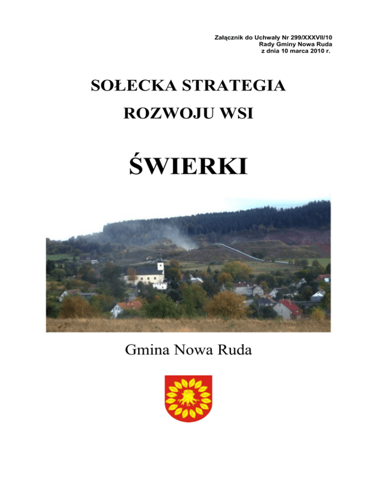 Załącznik do Uchwały Nr 299/XXXVII/10 Rady Gminy Nowa Ruda z dnia 10 marca 2010 r. SOŁECKA STRATEGIA ROZWOJU WSI ŚWIERKI Gmina Nowa Ruda Świerki, październik 2009 2 Spis treści 1. 2. 3. 4. 5. 6. 7. 8. Wprowadzenie ....................................................................................... Analiza zasobów ................................................................................... Analiza SWOT ...................................................................................... Analiza potencjału rozwojowego wsi .................................................... Wizja wsi ............................................................................................... Program długoterminowy ...................................................................... Program krótkoterminowy ..................................................................... Zdjęcia ................................................................................................... 2 3 6 7 8 8 12 13 1. Wprowadzenie Niniejszy dokument został sporządzony metodą warsztatową jako jeden z elementów programu Urzędu Marszałkowskiego Województwa Dolnośląskiego „Odnowa Wsi Dolnośląskiej”. Program ma na celu pobudzić, ożywić i wspierać inicjatywę mieszkańców wsi i małych miasteczek ukierunkowaną na rozwój niewielkich społeczności lokalnych i ich miejscowości. Na stronie internetowej programu (http://www.umwd.dolnyslask.pl/index.php?id=534) czytamy: „Program ten jest odpowiedzią na „umiastowienie” wsi, skierowany na oddolną mobilizację zasobów wiejskich. (...) Celem zainicjowania programu regionalnego była konieczność podjęcia działań na rzecz integracji społeczności wiejskich, waloryzacji przestrzeni wsi w zakresie infrastruktury technicznej i społecznej, krajobrazu, architektury i usług oraz realizacja przedsięwzięć podnoszących standard życia. Efektem miały być lepsze warunki do osiedlania, inwestowania, rozwoju usług, tworzenia miejsc pracy oraz zarobkowania poza rolnictwem”. Strategia Sołecka służyć ma więc rozwojowi wsi poprzez uporządkowanie działań podejmowanych przez społeczność lokalną, a w szczególności działań Grupy Odnowy Wsi tak, aby były one nie tylko możliwie jak najskuteczniejsze i najefektywniejsze, ale również aby pomagały utrzymać równowagę rozwoju wszystkich aspektów życia na wsi. Uporządkowanie działań opierać się powinno na stanowiących kluczową część strategii dwóch planach – długoterminowym i krótkoterminowym. Oba plany prowadzą do urzeczywistnienia zawartej w strategii wizji. Wizja to długi – opisowy, lub bardzo krótki – sloganowy opis stanu społeczności lokalnej i jej miejscowości, jaki chcemy osiągnąć poprzez zaplanowane projekty i działania. Oba plany wskazują, w jaki sposób i jakimi środkami będziemy starali się go osiągnąć. Aby zarówno wizja, jak i plany były realne i możliwe do realizacji, tworzenie wizji i proces planowania poprzedzono trójstopniową analizą (analiza zasobów, analiza SWOT w odniesieniu do stanu teraźniejszego z podziałem na czynniki wpływające na rozwój wsi wewnętrzne i zewnętrzne, oraz analiza potencjału rozwojowego wskazującego proporcje pomiędzy poziomem rozwoju wszystkich 4 obszarów życia wiejskiego). Plan długoterminowy jest planem ogólniejszym - realizację wymienionych tu zadań przewiduje się na minimum 10 lat! – jednak odnosi się bezpośrednio do wszystkich 4 sfer życia. Plan krótkoterminowy powinien zostać zrealizowany w ciągu 1 roku – maksymalnie do 3 lat. Nad strategią w ramach warsztatów pracowali: 1. 2. 3. 4. 5. Wacław Łukasiewicz - Lider Grupy Odnowy Wsi, Sołtys Bogusława Herter - Członek Grupy Odnowy Wsi Zofia Bulanda – Członek Grupy Odnowy Wsi Urszula Tomiałowicz - Członek Grupy Odnowy Wsi Wojciech Przybysz - Członek Grupy Odnowy Wsi Warsztaty prowadziły: 1. Ewa Górska – moderator 2. Izabela Zamirska – Rajek – moderator 3 2. Analiza zasobów dla wsi Świerki Świerki ANALIZA ZASOBÓW CZ I Znaczenie zasobu Rodzaj zasobu 1 Przyrodniczy -walory krajobrazu, rzeźby terenu..................... -stan środowiska................................................ -walory klimatu.................................................. (odpowiednio wstaw X) Opis (nazwanie) zasobu jakim wieś dysponuje Małe Duże 2 3 4 Przepiękne Wzgórza z wieżą widokową Skażone przez kamieniołomy – w górnej części wsi. X X X -walory szaty roślinnej........................................ Swoisty mikroklimat – Świerki Dolne Storczyki, lilia złotogłów, arnika -cenne przyrodniczo obszary lub obiekty.......... Torfowisko z okresu zlodowacenia X -świat zwierzęcy (ostoje, siedliska)................... Bocian czarny, puchacz Rzeka Włodzica X X wody podziemne zanikły wskutek działalności kamieniołomów 5 i 6 klasy –górskie , łąki i pastwiska Kamień melafir do budowy dróg X X X -wody powierzchniowe (cieki, rzeki, stawy)....... -wody podziemne............................................... -gleby................................................................. -kopaliny............................................................ -walory geotechniczne....................................... ........................................................................... ............................................................................ Wyróżniające 5 X X Równolegle przebiegające 2 tunele kolejowe, które powstały: jeden w 1880, a drugi w latach 1907-1912—drugi co długości w Polsce X Kulturowy -walory architektury ............................................ -walory przestrzeni wiejskiej publicznej............... Budynki gospodarczo-mieszkalne, wiele z dziewiętnastego wieku X X -walory przestrzeni wiejskiej prywatnej ............. -zabytki i pamiątki historyczne .......................... -osobliwości kulturowe....................................... -