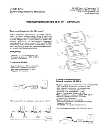 87-100 Toruñ, ul. Turystyczna 74 tel./fax (0-56) 648 91 33, 648 91 14 e-mail:[email protected] www.dremeko.pl DREM-EKO Biuro Konsultingowo-Handlowe PRZETWORNIKI SYGNA£U SERII MP - MICROPACE ™ Zastosowanie przetwornika Micropace™ Jest to wytrzyma³y mechanicznie, tani modu³ kontrolny, daj¹cy mo¿liwoœæ proporcjonalnej regulacji wydajnoœci pomp dozuj¹cych LMI serii A7/A9/B7/B9/C7/C9. Regulacja ta mo¿e nastêpowaæ w wyniku mno¿enia (MP-500-M), dzielenia (MP-400-D) lub bezpoœredniej odpowiedzi proporcjonalnej na sygna³ pr¹dowy 4-20 mA (MP-100). Kompaktowy modu³ przetwornika posiada klasê ochrony IP65, zasilany jest przez pompê oraz posiada okablowanie, aby umo¿liwiæ szybk¹ i ³atw¹ instalacjê. L MI N ROY MILTO PACE MICRCOONVERTER A/D MODEL : MP-10 LMI ROY MILTON PACE MICRIGOIT DIVIDER Specyfikacja 4D : MP-4 MODEL * Zasilanie: 15 VDC (przez pompê LMI) * Temperatura otoczenia (-20oC do 60oC) * Wymiary 94x60x25mm 0 00D LMI Przetwornik MP-100 ROY MILTON PACENTROLLER MICR/BO O ATCH C MULTIP * Sygna³ wejœciowy: 4-20 mA, izolowany * Impedancja wejœciowa: 100 omów * Max. napiêcie wejœciowe: 42 VDC * Wyjœcie: 0-100 imp./min. LIER MODEL 0M : MP-50 Dzielnik impulsów MP-400-D Mno¿nik impulsów MP-500-M 4-20mA MICROPACE MP-100 * Sterowanie MP-100 w uk³adzie pêtli pr¹dowej 4-20mA * Sygna³ wejœciowy: zwieranie styków lub otwarty kolektor - ON (zamkniêty) rezystancja: 5 kiloomów max - OFF (otwarty) rezystancja: 100 kiloomów min - Minimalny czas zamkniêcia ON: 10 ms - Minimalny czas otwarcia OFF: 20 ms * Zakres mno¿enia lub dzielenia: 1-1023 * Max czêstotliwoœæ wejœciowa: 30 Hz (MP-400-D) * MP-500-D zale¿y od wartoœci mno¿enia Cykl musi byæ zakoñczony * Sygna³ wyjœciowy: zwieranie styków - MP-400-D: zale¿ny od czêstotliwoœci wejœciowej i wartoœci dzielenia - MP-500-M: 100 impulsów/min (ustalone) * Schemat typowej instalacji MP-400-D/MP-500-M MP-100 MP-100 MP-100 4-20mA MP-400-D MP-500-M 87-100 Toruñ, ul. Turystyczna 74 tel./fax (0-56) 648 91 33, 648 91 14 e-mail:[email protected] www.dremeko.pl DREM-EKO Biuro Konsultingowo-Handlowe Monta¿ Metoda impulsowania MP-400-D i MP-500-M MP-100 1. 2. 3. Prze³¹cznik Przed pod³¹czeniem przetwornika od³¹czyæ zasilanie urz¹dzenia, od którego pochodzi sygna³. W³o¿yæ wtyczkê 4-pinow¹ przetwornika do pompy LMI. Gniazdo umiejscowione jest pod panelem kontrolnym. Pompa musi znajdowaæ siê w zewnêtrznym trybie pracy (EXTERNAL). MP-400-D MP-500-M Tranzystor NPN Pod³¹czyæ drugi przewód do Ÿród³a sygna³u. Polaryzacja jest nastêpuj¹ca: (+) bia³y, (-) czarny. MP-400-D MP-500-M MP-400-D / MP-500-M 1. 2. 3. Przetworniki MP-400-D oraz MP-500-M mog¹ zostaæ nastawione zarówno przed pod³¹czeniem ich do pompy lub Ÿród³a sygna³u, jak i po pod³¹czeniu. Otworzyæ pokrywê przetwornika poprzez odkrêcenie czterech œrubek przytwierdzaj¹cych pokrywê. Nastawiæ wartoœæ dzielenia lub mno¿enia za pomoc¹ ma³ych prze³¹czników DIP. Aby poznaæ nastawion¹ wartoœæ nale¿y zsumowaæ wartoœci wszystkich prze³¹czników przesuniêtych na prawo (ON). Do przesuwania prze³¹czników mo¿na u¿ywaæ d³ugopisu lub ma³ego œrubokrêta. Na przyk³adzie poni¿ej ustawiona jest wartoœæ 13 (1+4+8=13). Pozwala to na ustawienie dowolnej wartoœci w zakresie 1-1023. Tranzystor PNP MP-400-D MP-500-M Optoizolator MP-400-D MP-500-M Tranzystor musi mieæ obci¹¿alnoœæ minimum 2mA, 15V Wymiary 1 0,6m 94 MICROPACE 4. Zamontowaæ ponownie pokrywê oraz œrubki. 5. Postêpowaæ jak z przetwornikiem MP-100, & 2 i 3. DOSAPRO MILTON ROY 3m 25 60 0 1 2 4 8 16 32 64 128 256 512