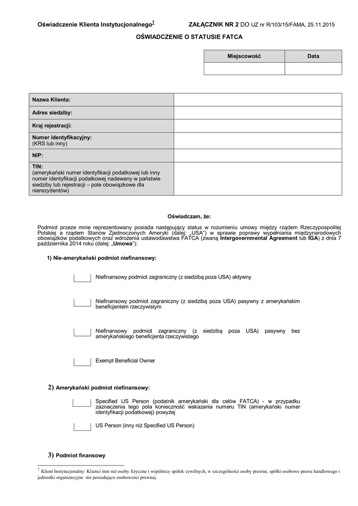 Oświadczenie Klienta Instytucjonalnego1 ZAŁĄCZNIK NR 2 DO UZ nr R/103/15/FAMA, 25.11.2015 OŚWIADCZENIE O STATUSIE FATCA Miejscowość Data Nazwa Klienta: Adres siedziby: Kraj rejestracji: Numer identyfikacyjny: (KRS lub inny) NIP: TIN: (amerykański numer identyfikacji podatkowej lub inny numer identyfikacji podatkowej nadawany w państwie siedziby lub rejestracji – pole obowiązkowe dla nierezydentów) Oświadczam, że: Podmiot przeze mnie reprezentowany posiada następujący status w rozumieniu umowy między rządem Rzeczypospolitej Polskiej a rządem Stanów Zjednoczonych Ameryki (dalej: „USA”) w sprawie poprawy wypełniania międzynarodowych obowiązków podatkowych oraz wdrożenia ustawodawstwa FATCA (zwaną Intergovernmental Agreement lub IGA) z dnia 7 października 2014 roku (dalej: „Umowa”): 1) Nie-amerykański podmiot niefinansowy: Niefinansowy podmiot zagraniczny (z siedzibą poza USA) aktywny Niefinansowy podmiot zagraniczny (z siedzibą poza USA) pasywny z amerykańskim beneficjentem rzeczywistym Niefinansowy podmiot zagraniczny (z siedzibą amerykańskiego beneficjenta rzeczywistego poza USA) pasywny bez Exempt Beneficial Owner 2) Amerykański podmiot niefinansowy: Specified US Person (podatnik amerykański dla celów FATCA) - w przypadku zaznaczenia tego pola konieczność wskazania numeru TIN (amerykański numer identyfikacji podatkowej) powyżej US Person (inny niż Specified US Person) 3) Podmiot finansowy 1 Klient Instytucjonalny: Klienci inni niż osoby fizyczne i wspólnicy spółek cywilnych, w szczególności osoby prawne, spółki osobowe prawa handlowego i jednostki organizacyjne nie posiadające osobowości prawnej. Registered Deemed-Compliant Financial Institution lub Certified Deemed-Compliant Financial Institution Uczestnicząca Instytucja Finansowa Nieuczestnicząca Instytucja Finansowa Uwaga: Prosimy o zapoznanie się z definicjami poszczególnych kategorii podmiotów instytucjonalnych umieszczonych w pkt II Informacji Dodatkowej do niniejszego oświadczenia oraz z konsekwencjami niezłożenia oświadczenia wskazanymi w pkt. I.3. Informacji Dodatkowej do niniejszego oświadczenia W przypadku zaznaczenia w pkt. 3 kategorii Uczestnicząca Instytucja Finansowa lub Registered Deemed-Compliant Financial Institution, prosimy podać numer identyfikacji GIIN Oświadczenia: Wiarygodność powyższych danych stwierdzam własnoręcznym podpisem. Oświadczam, że informacje zawarte w przedstawionych przeze mnie dokumentach są zgodne ze stanem faktycznym i prawnym. Jestem świadomy/a odpowiedzialności karnej za złożenie fałszywego oświadczenia. Oświadczam, iż zostałem poinformowany, że w przypadku zmiany statusu wskazanego w oświadczeniu, jestem zobowiązany złożyć nowe oświadczenie zgodne z nowym stanem faktycznym i prawnym. Podpisy osoby/ osób upoważnionych do reprezentowania Klienta ADNOTACJE Banku Tożsamość osoby/ osób uprawnionych do reprezentowania Klienta i własnoręczność podpisu stwierdzam: Pieczęć funkcyjna i podpis pracownika Banku Informacja dodatkowa I. Bank informuje, że: 1. Zgodnie z art. 4 ust. 1 lit. a Umowy, złożenie oświadczenia o statusie FATCA klienta instytucjonalnego (wypełnienie pola „Specified US Person - podatnik amerykański dla celów FATCA”), pola „Niefinansowy podmiot zagraniczny pasywny z amerykańskim beneficjentem rzeczywistym” (beneficjenta rzeczywistego będącego podatnikiem USA) lub pola „Nieuczestnicząca instytucja finansowa”, nakłada na Bank obowiązki sprawozdawcze w zakresie przekazywania do organów administracji podatkowej USA (za pośrednictwem organów podatkowych Rzeczypospolitej Polskiej) danych dotyczących rachunku i jego Posiadacza, wskazanych w art. 2 ust. 2 lit. a Umowy (w tym wielkości posiadanych aktywów). 2. Niezależnie od złożenia oświadczenia odmiennego niż wskazane w pkt I.1. powyżej, Bank zobowiązany jest do weryfikacji wiarygodności oświadczenia. W przypadku stwierdzenia przesłanek poddających w wątpliwość wiarygodność oświadczenia, Bank zobowiązany jest do wykonania obowiązków sprawozdawczych wskazanych w pkt I.1 powyżej. W celu weryfikacji wiarygodności oświadczenia Bank może wystąpić z prośbą o dostarczenie dodatkowych dokumentów potrzebnych do weryfikacji. 3. Zgodnie z art. 4 Ustawy z dnia 9 października 2015 roku o wykonywaniu Umowy między Rządem Rzeczypospolitej Polskiej a Rządem Stanów Zjednoczonych Ameryki w sprawie poprawy wypełniania międzynarodowych obowiązków podatkowych oraz wdrożenia ustawodawstwa FATCA złożenie oświadczenia jest obowiązkowe. Niniejsze oświadczenie zachowuje swoją ważność do momentu złożenia nowego oświadczenia. II. Definicje kategorii instytucji: 1. Niefinansowy podmiot zagraniczny (z siedzibą poza USA) aktywny Podmioty uznawane za Niefinansowy podmiot zagraniczny (z siedzibą poza USA) aktywny to podmiot spełniający jedną z poniższych przesłanek: 1) mniej niż 50% dochodu brutto Klienta w poprzednim roku kalendarzowym albo innym odpowiednim okresie sprawozdawczym stanowi dochód pasywny oraz mniej niż 50% aktywów posiadanych w poprzednim roku kalendarzowym albo innym odpowiednim okresie sprawozdawczym stanowią aktywa, które generują dochód pasywny lub są utrzymywane w takim celu; 2) akcje Klienta są notowane na rynku papierów wartościowym lub Klient jest powiązany w rozumieniu FATCA z podmiotem, którego akcje są notowane na rynku papierów wartościowych; 3) Klient został zarejestrowany na Terytorium Samoa Amerykańskiego, Marianów Północnych, Guam, Puerto Rico lub Amerykańskich Wysp Dziewiczych oraz wszyscy beneficjenci płatności są rezydentami ww. terytoriów; 4) Klient jest zagranicznym rządem lub jakąkolwiek jego częścią, w tym także władzą samorządową, rządem amerykańskich terytoriów zależnych, organizacją międzynarodowa, zagranicznym (nieamerykańskim) bankiem centralnym lub podmiotem całkowicie zależnym od ww. podmiot