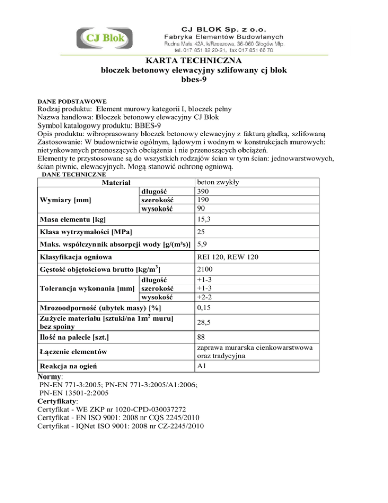 KARTA TECHNICZNA bloczek betonowy elewacyjny