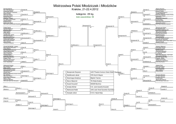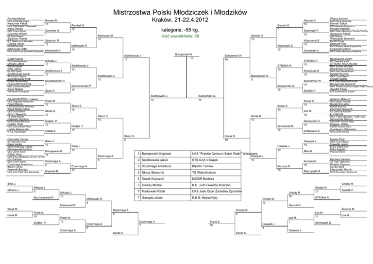 Mistrzostwa Polski Młodziczek i Młodzików Rombel Michał UKJ -AON Warszawa Kostuniak Patryk UKS "PAPIEŻKA" Włocławek Kalus Dorian Kraków, 21-22.4.2012 Rombel M. 10 Rombel M. 10 Dzwonka H. 1 GKS Czarni Bytom Dzwonka Hubert KS Start Radom Salamon Paweł Choma Oliwer MOSiR Bochnia Markowski Rafał UKS Judo Orzeł Żyrardów Żyrardów Gołąb Dawid Markowski R. Mikszta Jakub Polonia Rybnik Siłka Jakub Siedlikowski J. 10 KJ AZS Opole Siedlikowski Jakub STS Gryf-3 Słupsk Mucharzewski Piotr Mucharzewski P. 7 GSSiR Gorzów Wlkp. DUNAJSKI MICHAŁ MKS Juvenia Wrocław Sipos Norber Sipos N. Yamabushi Zakopane ZAJĄCZKOWSKI Łukasz UKS Targówek Warszawa Polok Marcin LKS Wyzwolenie Simoradz Wnęk Maksymilian Polok M. 10 Skocz Sławomir TS Wisła Kraków Gajewski Szymon Dulęba Piotr UKS Judo Sensei Płock Hatala Aleksander Ostrowski Cezary Bołoz Jacek SGKS Wybrzeże Gdańsk Maciejewski Krystian UKS Górnik Konin Górski Artur MKS Pałac Młodzieży Tarnów Tarnów Dyr Sambor Dziarmaga Arkadiusz Błękitni Tarnów Koperski Bartosz UKS Judo Fight Club Warszawa Siedlikowski J. 10 STROKA R. 10 Siedlikowski J. 10 Bukojemski W. 5 Mucharzewski P. 10 Bukojemski W. 10 Maciejewski K. 10 Serwaczak D. 10 Koperski B. Mikszta J. 5 Mucharzewski P. Gawęda J. 10 Dziarmaga A. 5 Dziarmaga A. 10 Mikszta J. 10 Markowski R. Markowski R. 5 Wnęk M. Polok M. Polok M. 10 Dulęba P. Kozak K. 10 1 Bukojemski Wojciech UKS "Praskie Centrum Sztuk Walki" Warszawa 2 Siedlikowski Jakub STS Gryf-3 Słupsk 3 Dziarmaga Arkadiusz Błękitni Tarnów 3 Skocz Sławomir TS Wisła Kraków 5 Kozak Krzysztof MOSiR Bochnia 5 Gniady Michał K.S. Judo Gwardia Koszalin 7 Markowski Rafał UKS Judo Orzeł Żyrardów Żyrardów 7 Gawęda Jakub K.K.S. Hejnał Kęty Dziarmaga A. 5 Polok M. 10 Dziarmaga A. Kozak K. Gawęda J. 10 Kuczera D. 10 Wojnowski S. 10 Gosiewski A. STROKA R. 10 Kowalczyk D. 10 Bukojemski W. 10 Świetlik P. Wojna Szymon UKS Olimp Nowa Sól Demski Oskar PTS Gwardia Bydgoszcz Poręba Mateusz MKS Pałac Młodzieży Tarnów Tarnów Szewczyk Patryk AZS Gliwice Wojnowski Sławomir KJ AZS Opole Esmund Piotr UKS Wolania Wola Rzędzińska Gosiewski Antoni MKS Pałac Młodzieży Katowice Banaszczyk Adam KS "Gwardia" Łódź STROKA RADOSŁAW MKS Juvenia Wrocław Kowalczyk Dominik UKS Judo Sensei Płock Drożdż Szymon GKS Czarni Bytom Gniady Michał K.S. Judo Gwardia Koszalin Bukojemski Wojciech UKS "Praskie Centrum Sztuk Walki" Warsza Świetlik Paweł LKS Szubinianka Szubin Andersz Mateusz UKS Dębiec Poznań Kozak Krzysztof MOSiR Bochnia Parcheta Wojciech KJ Samuraj Koszalin Łoś Michał MKS "Pałac Młodzieży - Łódź" Łódź Serwaczak D. 10 Groblewicz S. Gawęda J. 10 Serwaczak Dariusz AZS AWF Gorzów Wlkp. Pogoda Wiktor GSSiR Gorzów Wlkp. Groblewicz Sebastian UKS Olimp Rawicz Hołody Piotr GKS Czarni Bytom Gawęda Jakub K.K.S. Hejnał Kęty Mika Kajetan Mika K. Polonia Rybnik Kuczera D. 10 Mieczyński M. Kuczera Damian SS "Dąb" Dębowiec Kudyba Szymon KJ AZS Opole Mieczyński Marcin UKS Gimnazjon Suchy Las Gniady M. Gniady M. 10 Gniady M. 10 Skocz S. 10 Świetlik P. STROKA R. Andersz M. Gawęda J. 5 Skocz S. Gniady M. 10 Demski O. Gniady M. 5 Dziarmaga A. 7 Dziarmaga A. 5 Szewczyk P. 10 Łoś M. 10 Kozak K. 10 Bołoz J. 10 Demski O. 10 Kozak K. 10 Kozak K. 10 Siłka J. Mikszta J. Bukojemski W. 10 Skocz S. 5 Dziarmaga A. 5 GKS Czarni Bytom Bukojemski W. 10 Dulęba P. 10 Bołoz J. 10 KS "Gwardia" Łódź Bukojemski W. 10 Skocz S. 10 Hatala A. K.K.S. Hejnał Kęty Wojnowski S. 10 Skocz S. 10 Dulęba P. 10 MOS Zatoka Braniewo Demski O. 10 Markowski R. 10 Siedlikowski J. 10 Skocz S. 10 UKS Grot Kraków ilość zawodników: 56 Siedlikowski J. 10 Mikszta J. 10 TG Sokół Myślenice kategoria: -55 kg. Markowski R. 10 Salamon P. 10 K.S. MaKo Judo Wrocław Demski O. 7 Łoś M. 7 Gawęda J. Łoś M. 10 Serwaczak D. Łoś M.
