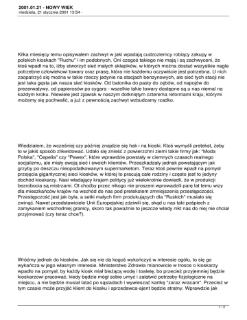 2001.01.21 - NOWY WIEK niedziela, 21 stycznia 2001 13:54 - Kilka miesięcy temu opisywałem zachwyt w jaki wpadają cudzoziemcy robiący zakupy w polskich kioskach "Ruchu" i im podobnych. Oni czegoś takiego nie mają i są zachwyceni, że ktoś wpadł na to, iżby stworzyć sieć małych sklepików, w których można dostać wszystkie nagle potrzebne człowiekowi towary oraz prasę, która nie każdemu oczywiście jest potrzebna. U nich zaopatrzyć się można w takie rzeczy jedynie na stacjach benzynowych, ale sieć tych stacji nie jest taka gęsta jak nasza sieć kiosków. Od batonika do pasty do zębów, od napojów do prezerwatywy, od papierosów po cygara - wszelkie takie towary dostępne są u nas niemal na każdym kroku. Niewiele jest zjawisk w naszym dotkniętym czterema reformami kraju, którymi możemy się pochwalić, a już z pewnością zachwyt wzbudzamy rzadko. Wiedziałem, że wcześniej czy później znajdzie się hak i na kioski. Ktoś wymyśli pretekst, żeby to w jakiś sposób zlikwidować. Udało się znieść z powierzchni ziemi takie firmy jak: "Moda Polska", "Cepelia" czy "Pewex", które wprawdzie powstały w ciemnych czasach realnego socjalizmu, ale miały swoją sieć i swoich klientów. Przeszkadzały jednak powstającym jak grzyby po deszczu nieopodatkowanym supermarketom. Teraz ktoś pewnie wpadł na pomysł przejęcia gigantycznej sieci kiosków, w której to pracują całe rodziny i często jest to jedyny dochód kioskarzy. Nasi władający krajem politycy już wielokrotnie dowiedli, że w produkcji bezrobocia są mistrzami. Ot choćby przez nikogo nie proszeni wprowadzili parę lat temu wizy dla mieszkańców krajów na wschód do nas pod pretekstem zmniejszenia przestępczości. Przestępczość jest jak była, a setki małych firm produkujących dla "Ruskich" musiało się zwinąć. Nawet przedstawiciele Unii Europejskiej zdziwili się, skąd u nas taki pośpiech z zamykaniem wschodniej granicy, skoro tak poważnie to jeszcze wtedy nikt nas do niej nie chciał przyjmować (czy teraz chce?). Wróćmy jednak do kiosków. Jak się nie da kogoś wykończyć w interesie ogółu, to się go wykańcza w jego własnym interesie. Ministerstwo Zdrowia mianowicie w trosce o kioskarzy wpadło na pomysł, by każdy kiosk miał bieżącą wodę i toaletę, bo przecież przyjemniej będzie kioskarzowi pracować, kiedy będzie mógł sobie umyć i załatwić potrzeby fizjologiczne na miejscu, a nie będzie musiał latać po sąsiadach i wywieszać kartkę "zaraz wracam". Przecież w tym czasie może przyjść klient do kiosku i sprzedawca-ajent będzie stratny. Wprawdzie jak 1/2 2001.01.21 - NOWY WIEK niedziela, 21 stycznia 2001 13:54 - pójdzie do toalety we własnym kiosku, to też będzie musiał na chwilę zamknąć, chyba, że mądry urzędnik z ministerstwa zdrowia wymyślił sobie fotel kioskarza na kształt muszli klozetowej. Przecież jak on siedzi w tym okienku, to tak naprawdę nie widać dołu, toteż być może ministerialni twórcy przepisów chcieliby, żeby kioskarz nie przerywał pracy nawet wtedy i serwował batoniki, gazety i gumę do żucia lekko postękując. Wówczas klient musiałby starać się być delikatny i jak zobaczy siedzącego sprzedawcę z lekko wytrzeszczonymi oczyma, to powinien na chwilę odejść i nie dokonywać zakupów. Jak usłyszy charakterystyczny odgłos spuszczanej wody, może podejść jak gdyby nigdy nic i dokonać kupić potrzebne towary. Poza bieżącą wodą kiosk będzie też musiał mieć lodówkę, żeby można było oddzielić towary do bezpośredniego użytku od towarów podlegających dalszej obróbce. To znaczy, że wafelek, który jest do bezpośredniego spożycia, nie będzie mógł leżeć koło gazety, która czasami podlega dalszej przeróbce. Mam nadzieję, że kioskarze nauczeni doświadczeniem górników, hutników, pielęgniarek i rolników będą wiedzieli, jak zapobiec wprowadzeniu owych udogodnień w ich codziennej pracy. W najgorszym przypadku przestańcie sprzedawać gazety. Nie ma nic gorszego dla polityka, jak brak możliwości publikacji jego pomysłów. W walce z głupotą jestem z Wami. 2/2