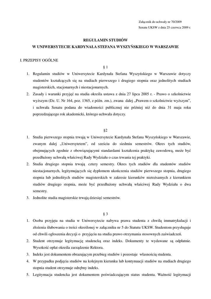 Załącznik do uchwały nr 70/2009 Senatu UKSW z dnia 25 czerwca 2009 r. REGULAMIN STUDIÓW W UNIWERSYTECIE KARDYNAŁA STEFANA WYSZYŃSKIEGO W WARSZAWIE I. PRZEPISY OGÓLNE §1 1. Regulamin studiów w Uniwersytecie Kardynała Stefana Wyszyńskiego w Warszawie dotyczy studentów kształcących się na studiach pierwszego i drugiego stopnia oraz jednolitych studiach magisterskich, stacjonarnych i niestacjonarnych. 2. Zasady i warunki przyjęć na studia określa ustawa z dnia 27 lipca 2005 r. - Prawo o szkolnictwie wyższym (Dz. U. Nr 164, poz. 1365, z późn. zm.), zwana dalej „Prawem o szkolnictwie wyższym”, i uchwała Senatu podana do wiadomości publicznej nie później niż do dnia 31 maja roku poprzedzającego rok akademicki, którego uchwała dotyczy. §2 1. Studia pierwszego stopnia trwają w Uniwersytecie Kardynała Stefana Wyszyńskiego w Warszawie, zwanym dalej „Uniwersytetem”, od sześciu do siedmiu semestrów. Okres tych studiów, obejmujących zgodnie z obowiązującymi standardami kształcenia praktykę zawodową, może być przedłużony uchwałą właściwej Rady Wydziału o czas trwania tej praktyki. 2. Studia drugiego stopnia trwają cztery semestry. Okres tych studiów dla studentów studiów niestacjonarnych, legitymujących się dyplomem ukończenia studiów pierwszego stopnia, drugiego stopnia lub jednolitych studiów magisterskich w zakresie kierunków nietożsamych z kierunkiem studiów drugiego stopnia, może być przedłużony uchwałą właściwej Rady Wydziału o dwa semestry. 3. Jednolite studia magisterskie trwają dziesięć semestrów. §3 1. Osoba przyjęta na studia w Uniwersytecie nabywa prawa studenta z chwilą immatrykulacji i złożenia ślubowania o treści określonej w załączniku nr 5 do Statutu UKSW. Studentom przysługuje od chwili ogłoszenia decyzji o przyjęciu na studia prawo otrzymania stosownych zaświadczeń. 2. Student otrzymuje legitymację studencką oraz indeks. Dokumenty te wydawane są odpłatnie. Wysokość opłat określa zarządzenie Rektora. 3. Indeks jest dokumentem obrazującym przebieg studiów i pozostaje własnością studenta. 4. W przypadku podjęcia studiów na kolejnym kierunku lub kontynuacji studiów na studiach drugiego stopnia student otrzymuje odrębny indeks. 5. Legitymacja studencka jest dokumentem poświadczającym status studenta. Ważność legitymacji studenckiej potwierdzana jest przez Dziekanat. 6. Osoba, która utraciła status studenta, zobowiązana jest niezwłocznie, nie później niż w ciągu jednego miesiąca, zwrócić legitymację studencką we właściwym Dziekanacie. 7. Po ukończeniu studiów absolwent uzyskuje dyplom ukończenia studiów. Wzór dyplomu określają odrębne przepisy. §4 1. Zwierzchnikiem i opiekunem wszystkich studentów Uniwersytetu jest Rektor. 2. Rektor sprawuje ogólny nadzór nad sprawami związanymi z rekrutacją, procesem dydaktycznym i tokiem studiów. §5 1. W sprawach niezastrzeżonych do kompetencji Rektora i Rady Wydziału nadzór nad realizacją programu studiów sprawuje Dziekan. Dziekan podejmuje decyzje we wszystkich sprawach związanych z przebiegiem studiów na wydziale. 2. Student ma prawo w ciągu 14 dni odwołać się od decyzji Dziekana do Rektora. Odwołania składane są za pośrednictwem Dziekana właściwego wydziału, który dołącza swoją opinię. §6 1. Dziekan może upoważnić prodziekana lub dyrektora instytutu do prowadzenia spraw studenckich lub ustanowić pełnomocnika do tych spraw. 2. Rada Wydziału, w drodze uchwały, może upoważnić radę instytutu wydziałowego prowadzącego samodzielnie odrębny kierunek studiów, do wykonywania niektórych swoich kompetencji w zakresie toku studiów określonych w niniejszym regulaminie. Upoważnienie nie może dotyczyć kompetencji określonych w art. 68 ust. 1 ustawy Prawo o szkolnictwie wyższym. 3. Dziekan niezwłocznie powiadamia Rektora na piśmie o udzieleniu upoważnienia lub ustanowieniu pełnomocnika, o którym mowa w ust. 1 i 2. §7 1. Wyłącznym reprezentantem ogółu studentów w Uniwersytecie są organy Samorządu Studenckiego. 2. Właściwe organy Samorządu Studenckiego są uprawnione do wyrażania stanowiska we wszystkich sprawach dotyczących studentów. §8 1. Opiekunów uczelnianych organizacji studenckich powołuje Rektor. 2. Opiekunów poszczególnych lat studiów oraz grup studenckich zrzeszonych w kołach naukowych powołuje Dziekan, w trybie określonym w Statucie Uniwersytetu. 3. Opiekun czuwa nad realizacją procesu dydaktycznego, zaspokajaniem potrzeb naukowych, socjalnych, kulturalnych i duchowych studentów oraz może w tych sprawach zgłaszać wnioski i propozycje Rektorowi i Dziekanowi, a także organom Samorządu Studenckiego. II. ORGANIZACJA STUDIÓW §9 1. Rok akademicki liczy się od dnia 1 października i trwa do dnia 30 września następnego roku. 2. Ramowy plan organizacji roku akademickiego, w tym sesji egzaminacyjnych, określa Rektor. 3. Dziekan w porozumieniu z Rektorem może zmienić termin sesji egzaminacyjnej. 4. Egzaminatorzy podają studentom do wiadomości terminy egzaminów w semestrze zimowym do dnia 10 stycznia, w zimowej sesji poprawkowej do dnia 20 stycznia, w semestrze letnim do dnia 15 maja, w letniej sesji poprawkowej do dnia 30 czerwca. § 10 1. Podstawowym językiem wykładów i prac dyplomowych w Uniwersytecie jest język polski. 2. Zajęcia dydaktyczne na studiach, sprawdziany wiedzy lub umiejętności, prace i egzaminy dyplomowe mogą być prowadzone także w języku obcym w zakresie i na warunkach określonych w programie nauczania. § 11 1. Student przed rozpoczęciem semestru ma prawo dostępu do informacji o zasadach zaliczenia przedmiotu, jego programie i zalecanej literaturze. 2. Do prowadzenia wykładów oraz egzaminów uprawnieni są nauczyciele akademiccy mający tytuł naukowy lub stopień naukowy. Rada Wydziału może upoważnić do prowadzenia wykładów oraz egzaminów także innych nauczycieli akademickich. 3. Sem