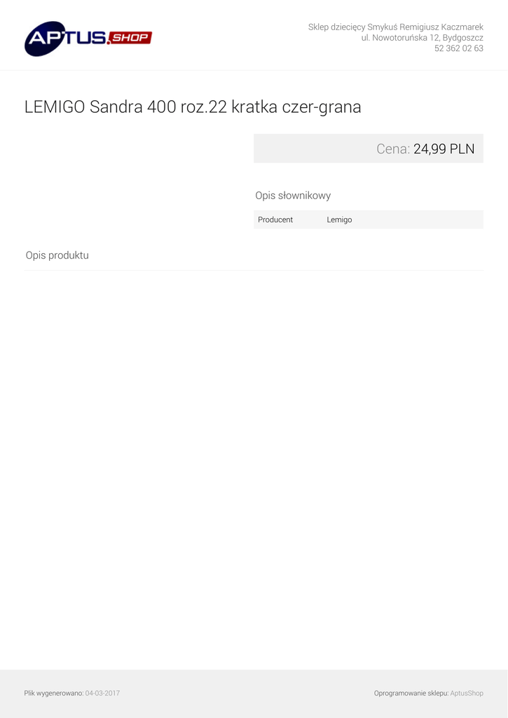 Sklep dziecięcy Smykuś Remigiusz Kaczmarek ul. Nowotoruńska 12, Bydgoszcz 52 362 02 63 LEMIGO Sandra 400 roz.22 kratka czer-grana Cena: 24,99 PLN Opis słownikowy Producent Lemigo Opis produktu Plik wygenerowano: 04-03-2017 Powered by TCPDF (www.tcpdf.org) Oprogramowanie sklepu: AptusShop
