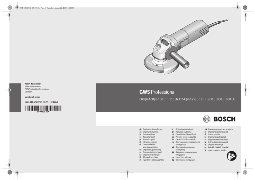 OBJ_DOKU-2457-007.fm Page 1 Thursday, August 22, 2013 4:08 PM Robert Bosch GmbH Power Tools Division 70745 Leinfelden-Echterdingen Germany www.bosch-pt.com GWS Professional 660 | 6-100 | 6-100 E | 6-115 | 6-115 E | 6-125 | 6-125 E | 780 C | 850 C | 850 CE 1 609 92A 0EK (2013.08) PS / 262 EURO Originalbetriebsanleitung Original instructions Notice originale Manual original Manual original Istruzioni originali Oorspronkelijke gebruiksaanwijzing da Original brugsanvisning sv Bruksanvisning i original no Original driftsinstruks fi Alkuperäiset ohjeet el Πρωτότυπο οδηγιών χρήσης de en fr es pt it nl tr pl cs sk hu ru uk kk ro bg Orijinal işletme talimatı Instrukcja oryginalna Původní návod k používání Pôvodný návod na použitie Eredeti használati utasítás Оригинальное руководство по эксплуатации Оригінальна інструкція з експлуатації Пайдалану нұсқаулығының түпнұсқасы Instrucţiuni originale Оригинална инструкция mk sr sl hr et lv lt ar fa Оригинално упатство за работа Originalno uputstvo za rad Izvirna navodila Originalne upute za rad Algupärane kasutusjuhend Instrukcijas oriģinālvalodā Originali instrukcija ςТЎϩХʉ ЌТϾϦφЍʉ ʌμВТЎϺυ ΖЎϩʉ ˒μВЖЙʉʓ ИͳϞφЁʑ OBJ_BUCH-161-007.book Page 102 Thursday, August 22, 2013 3:50 PM 102 | Polski Polski Ogólne przepisy bezpieczeństwa dla elektronarzędzi OSTRZEZENIE Należy przeczytać wszystkie wskazówki i przepisy. Błędy w przestrzeganiu poniższych wskazówek mogą spowodować porażenie prądem, pożar i/lub ciężkie obrażenia ciała. Należy starannie przechowywać wszystkie przepisy i wskazówki bezpieczeństwa dla dalszego zastosowania. Użyte w poniższym tekście pojęcie „elektronarzędzie“ odnosi się do elektronarzędzi zasilanych energią elektryczną z sieci (z przewodem zasilającym) i do elektronarzędzi zasilanych akumulatorami (bez przewodu zasilającego). Bezpieczeństwo miejsca pracy f Stanowisko pracy należy utrzymywać w czystości i dobrze oświetlone. Nieporządek w miejscu pracy lub nieoświetlona przestrzeń robocza mogą być przyczyną wypadków. f Nie należy pracować tym elektronarzędziem w otoczeniu zagrożonym wybuchem, w którym znajdują się np. łatwopalne ciecze, gazy lub pyły. Podczas pracy elektronarzędziem wytwarzają się iskry, które mogą spowodować zapłon. f Podczas użytkowania urządzenia zwrócić uwagę na to, aby dzieci i inne osoby postronne znajdowały się w bezpiecznej odległości. Odwrócenie uwagi może spowodować utratę kontroli nad narzędziem. Bezpieczeństwo elektryczne f Wtyczka elektronarzędzia musi pasować do gniazda. Nie wolno zmieniać wtyczki w jakikolwiek sposób. Nie wolno używać wtyków adapterowych w przypadku elektronarzędzi z uziemieniem ochronnym. Niezmienione wtyczki i pasujące gniazda zmniejszają ryzyko porażenia prądem. f Należy unikać kontaktu z uziemionymi powierzchniami jak rury, grzejniki, piece i lodówki. Ryzyko porażenia prądem jest większe, gdy ciało użytkownika jest uziemione. f Urządzenie należy zabezpieczyć przed deszczem i wilgocią. Przedostanie się wody do elektronarzędzia podwyższa ryzyko porażenia prądem. f Nigdy nie należy używać przewodu do innych czynności. Nigdy nie należy nosić elektronarzędzia, trzymając je za przewód, ani używać przewodu do zawieszenia urządzenia; nie wolno też wyciągać wtyczki z gniazdka pociągając za przewód. Przewód należy chronić przed wysokimi temperaturami, należy go trzymać z dala od oleju, ostrych krawędzi lub ruchomych części urządzenia. Uszkodzone lub splątane przewody zwiększają ryzyko porażenia prądem. f W przypadku pracy elektronarzędziem pod gołym niebem, należy używać przewodu przedłużającego, dosto1 609 92A 0EK | (22.8.13) sowanego również do zastosowań zewnętrznych. Użycie właściwego przedłużacza (dostosowanego do pracy na zewnątrz) zmniejsza ryzyko porażenia prądem. f Jeżeli nie da się uniknąć zastosowania elektronarzędzia w wilgotnym otoczeniu, należy użyć wyłącznika ochronnego różnicowo-prądowego. Zastosowanie wyłącznika ochronnego różnicowo-prądowego zmniejsza ryzyko porażenia prądem. Bezpieczeństwo osób f Podczas pracy z elektronarzędziem należy zachować ostrożność, każdą czynność wykonywać uważnie i z rozwagą. Nie należy używać elektronarzędzia, gdy jest się zmęczonym lub będąc pod wpływem narkotyków, alkoholu lub lekarstw. Moment nieuwagi przy użyciu elektronarzędzia może stać się przyczyną poważnych urazów ciała. f Należy nosić osobiste wyposażenie ochronne i zawsze okulary ochronne. Noszenie osobistego wyposażenia ochronnego – maski przeciwpyłowej, obuwia z podeszwami przeciwpoślizgowymi, kasku ochronnego lub środków ochrony słuchu (w zależności od rodzaju i zastosowania elektronarzędzia) – zmniejsza ryzyko obrażeń ciała. f Należy unikać niezamierzonego uruchomienia narzędzia. Przed włożeniem wtyczki do gniazdka i/lub podłączeniem do akumulatora, a także przed podniesieniem lub przeniesieniem elektronarzędzia, należy upewnić się, że elektronarzędzie jest wyłączone. Trzymanie palca na wyłączniku podczas przenoszenia elektronarzędzia lub podłączenie do prądu włączonego narzędzia, może stać się przyczyną wypadków. f Przed włączeniem elektronarzędzia, należy usunąć narzędzia nastawcze lub klucze. Narzędzie lub klucz, znajdujący się w ruchomych częściach urządzenia mogą doprowadzić do obrażeń ciała. f Należy unikać nienaturalnych pozycji przy pracy. Należy dbać o stabilną pozycję przy pracy i zachowanie równowagi. W ten sposób możliwa będzie lepsza kontrola elektronarzędzia w nieprzewidzianych sytuacjach. f Należy nosić odpowiednie ubranie. Nie należy nosić luźnego ubrania a