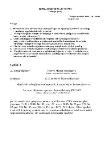 OŚWIADCZENIE MAJĄTKOWE radnego gminy Świętochłowice, dnia 12.03.2008r. (miejscowość) Uwaga: 1. Osoba składająca oświadczenie obowiązana jest do zgodnego z prawdą, starannego i zupełnego wypełnienia każdej z rubryk. 2. Jeżeli poszczególne rubryki nie znajdują w konkretnym przypadku zastosowania, należy wpisać „nie dotyczy”. 3. Osoba składająca oświadczenie obowiązana jest określić przynależność poszczególnych składników majątkowych, dochodów i zobowiązań do majątku odrębnego i majątku objętego małżeńską wspólnością majątkową. 4. Oświadczenie o stanie majątkowym dotyczy majątku w kraju i za granicą. 5. Oświadczenie o stanie majątkowym obejmuje również wierzytelności pieniężne. 6. W części A oświadczenia zawarte są informacje jawne, w części B zaś informacje niejawne dotyczące adresu zamieszkania składającego oświadczenie oraz miejsca położenia nieruchomości CZĘŚĆ A Ja, niżej podpisany, Henryk Michał Kucharczyk (imiona i nazwisko oraz nazwisko rodowe) urodzony, 20.01.1954r. w Świętochłowicach Miejskie Przedsiębiorstwo Gospodarki Komunalnej w Świętochłowicach Sp z o.o. - kierowca operator; Przewodniczący KRGMiE (miejsce zatrudnienia, stanowisko lub funkcja) po zapoznaniu się z przepisami ustawy z dnia 8 marca 1990r. o samorządzie gminnym (Dz.U. z 2001r. Nr 142, poz. 1591 oraz z 2002r. Nr 23, poz. 220, Nr 62, poz. 558, Nr 113, poz. 984, Nr 153, poz. 1271 i Nr 214,poz. 1806), zgodnie z art. 24 h tej ustawy oświadczam, że posiadam wchodzące w skład małżeńskiej wspólności majątkowej lub stanowiące mój majątek odrębny: I. Zasoby pieniężne: - środki pieniężne zgromadzone w walucie polskiej: 8.000,00 małżeńska wspólność majątkowa ............................................................................................................................... ................................................................................................................................ środki pieniężne zgromadzone w walucie obcej: nie dotyczy ................................................................................................................................ - ................................................................................................................................ - papiery wartościowe: nie dotyczy ................................................................................................................................ ........................................na kwotę: ....................................................................... II. 1. Dom o powierzchni:.......................m2, o wartości:.......................................... tytuł prawny:. nie dotyczy............................................................................... 2. Mieszkanie o powierzchni: 51,58 m2, o wartości: 39.495,00 zł tytuł prawny: umowa ustanowienia odrębnej własności lokalu mieszkalnego oraz sprzedaży tego lokalu - małżeńska wspólnota majątkowa. 3. Gospodarstwo rolne: rodzaj gospodarstwa:......................................, powierzchnia:........................ o wartości: ...................................................................................................... rodzaj zabudowy: nie dotyczy………….......................................................... tytuł prawny: .................................................................................................. Z tego tytułu osiągnąłem (ęłam) w roku ubiegłym przychód i dochód w wysokości: nie dotyczy 3. Inne nieruchomości: domek kempingowy, garaż powierzchnia: 1) 31,90 m˛ 2) 15,80 m˛ o wartości: 1) 12.000,00 zł 2) 7.500,00 zł małżeńska wspólnota majątkowa tytuł prawny: 1) umowa sprzedaży, grunt – dzierżawa 2) umowa ustanowienia odrębnej własności garażu, przeniesienia własności garażu oraz oddania w użytkowanie wieczyste małżeńska wspólnota majątkowa III. 1. Posiadam udziały w spółkach handlowych z udziałem gminnych osób prawnych lub przedsiębiorców, w których uczestniczą takie osoby - należy podać liczbę i emitenta udziałów: nie dotyczy ............................................................................................................................ ............................................................................................................................ udziały te stanowią pakiet większy niż 10% udziałów w spółce: nie dotyczy ………………………………………………………………………………… Z tego tytułu osiągnąłem (ęłam) w roku ubiegłym dochód w wysokości: nie dotyczy ………………………………………………………………………………… 2. Posiadam udziały w innych spółkach handlowych - należy podać liczbę i emitenta udziałów: nie dotyczy ………………………………………………………………………………… Z tego tytułu osiągnąłem (ęłam) w roku ubiegłym dochód w wysokości: nie dotyczy IV. 1. Posiadam akcje w spółkach handlowych z udziałem gminnych osób prawnych lub przedsiębiorców, w których uczestniczą takie osoby - należy podać liczbę i emitenta akcji: nie dotyczy ………………………………………………………………………………… ............................................................................................................................ ............................................................................................................................. akcje te stanowią pakiet większy niż 10% akcji w spółce: nie dotyczy ……………………………………………………………………………. ……………………………………………………………………………. Z tego tytułu osiągnąłem (ęłam) w roku ubiegłym dochód w wysokości: .............................