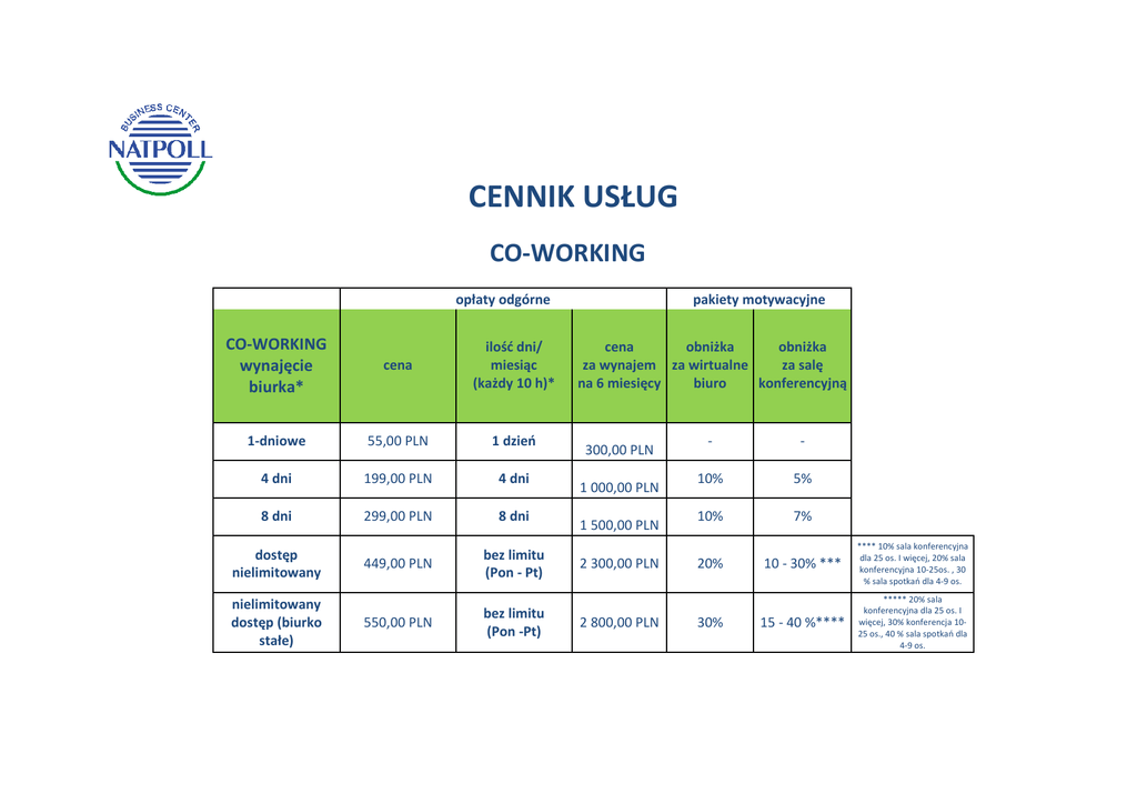 CENNIK USŁUG CO-WORKING opłaty odgórne CO-WORKING wynajęcie biurka* cena ilość dni/ miesiąc (każdy 10 h)* 1-dniowe 55,00 PLN 1 dzień 4 dni 199,00 PLN 4 dni 8 dni 299,00 PLN 8 dni 449,00 PLN bez limitu (Pon - Pt) 550,00 PLN bez limitu (Pon -Pt) dostęp nielimitowany nielimitowany dostęp (biurko stałe) pakiety motywacyjne cena obniżka obniżka za wynajem za wirtualne za salę na 6 miesięcy biuro konferencyjną 300,00 PLN 1 000,00 PLN 1 500,00 PLN 2 300,00 PLN 2 800,00 PLN - - 10% 5% 10% 7% 20% 30% 10 - 30% *** **** 10% sala konferencyjna dla 25 os. I więcej, 20% sala konferencyjna 10-25os. , 30 % sala spotkań dla 4-9 os. 15 - 40 %**** ***** 20% sala konferencyjna dla 25 os. I więcej, 30% konferencja 1025 os., 40 % sala spotkań dla 4-9 os. ** zniżka obowiązuje w przypadku ilości miesięcy równych okresowi wynajmu biurka w przestrzeni co-working *** zniżka obowiązuje tylko w przypadku długoterminowego najmu, min. 3 miesiące * Każda opcja zawiera: -dostęp do biura 24/7, - dostęp do sali konferencyjnej z 50% upustem w ramach "last minute" - Internet 100 Mb / s, - wielofunkcyjne biuro: nielimitowane skanowanie, drukowanie / kopiowanie monochromatyczne 10 stron/ dzień / pers. (każda strona powyżej 0,10 PLN), - obsługa recepcji - dostęp do wyposażenia kuchni -kawa, herbata, woda bez limitu - promocja kanałami komunikacji Natpoll (strona internetowa, eventy), Usługi dodatkowe dla Co-workingu: - wynajęcie pudełka (50 PLN/miesiąc), zamykana szafka (100 PLN/miesiąc) - logo firmy przy wejściu do biura (50 PLN/miesiąc) - wysyłka listów (cena za każdy list: 1 PLN + opłata pocztowa)