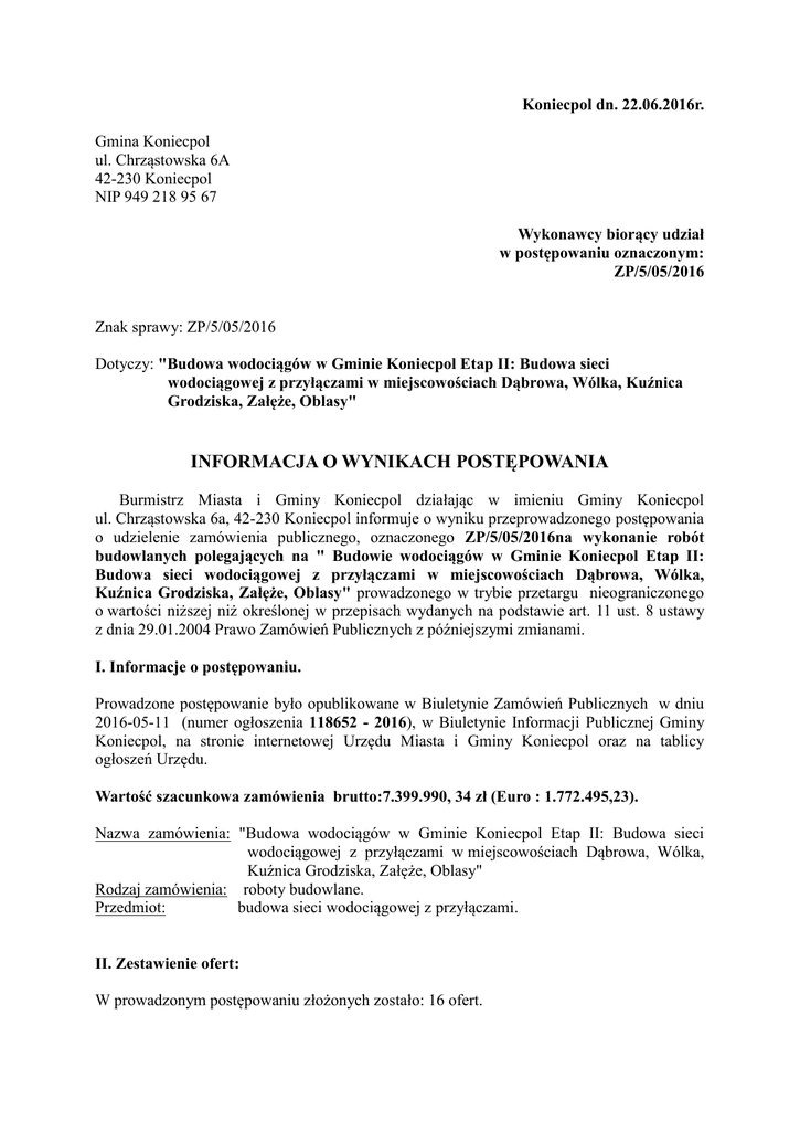 Koniecpol dn. 22.06.2016r. Gmina Koniecpol ul. Chrząstowska 6A 42-230 Koniecpol NIP 949 218 95 67 Wykonawcy biorący udział w postępowaniu oznaczonym: ZP/5/05/2016 Znak sprawy: ZP/5/05/2016 Dotyczy: "Budowa wodociągów w Gminie Koniecpol Etap II: Budowa sieci wodociągowej z przyłączami w miejscowościach Dąbrowa, Wólka, Kuźnica Grodziska, Załęże, Oblasy" INFORMACJA O WYNIKACH POSTĘPOWANIA Burmistrz Miasta i Gminy Koniecpol działając w imieniu Gminy Koniecpol ul. Chrząstowska 6a, 42-230 Koniecpol informuje o wyniku przeprowadzonego postępowania o udzielenie zamówienia publicznego, oznaczonego ZP/5/05/2016na wykonanie robót budowlanych polegających na " Budowie wodociągów w Gminie Koniecpol Etap II: Budowa sieci wodociągowej z przyłączami w miejscowościach Dąbrowa, Wólka, Kuźnica Grodziska, Załęże, Oblasy" prowadzonego w trybie przetargu nieograniczonego o wartości niższej niż określonej w przepisach wydanych na podstawie art. 11 ust. 8 ustawy z dnia 29.01.2004 Prawo Zamówień Publicznych z późniejszymi zmianami. I. Informacje o postępowaniu. Prowadzone postępowanie było opublikowane w Biuletynie Zamówień Publicznych w dniu 2016-05-11 (numer ogłoszenia 118652 - 2016), w Biuletynie Informacji Publicznej Gminy Koniecpol, na stronie internetowej Urzędu Miasta i Gminy Koniecpol oraz na tablicy ogłoszeń Urzędu. Wartość szacunkowa zamówienia brutto:7.399.990, 34 zł (Euro : 1.772.495,23). Nazwa zamówienia: "Budowa wodociągów w Gminie Koniecpol Etap II: Budowa sieci wodociągowej z przyłączami w miejscowościach Dąbrowa, Wólka, Kuźnica Grodziska, Załęże, Oblasy" Rodzaj zamówienia: roboty budowlane. Przedmiot: budowa sieci wodociągowej z przyłączami. II. Zestawienie ofert: W prowadzonym postępowaniu złożonych zostało: 16 ofert. Lp. 1. 2. 3. 4. 5. 6. 7. 8. 9. 10. 11. 12. 13. 14. 15. 16. Nazwa wykonawcy/adres ZISCO Sp. z o.o. Spółka komandytowa ul. Zjednoczenia 11, 43-250 Pawłowice F.U.H.P."TRAK-KOP" Mirosław Cieplak Kostomłoty Pierwsze, ul. Podmiejska 105, 26-08 Miedziana Góra Konsorcjum Firm: Lider: BUSKOPOL S.A ul. Kilińskiego 41, 28-100 Busko-Zdrój; Partner: AKWEDUKT Sp. z o.o., ul. Sandomierska 105, 25-324 Kielce DDtherm Sp. z o.o. ul. Powstańców Śl. 9 47-171 Rozmierka Przedsiębiorstwo Budownictwa Inżynieryjnego MACHNIK sp. z o.o. Mochnaczka Wyżna 118 33-380 Krynica Zdrój ZTHU S. Krupiński&Zakład Instalacji Sanitranych C.O. i Gazu "HYDROMIREX" M.M.Ł. Świtoń ul. Wesoła 13, 42-263 Wrzosowa GT PROJEKT Tadeusz Galisz ul. Dębowa 15, 44-330 Jastrzębie Zdrój Zakład Robót InżynieryjnoTransportowych "WOD-GAZ" ul. 1 Maja 1G, 28-131 Solec-Zdrój Przedsiębiorstwo Budowy Dróg i Mostów Sp. z o.o. ul. Kolejowa 28, 05-300 Mińsk Mazowiecki Firma Handlowa EXPORT-IMPORT Ryszard Bujak ul. Kraszewskiego 10, 29-100 Włoszczowa Konsorcjum Firm: Lider: "ADMA" Zakład RemontowoBudowlany Marian Adamczyk ul. Kościuszki 68, 28-200 StaszówPartner: Przedsiębiorstwo Budowlano-Handlowe "ADMA"-bis Sp. j. Józef Adamczyk, Stanisław Adamczyk ul. Kościuszki 68, 28-200 Staszów "EKOPLAST BIS" Przedsiębiorstwo Usługowo-Handlowe Tadeusz Wydrych ul. Juliusza Słowackiego 6, 28-300 Jędrzejów PHU RAD-BUD Zimoch Włodzimierz ul. Krasickiego 107, 97-500 Radomsko REMINSTAL Sp. z o.o. ul. Opolska 5, 44-100 Gliwice P. U. H. P. "INST-GAZ" M. Kasztelan, J. Nawracała, S. Jałowiecki Spółka Jawna ul. Częstochowska 213, 42-244 Jaskrów Przedsiębiorstwo Produkcyjno-Handlowo Cena brutto: Okres gwarancji: 3.505.500,00 zł 5 lat 2.669.822,01 zł 5 lat 3.758.142,00 zł 5 lat 2.765.885,34 zł 5 lat 2.672.538,09 zł 5 lat 3.533.136,38 zł 4 lata 2.413.087,10 zł 5 lat 1.985.000,00 zł 5 lat 4.243.500,00 zł 5 lat 1.950.000,18 zł 5 lat 2.598.922,29 zł 5 lat 1.590.940,27 zł 5 lat 3.740.028,95 zł 5 lat 2.618.350,82 zł 5 lat 3.899.100,00 zł 5 lat Usługowe "SANGAZ" Waldemar Pacud ul. Ikara 288, 42-221Częstochowa 5.535.000,00 zł 5 lat III. Punktacja Lp. Nazwa wykonawcy/adres Cena brutto: 1. 2. 3. 4. 5. 6. 7. 8. 9. 10. 11. ZISCO Sp. z o.o. Spółka komandytowa ul. Zjednoczenia 11, 43-250 Pawłowice F.U.H.P."TRAK-KOP" Mirosław Cieplak, Kostomłoty Pierwsze, ul. Podmiejska 105, 26-08 Miedziana Góra Konsorcjum Firm: Lider: BUSKOPOL S.A ul. Kilińskiego 41, 28-100 BuskoZdrój; Partner: AKWEDUKT Sp. z o.o., ul. Sandomierska 105, 25-324 Kielce DDtherm Sp. z o.o. ul. Powstańców Śl. 9 47-171 Rozmierka Przedsiębiorstwo Budownictwa Inżynieryjnego MACHNIK sp. z o.o. Mochnaczka Wyżna 118 33-380 Krynica Zdrój ZTHU S. Krupiński & Zakład Instalacji Sanitranych C.O. i Gazu "HYDROMIREX" M.M.Ł. Świtoń ul. Wesoła 13, 42-263 Wrzosowa GT PROJEKT Tadeusz Galisz ul. Dębowa 15, 44-330 Jastrzębie Zdrój Zakład Robót InżynieryjnoTransportowych "WOD-GAZ" ul. 1 Maja 1G, 28-131 Solec-Zdrój Przedsiębiorstwo Budowy Dróg i Mostów Sp. z o.o. ul. Kolejowa 28, 05-300 Mińsk Mazowiecki Firma Handlowa EXPORT-IMPORT Ryszard Bujak ul. Kraszewskiego 10, 29-100 Włoszczowa Konsorcjum Firm: Lider: "ADMA" Zakład RemontowoBudowlany Marian Adamczyk ul. Kościuszki 68, 28-200 StaszówPartner: Przedsiębiorstwo Budowlano-Handlowe "ADMA"-bis Sp. j. Józef Adamczyk, Stanisław Adamczyk Punktacja Okres gwarancji: Razem Oferta odrzucona Oferta odrzucona Oferta odrzucona Oferta odrzucona Oferta odrzucona Wykonawca wykluczony-Oferta odrzucona Oferta odrzucona Oferta odrzucona Oferta odrzucona Oferta odrzucona Oferta odrzucona 12. 13. 14. 15. 16. ul. Kościuszki 68, 28-200 Staszów "EKOPLAST BIS" Przedsiębiorstwo Usługowo-Handlowe Tadeusz Wydrych ul. Juliusza Słowackiego 6, 28-300 Jędrzejów PHU RAD-BUD Zimoch Włodzimierz ul. Krasickiego 107, 97-500 Radomsko REMINSTAL Sp. z o.o. ul. Opolska 5, 44-100 Gliwice P. U. H. P. "INST-GAZ" M. Kasztelan, J. Nawracała, S. Jałowiecki Spółka Jawna ul. Częstochowska 213, 42-244 Jaskrów Przedsiębiorstwo ProdukcyjnoHandlowo Usługowe "SANGAZ" Waldemar Pacud ul. Ikara 288, 42-221 Częstochowa Oferta odrzucona Oferta od