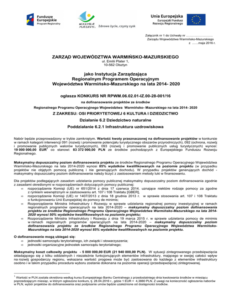 Załącznik nr 1 do Uchwały nr …………………….. Zarządu Województwa Warmińsko-Mazurskiego z ……maja 2016 r. ZARZĄD WOJEWÓDZTWA WARMIŃSKO-MAZURSKIEGO ul. Emilii Plater 1, 10-562 Olsztyn jako Instytucja Zarządzająca Regionalnym Programem Operacyjnym Województwa Warmińsko-Mazurskiego na lata 2014- 2020 ogłasza KONKURS NR RPWM.06.02.01-IZ.00-28-001/16 na dofinansowanie projektów ze środków Regionalnego Programu Operacyjnego Województwa Warmińsko- Mazurskiego na lata 2014- 2020 Z ZAKRESU: OSI PRIORYTETOWEJ 6 KULTURA I DZIEDZICTWO Działanie 6.2 Dziedzictwo naturalne Poddziałanie 6.2.1 Infrastruktura uzdrowiskowa Nabór będzie przeprowadzony w trybie zamkniętym. Wartość kwoty przeznaczonej na dofinansowanie projektów w konkursie w ramach kategorii interwencji 091 (rozwój i promowanie potencjału turystycznego obszarów przyrodniczych), 092 (ochrona, rozwój i promowanie publicznych walorów turystycznych), 093 (rozwój i promowanie publicznych usług turystycznych) wynosi: 1 19 000 000,00 EUR co stanowi: 83 372 000,00 PLN ze środków pochodzących z Europejskiego Funduszu Rozwoju Regionalnego. Maksymalny dopuszczalny poziom dofinansowania projektu ze środków Regionalnego Programu Operacyjnego Województwa Warmińsko-Mazurskiego na lata 2014-2020 wynosi 85% wydatków kwalifikowanych na poziomie projektu (w przypadku projektów nie objętych pomocą publiczną i nie generujących dochodu). W przypadku projektów generujących dochód maksymalny dopuszczalny poziom dofinansowania należy liczyć z zastosowaniem metody luki w finansowaniu. Dla projektów podlegających zasadom udzielania pomocy publicznej maksymalny dopuszczalny poziom dofinansowania zgodnie z zasadami określonymi w rozporządzeniach dotyczących pomocy publicznej: • rozporządzenie Komisji (UE) nr 651/2014 z dnia 17 czerwca 2014. uznające niektóre rodzaje pomocy za zgodne z rynkiem wewnętrznym w zastosowaniu art. 107 i 108 Traktatu [GBER], • rozporządzenie Komisji (UE) nr 1407/2013 z dnia 18 grudnia 2013 r. w sprawie stosowania art. 107 i 108 Traktatu o funkcjonowaniu Unii Europejskiej do pomocy de minimis; • Rozporządzenie Ministra Infrastruktury i Rozwoju w sprawie udzielania regionalnej pomocy inwestycyjnej w ramach regionalnych programów operacyjnych na lata 2014-2020 – maksymalny dopuszczalny poziom dofinansowania projektu ze środków Regionalnego Programu Operacyjnego Województwa Warmińsko-Mazurskiego na lata 20142020 wynosi 50% wydatków kwalifikowalnych na poziomie projektu; • Rozporządzenie Ministra Infrastruktury i Rozwoju z dnia 19 marca 2015 r. w sprawie udzielania pomocy de minimis w ramach regionalnych programów operacyjnych na lata 2014-2020 – maksymalny dopuszczalny poziom dofinansowania projektu ze środków Regionalnego Programu Operacyjnego Województwa WarmińskoMazurskiego na lata 2014-2020 wynosi 85% wydatków kwalifikowalnych na poziomie projektu. O dofinansowanie mogą ubiegać się: • jednostki samorządu terytorialnego, ich związki i stowarzyszenia; • jednostki organizacyjne jednostek samorządu terytorialnego; Maksymalny koszt całkowity projektu - 5 000 000,00 EUR (21 940 000,00 PLN). W sytuacji zintegrowanego przedsięwzięcia składającego się z kilku oddzielnych i niezależnie funkcjonujących elementów infrastruktury, mającego w swojej całości wpływ na rozwój gospodarczy regionu, wskazana wartość progowa może być zastosowana do każdego z elementów infrastruktury osobno i w takim przypadku procedura wyboru zostanie dokonana na poziomie operacji (przedsięwzięcia) zintegrowanej. 1 Wartość w PLN została określona według kursu Europejskiego Banku Centralnego z przedostatniego dnia kwotowania środków w miesiącu poprzedzającym miesiąc, w którym ogłoszono konkurs, tj. 28.04.2016 r., gdzie 1 EUR = 4,3880 PLN. Z uwagi na konieczność ogłoszenia naborów w PLN, wybór projektów do dofinansowania oraz podpisanie umów będzie uzależnione od dostępności środków. Maksymalna wartość wydatków kwalifikowalnych projektu – 5 000 000,00 EUR (21 940 000,00 PLN). Minimalny wkład własny, jaki Beneficjent zobowiązany jest zabezpieczyć, w przypadku projektów nie objętych pomocą publiczną i nie generujących dochodu wynosi 15% całkowitych wydatków kwalifikowalnych w ramach projektu. Poziom wkładu własnego w przypadku projektów generujących dochód zależy od wartości luki finansowej. Dla projektów podlegających zasadom udzielania pomocy publicznej minimalny wkład własny Beneficjenta wynika z zasad określonych w rozporządzeniach dotyczących udzielania pomocy publicznej, o których mowa powyżej. Realizacja projektu musi zakończyć się najpóźniej do 31 grudnia 2019 r. Przewidziane do wsparcia typy projektów: • Budowa, rozbudowa, modernizacja (w tym przebudowa) i wyposażenie publicznie dostępnej infrastruktury uzdrowiskowej obejmująca: urządzanie terenów zielonych i wyposażenie ich w urządzenia umożliwiające pełnienie funkcji rekreacyjnych/leczniczych, np. parki zdrojowe, ścieżki zdrowia, parki kinezyterapeutyczne, skwery; • Tworzenie urządzeń lecznictwa uzdrowiskowego typu pijalnie uzdrowiskowe, tężnie, inhalatoria, urządzanie odcinków plaży, uzdrowiskowe baseny kąpielowe, trasy leczenia spacerowego do terenoterapii, promenady uzdrowiskowe i powiązane parkingi Kryteria wyboru projektów wskazane są w dokumencie: Szczegółowy opis osi priorytetowej 6 Kultura i dziedzictwo Regionalnego Programu Operacyjnego Województwa Warmińsko-Mazurskiego na lata 2014- 2020. Termin, miejsce i forma składania wniosków o dofinansowanie: Wniosek o dofinansowanie projektu wraz z załącznikami należy złożyć osobiście, listem poleconym, za pośrednictwem posłańca lub kuriera (liczy się data wpływu) w Urzędzie Marszałkowskim Województwa Warmińsko-Mazurskiego w Olsztynie w Departamencie Europejskiego Funduszu Rozwoju Regionalnego, ul. Kościuszki 89/91, 10-554 Olsztyn, I 