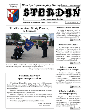 Egzemplarz bezpłatny Biuletyn Informacyjny Gminy Nr 6/2015 ISNN-1895-5843 STERDYÑ organ samorządu Gminy „Samorząd - to władza ludzi wolnych" - Wincenty Witos 90 lat Ochotniczej StraŜy PoŜarnej w Mursach 30 czerwca 2015 r. Samorządowe Wieści W dniu 9 czerwca 2015 r. o godz. 9.00 w sali konferencyjnej Urzędu Gminy Sterdyń odbyła się VI Zwyczajna Sesja Rady Gminy Sterdyń. Frekwencja radnych wyniosła 100%. Strona 2 Noc Świętojańska W poniedziałek 23 czerwca br. nad zalewem w Sterdyni, odbyło się spotkanie poświęcone tradycjom i obrzędom Nocy Świętojańskiej zorganizowane przez Towarzystwo Miłośników Ziemi Sterdyńskiej i Sterdyńskie Towarzystwo Wspierania Twórczości Lokalnej. Strona 3 28 czerwca 2015 r. w Starych Mursach odbyła się uroczystość 90-lecia istnienia OSP połączona z Powiatowym Świętem StraŜaka. Więcej w następnym numerze biuletynu StraŜackie zawody sportowo-poŜarnicze W niedzielę 12 lipca 2015 roku, o godz. 13.00 w Hołowienkach, Gmina Sabnie rozpoczną się Międzygminne Zawody SportowoPoŜarnicze jednostek Ochotniczych StraŜy PoŜarnych z terenu gminy Sterdyń i Sabnie. Jednostki rywalizować będą w dwóch konkurencjach: ćwiczenie bojowe i sztafeta poŜarnicza z przeszkodami. Zawody odbywają są co roku, a nad ich prawidłowym przebiegiem czuwa Komenda Powiatowa Państwowej StraŜy PoŜarnej w Sokołowie Podlaskim. Wszystkich sympatyków zapraszamy do kibicowania. Zarząd Gminny OSP oraz Wót Gminy Sukcesy uczniów Zespołu Szkół w Sterdyni Uczniowie Zespołu Szkół w Sterdyni w II semestrze wykazali się duŜymi wiadomościami i umiejętnościami zdobywając wysokie lokaty w wielu konkursach na szczeblu powiatowym, rejonowym i równieŜ wojewódzkim. Strona 6-7 Z Ŝycia świetlicy socjoterapeutycznej Dbając o bezpieczeństwo wychowanków w ramach zajęć o tematyce profilaktycznej, przeprowadzono i rozstrzygnięto w świetlicy wiele konkursów o tematyce antyuzaleŜnieniowej. Strona 8 2 Biuletyn Informacyjny Gminy STERDYŃ SAMORZĄDOWE WIEŚCI Gminy Sterdyń W dniu 9 czerwca 2015 r. o godz. 9.00 w sali konferencyjnej Urzędu Gminy Sterdyń odbyła się VI Zwyczajna Sesja Rady Gminy Sterdyń. Frekwencja radnych wyniosła 100%. Była to wyjątkowa sesja, poniewaŜ zgodnie z zapisami ustawy o finansach publicznych, nie później niŜ do 30 czerwca roku następującego po roku budŜetowym, Rada Gminy podejmuje uchwałę w sprawie udzielenia absolutorium Wójtowi Gminy z tytułu wykonania budŜetu za rok poprzedni. Ze względu na fakt, Ŝe do czasu wyborów samorządowych, które odbyły się w listopadzie 2014 roku, Wójtem Gminy był Pan Czesław Marian Zalewski, uczestniczył on równieŜ w obradach sesji. Po podjęciu uchwały w sprawie udzielenia absolutorium Przewodniczący Rady Gminy Pan Kazimierz Pawluczak pogratulował uzyskania absolutorium, zarówno obecnej Pani Wójt GraŜynie Sikorskiej, jak i jej poprzednikowi Panu Czesławowi Marianowi Zalewskiemu. Po przyjęciu proponowanego porządku obrad Rada Gminy przyjęła informację o realizacji uchwał Rady Gminy i działalności Wójta Gminy Sterdyń za okres między sesjami Rady Gminy. W czasie trwania sesji Rada Gminy przyjęła następujące uchwały: - w sprawie zatwierdzenia rocznego sprawozdania finansowego Gminy Sterdyń wraz ze sprawozdaniem z wykonania budŜetu za rok 2014; - w sprawie udzielenia absolutorium Wójtowi Gminy Sterdyń za rok 2014 - radni jednogłośnie zdecydowali o udzieleniu Wójtowi Gminy absolutorium z tytułu wykonania budŜetu; -w sprawie przyjęcia samorządowego programu przyznającego uprawnienia członkom rodzin wielodzietnych w Gminie Sterdyń - uprawnienia będą realizowane w oparciu o ogólnopolską Kartę DuŜej Rodziny, która na terenie gminy Sterdyń będzie uprawniała do dopłat z tytułu opłat za gospodarowanie odpadami komunalnymi zbieranymi i odbieranymi w sposób selektywny w wysokości 100% opłaty za trzecie i kaŜde kolejne dziecko; - w sprawie zmian w Wieloletniej Prognozie Finansowej Gminy Sterdyń na lata 2014- 2030; - w sprawie zmian w uchwale budŜetowej Gminy Sterdyń na rok 2014; W dochodach zwiększa się plan o 101.980 zł z tytułu wpływów z odzyskanego VAT oraz 18.470 zł z tytułu podatków i opłat. Ogółem plan dochodów zwiększa się o 120.450 zł. W planie wydatków dokonuje się następujących zmian: - wprowadza się plan w kwocie 4.800 zł na zakup licencji Systemu Informacji Prawnej LEX, jednocześnie zmniejszając plan na wynagrodzenia i pochodne. Poza tym zwiększa się plan na usługi o 25.000 zł; - wprowadza się plan w kwocie 10.000 zł na dofinansowanie zakupu karetki sanitarnej dla SPZOZ; - wprowadza się plan w kwocie 3.000 zł na realizację gminnej karty duŜej rodziny. Poza tym w dziale dokonuje się zmian paragrafu wydatku dotyczącego realizacji zadania publicznego w zakresie prowadzenia Środowiskowego Domu Samopomocy; - zwiększa się plan o 1.250 zł na pomoc materialną dla uczniów na zabezpieczenie 20% wkładu gminy przy realizacji zadania finansowego z budŜetu państwa; - zwiększa się o 4.000 zł plan dotacji dla Gminnego Ośrodka Kultury i Sportu z przeznaczeniem na zakup i naprawę sprzętu muzycznego. Dochody zwiększa się o 120.450 zł, wydatki zwiększa się o 43.250 zł. Pozostałą kwotę w wysokości 77.200 zł przeznacza się na spłatę wcześniej zaciągniętych kredytów. Agata Łagoda Turniej piłki noŜnej o puchar Marszałka Województwa Mazowieckiego W dniu 28 czerwca 2015 roku Ochotnicza StraŜ PoŜarna w Mursach Starych obchodziła jubileusz 90-lecia powstania jednostki. Uroczystość była okazją do zorganizowania turnieju piłki noŜnej o puchar Marszałka Województwa Mazowieckiego, jak równieŜ festynu sportowo – rekreacyjnego. W turnieju udział wzięły druŜyny składające się ze straŜaków reprezentujących powiat sokołowski oraz powiaty sąsiadujące z powiatem sokołowskim. Rozgrywki przeprowadzili członkowie Gminnego Uczniowskiego