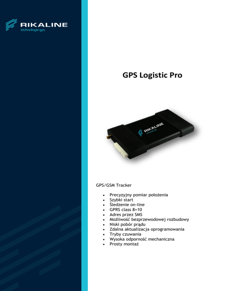 GPS Logistic Pro GPS/GSM Tracker Precyzyjny pomiar położenia Szybki start Śledzenie on-line GPRS class 8+10 Adres przez SMS Możliwość bezprzewodowej rozbudowy Niski pobór prądu Zdalna aktualizacja oprogramowania Tryby czuwania Wysoka odporność mechaniczna Prosty montaż SPECYFIKACJA SZCZEGÓŁOWA Interfejs Zasilanie 9..35 V Bezprzewodowe szyfrowane połczenie z 16 dodatkowymi elementami systemu takimi jak: Drone, CarCard, iTerminal 2 wyjścia sterujące 3 uniwersalne wejścia* Złącze magistrali CAN* Wyjście do zewnętrznej anteny GSM** Wyjście do zewnętrznej anteny GPS** Kontrolka LED** Gniazdo karty SIM*** 66 kanałów „Hot start” < 1sek. „Cold start” < 35sek. Precyzja pozycji <5m CEP(50%) w/o SA(horizontal) Czułość odbiornika -163 dBm Wbudowana aktywna antena GPS GSM Trzy zakresy 900/1800/1900 Mhz Nadajnik o mocy 2W (dla 900 Mhz) Czułość -106 dBm GPRS class 8+10 Warunki środowiskowe Temperatura pracy -20°C do 55°C Temperatura składowania -40°C do 60°C Dopuszczalna wilgotność względna 95% bez kondensacji Szczelność IP54 Podwyższona ochronność udarowa Duża odporność na drgania Właściwości fizyczne Wymiary 140 x 80 x 17 [mm] Waga 175g (±5%) * Wyprowadzenia współdzielone: CAN / 2 wejścia uniwersalne ** Opcjonalne *** Wewnątrz obudowy CECHY Rejestracja danych GPS, wejść, odczyt poziomu paliwa Inteligentny algorytm zbierania pozycji GPS, znacząco obniżający ilość przesyłanych danych Tryb śledzenia w czasie rzeczywistym Wysyłanie komunikatów środowiskowych (stacyjka, zmiana stanu wejść, detekcja ruchu, alarmowanie zderzenia/wypadku) Wielostopniowy tryb oszczędności energii Zdalna aktualizacja oprogramowania Współpraca ze zdalnymi czujnikami Drone™ (np. paliwa, temperatury, otwarcia) Współpraca z elektronicznym identyfikatorem kierowcy Współpraca ze zdalnymi przekaźnikami (np. odcięcie dopływu paliwa, blokada drzwi ładowni) ZASTOSOWANIA Zabezpieczenie mienia Śledzenie floty Kontrola towaru Ubezpieczenia Dzięki zastosowaniu gumowych osłon obudowy, urządzenie jest uodpornione na wstrząsy i uderzenia. Dodatkowo zwiększa to szczelność urządzenia, aż do IP54, co powoduje większą swobodę w wyborze miejsca instalacji urządzenia w pojeździe. Złącze wielofunkcyjne wyposażone jest w zatrzaski zapobiegające przypadkowemu odpięciu od instalacji pojazdu. Konstrukcja złącza uniemożliwia nieprawidłowe podłączenie wtyku, zachowując jednocześnie prostotę podłączenia. Niewielkie wymiary, a zwłaszcza grubość 17mm pozwala na umieszczenie trakera w miejscu trudno dostępnym, gdzie odnalezienie go przez osoby niepowołane będzie bardzo utrudnione. Dodatkowo system można rozbudować o dodatkowe zabezpieczenia takie jak odcięcie dopływu paliwa, czy zapłonu. Cała rozbudowa może być oparta na wbudowanej łączności bezprzewodowej zaszyfrowanej jedną z najlepszych metod XX! Wieku, gwarantującą pełne bezpieczeństwo połączenia. Najprostsza opcja instalacji ogranicza się jedynie do podłączenia urządzenia do przewodów zasilania w samochodzie. Dzięki takiemu rozwiązaniu miejsce instalacji nie musi być tak przewidywalne, jak ma to miejsce w podobnych produktach konkurencyjnych firm. Pomimo tak prostego podłączenia traker zachowuje większość swoich funkcji. Dodatkowo w każdym momencie można uzupełnić funkcjonalność po przez instalację dodatkowych bezprzewodowych czujników.