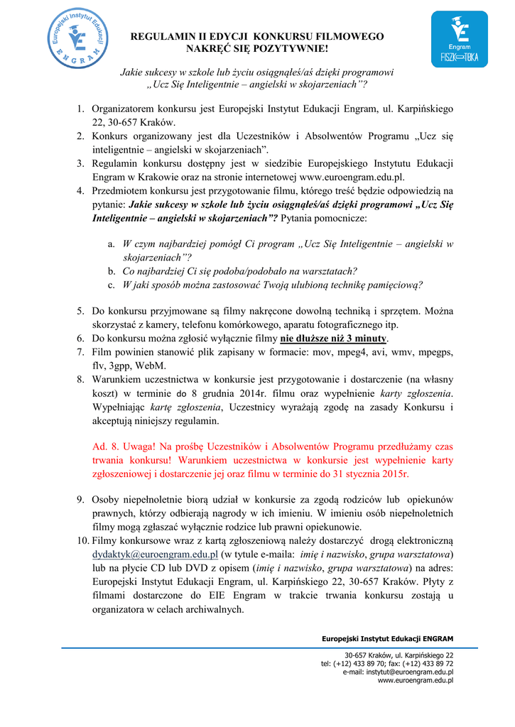 REGULAMIN II EDYCJI KONKURSU FILMOWEGO NAKRĘĆ SIĘ POZYTYWNIE! Jakie sukcesy w szkole lub życiu osiągnąłeś/aś dzięki programowi „Ucz Się Inteligentnie – angielski w skojarzeniach”? 1. Organizatorem konkursu jest Europejski Instytut Edukacji Engram, ul. Karpińskiego 22, 30-657 Kraków. 2. Konkurs organizowany jest dla Uczestników i Absolwentów Programu „Ucz się inteligentnie – angielski w skojarzeniach”. 3. Regulamin konkursu dostępny jest w siedzibie Europejskiego Instytutu Edukacji Engram w Krakowie oraz na stronie internetowej www.euroengram.edu.pl. 4. Przedmiotem konkursu jest przygotowanie filmu, którego treść będzie odpowiedzią na pytanie: Jakie sukcesy w szkole lub życiu osiągnąłeś/aś dzięki programowi „Ucz Się Inteligentnie – angielski w skojarzeniach”? Pytania pomocnicze: a. W czym najbardziej pomógł Ci program „Ucz Się Inteligentnie – angielski w skojarzeniach”? b. Co najbardziej Ci się podoba/podobało na warsztatach? c. W jaki sposób można zastosować Twoją ulubioną technikę pamięciową? 5. Do konkursu przyjmowane są filmy nakręcone dowolną techniką i sprzętem. Można skorzystać z kamery, telefonu komórkowego, aparatu fotograficznego itp. 6. Do konkursu można zgłosić wyłącznie filmy nie dłuższe niż 3 minuty. 7. Film powinien stanowić plik zapisany w formacie: mov, mpeg4, avi, wmv, mpegps, flv, 3gpp, WebM. 8. Warunkiem uczestnictwa w konkursie jest przygotowanie i dostarczenie (na własny koszt) w terminie do 8 grudnia 2014r. filmu oraz wypełnienie karty zgłoszenia. Wypełniając kartę zgłoszenia, Uczestnicy wyrażają zgodę na zasady Konkursu i akceptują niniejszy regulamin. Ad. 8. Uwaga! Na prośbę Uczestników i Absolwentów Programu przedłużamy czas trwania konkursu! Warunkiem uczestnictwa w konkursie jest wypełnienie karty zgłoszeniowej i dostarczenie jej oraz filmu w terminie do 31 stycznia 2015r. 9. Osoby niepełnoletnie biorą udział w konkursie za zgodą rodziców lub opiekunów prawnych, którzy odbierają nagrody w ich imieniu. W imieniu osób niepełnoletnich filmy mogą zgłaszać wyłącznie rodzice lub prawni opiekunowie. 10. Filmy konkursowe wraz z kartą zgłoszeniową należy dostarczyć drogą elektroniczną [email protected] (w tytule e-maila: imię i nazwisko, grupa warsztatowa) lub na płycie CD lub DVD z opisem (imię i nazwisko, grupa warsztatowa) na adres: Europejski Instytut Edukacji Engram, ul. Karpińskiego 22, 30-657 Kraków. Płyty z filmami dostarczone do EIE Engram w trakcie trwania konkursu zostają u organizatora w celach archiwalnych. Europejski Instytut Edukacji ENGRAM 30-657 Kraków, ul. Karpińskiego 22 tel: (+12) 433 89 70; fax: (+12) 433 89 72 e-mail: [email protected] www.euroengram.edu.pl REGULAMIN II EDYCJI KONKURSU FILMOWEGO NAKRĘĆ SIĘ POZYTYWNIE! Jakie sukcesy w szkole lub życiu osiągnąłeś/aś dzięki programowi „Ucz Się Inteligentnie – angielski w skojarzeniach”? 11. Każdy uczestnik konkursu może zgłosić 1 film. 12. Biorąc udział w konkursie, uczestnik potwierdza, że film zgłoszony do konkursu został wykonany zgodnie z poszanowaniem praw autorskich. Autor ponosi odpowiedzialność za wykorzystane w filmie utwory muzyczne oraz inne fragmenty cudzej twórczości. Oświadcza również, że film zgłoszony do konkursu jest oryginalnym wytworem jego twórczości lub współtwórców, których ma prawo reprezentować. Uczestnik potwierdza, że zgadza się na nieodpłatne przeniesienie praw autorskich do nagrodzonych w konkursie filmów na Europejski Instytut Edukacji Engram. 13. Ogłoszenie wyników konkursu odbędzie się na stronie internetowej www.strefaucznia.edu.pl do dnia 19 grudnia 2014r. Zwycięzcy zostaną także poinformowani drogą e-mailową. Ad. 13. Uwaga! Ogłoszenie wyników konkursu odbędzie się 15 lutego 2015r. 14. Szczegółowe kryteria oceny to: a. zgodność tematu filmu z tematyką konkursową; b. oryginalność filmu; c. jakość obrazu. 15. Autorzy filmów nagrodzonych wyrażają zgodę na ich umieszczenie na stronach internetowych Organizatora. 16. Organizator przyznaje jedną nagrodę główną o wartości do 1100 zł (do wyboru): a. Tablet Samsung Galaxy Tab 4 b. Playstation 3 c. Czytnik e-booków Kindle 17. Organizator przyznaje również nagrody wyróżnienia (gry edukacyjne). 18. Nagrody zostaną wysłane pocztą lub przekazane w siedzibie Instytutu do dnia 20 stycznia 2015r. Ad. 18. Uwaga! Nagrody zostaną wysłane pocztą lub przekazane w siedzibie Instytutu do dnia 28 lutego 2015r. 19. Administratorem danych osobowych zbieranych i przetwarzanych w ramach niniejszego konkursu jest Organizator. Organizator uprawniony jest do przetwarzania danych osobowych uczestnika jedynie w celu realizacji Konkursu, w szczególności w celu przekazania nagród zwycięzcom konkursu. Europejski Instytut Edukacji ENGRAM 30-657 Kraków, ul. Karpińskiego 22 tel: (+12) 433 89 70; fax: (+12) 433 89 72 e-mail: [email protected] www.euroengram.edu.pl