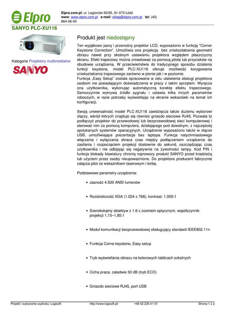 Elpro.com.pl: ul. Legionów 93/95, 91-072 Łódź www: www.elpro.com.pl e-mail: [email protected] tel: (42) 664-06-00 SANYO PLC-XU116 Produkt jest niedostępny Kategorie Projektory multimedialne Ten wyjątkowo jasny i przenośny projektor LCD, wyposażono w funkcję "Corner Keystone Correction". Umożliwia ona projekcję bez zniekształcenia geometrii obrazu nawet przy skośnym ustawieniu projektora względem płaszczyzny ekranu. Efekt trapezowy można zniwelować za pomocą pilota lub przycisków na obudowie urządzenia. W przeciwieństwie do tradycyjnego sposobu działania funkcji keystone, model PLC-XU116 oferuje możliwość korygowania zniekształcenia trapezowego zarówno w pionie jak i w poziomie. Funkcja „Easy Setup” została opracowana w celu ułatwienia obsługi projektora osobom nie posiadającym doświadczenia w pracy z takim sprzętem. Wyręcza ona użytkownika, wykonując automatyczną korektę efektu trapezowego. Samoczynnie wykrywa źródło sygnału i ustawia kilka innych parametrów roboczych, w razie potrzeby wyświetlając na ekranie wskazówki na temat ich konfiguracji. Swoją uniwersalność model PLC-XU116 zawdzięcza także dużemu wyborowi złączy, wśród których znajduje się również gniazdo sieciowe RJ45. Pozwala to podłączyć projektor do przewodowej lub bezprzewodowej sieci komputerowej i sterować nim za pomocą komputera, działającego pod dowolnym, z najczęściej spotykanych systemów operacyjnych. Urządzenie wyposażono także w złącze USB, umożliwiające prezentacje bez laptopa. Funkcja natychmiastowego włączania i wyłączania skraca czas między podłączeniem urządzenia do zasilania i rozpoczęciem projekcji dosłownie do sekund, oszczędzając czas użytkownika i nie odbijając się negatywnie na żywotności lampy. Kod PIN i funkcja blokady klawiatury chronią najnowszy produkt SANYO przed kradzieżą lub użyciem przez osoby nieupoważnione. Do projektora producent fabrycznie załącza pilot ze wskaźnikiem laserowym i torbę. Podstawowe parametry urządzenia: Jasność 4.500 ANSI lumenów Rozdzielczość XGA (1.024 x 768), kontrast: 1.000:1 Szerokokątny obiektyw z 1.6 x zoomem optycznym, współczynnik projekcji 1,15–1,85:1 Moduł komunikacji bezprzewodowej obsługujący standard IEEE802.11n Funkcja Corne keystone, Easy setup Tryb wyświetlania obrazu na kolorowych tablicach szkolnych Cicha praca, zaledwie 30 dB (tryb ECO) Gniazdo sieciowe RJ45, port USB Projekt i wykonanie wydruku: Logisoft http://www.logisoft.pl/ +48 42 235 41 51 Strona 1 z 2 Wersja produktu Cena PROJEKTORY MULTIMEDIALNE - DANE TECHNICZNE JASNOŚĆ 4.500 ANSI lm (tryb normalny/ECO) KONTRAST 1.000:1 PRZETWORNIK OBRAZU 3LCD ROZDZIELCZOŚĆ Rzeczywista 1.024 x 768 (XGA), maksymalna 1.920 x 1.200 LAMPA 275 W NSH (LMP-111) GŁOŚNOŚĆ PRACY Poziom szumu (tryb normalny/ECO) 34dB/30dB KOREKCJA Korekcja Keystone pionowa +/-40°, pozioma +/-30° ŻYWOTNOŚĆ LAMPY Tryb normalny/ECO 2.500/3.000 ODLEGŁOŚĆ OD EKRANU 0.93 –11.5 m, współczynnik odległości 1.15 –1.85 : 1 PRZYŁĄCZA Wejście PC (D-SUB 15) x 2, wejścia audio: 1 x mini jack 2xRCA (R/L), wyjście audio 1 x mini jack, wejście DVI, monitor Out (D-Sub 15), wejście S-Video (DIN 4-pin), port USB (typu A i B), RS232/RJ45 WYMIARY (szer x gł x wys) 335.7 x 257.5 x 93.9 mm WAGA 3.4 kg POBÓR MOCY 275 W Projekt i wykonanie wydruku: Logisoft Powered by TCPDF (www.tcpdf.org) http://www.logisoft.pl/ +48 42 235 41 51 Strona 2 z 2