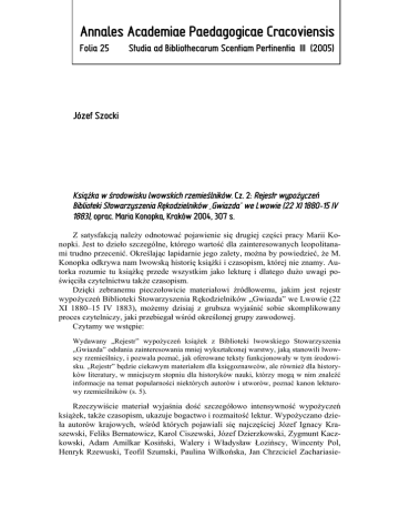 Annales Academiae Paedagogicae Cracoviensis Folia 25 Studia ad Bibliothecarum Scentiam Pertinentia III (2005) Józef Szocki Książka w środowisku lwowskich rzemieślników. Cz. 2: Rejestr wypożyczeń Biblioteki Stowarzyszenia Rękodzielników „Gwiazda” we Lwowie (22 XI 1880–15 IV 1883), oprac. Maria Konopka, Kraków 2004, 307 s. Z satysfakcją należy odnotować pojawienie się drugiej części pracy Marii Konopki. Jest to dzieło szczególne, którego wartość dla zainteresowanych leopolitanami trudno przecenić. Określając lapidarnie jego zalety, można by powiedzieć, że M. Konopka odkrywa nam lwowską historię książki i czasopism, której nie znamy. Autorka rozumie tu książkę przede wszystkim jako lekturę i dlatego dużo uwagi poświęciła czytelnictwu także czasopism. Dzięki zebranemu pieczołowicie materiałowi źródłowemu, jakim jest rejestr wypożyczeń Biblioteki Stowarzyszenia Rękodzielników „Gwiazda” we Lwowie (22 XI 1880–15 IV 1883), możemy dzisiaj z grubsza wyjaśnić sobie skomplikowany proces czytelniczy, jaki przebiegał wśród określonej grupy zawodowej. Czytamy we wstępie: Wydawany „Rejestr” wypożyczeń książek z Biblioteki lwowskiego Stowarzyszenia „Gwiazda” odsłania zainteresowania mniej wykształconej warstwy, jaką stanowili lwowscy rzemieślnicy, i pozwala poznać, jak oferowane teksty funkcjonowały w tym środowisku. „Rejestr” będzie ciekawym materiałem dla księgoznawców, ale również dla historyków literatury, w mniejszym stopniu dla historyków nauki, którzy mogą w nim znaleźć informacje na temat popularności niektórych autorów i utworów, poznać kanon lekturowy rzemieślników (s. 5). Rzeczywiście materiał wyjaśnia dość szczegółowo intensywność wypożyczeń książek, także czasopism, ukazuje bogactwo i rozmaitość lektur. Wypożyczano dzieła autorów krajowych, wśród których pojawiali się najczęściej Józef Ignacy Kraszewski, Feliks Bernatowicz, Karol Ciszewski, Józef Dzierzkowski, Zygmunt Kaczkowski, Adam Amilkar Kosiński, Walery i Władysław Łozińscy, Wincenty Pol, Henryk Rzewuski, Teofil Szumski, Paulina Wilkońska, Jan Chrzciciel Zachariasie- 328 Józef Szocki wicz. Rzadziej: Michał Bałucki, Michał Czajkowski, Aleksander Fredro, Teodor Tomasz Jeż, Józef Korzeniowski, Zygmunt Krasiński, Joachim Lelewel, Adam Mickiewicz, Zygmunt Miłkowski, Eliza Orzeszkowa, Juliusz Słowacki, Karol Szajnocha, Józef Szujski. Spośród autorów zagranicznych popularni byli: George Füllborn, Émile Gaboriau, Max Graefe, Charles Reade, Marie Sofie Schwartz, Walter Scott, Carl Spindler, Eugene Sue. Czasem byli czytani Jean Francois Bareille, Fryderyk Schiller, Szekspir, Juliusz Verne. Najbardziej popularne wśród rzemieślników lwowskich było czasopismo „Rozmaitości” – dodatek do „Gazety Lwowskiej”. Zapewne dlatego, że przynosiło co tydzień dość bogaty materiał literacki. Na drugim miejscu pod względem poczytności znalazł się tygodnik społeczno-polityczny „Kłosy”. Dużą popularnością cieszyły się; „Dzwonek”, „Dziennik Literacki”, „Przyjaciel Ludu”, „Strzecha”, „Nowiny”, „Gwiazdka Cieszyńska”, „Ruch Literacki”. Komentując to, autorka napisała: Z wykazanych w „Katalogu” tytułów poza wyborami rzemieślników pozostały niektóre czasopisma literackie i religijne, dla ludu, dzieci i młodzieży. Wypożyczeń nie doczekały się następujące periodyki: „Album Muzeum Narodowego w Rapperswilu”, „Krzyż”, „Lwowianin”, „Opiekun Domowy”, „Pamiętnik Lwowski”, „Pamiętnik Naukowy, Literacki i Artystyczny”, „Przegląd Polski”, „Przyjaciel Dzieci”, „Rocznik Wojskowy Królestwa Polskiego”, „Rozrywki dla Dzieci”, „Tygodnik Wielkopolski”, „Wieniec” i „Włościanin” (s. 32). Z pracy wynika, że stowarzyszenie przyczyniało się do ciągłości kontaktów jego członków z lekturą, wykazywało troskę o podniesienie poziomu ich wiedzy i rozwój kulturalny. Pracę wyposażono w liczne indeksy: autorów i tytułów wypożyczonych dzieł, tytułów czasopism, pozostałych wypożyczeń, nazwisk rzemieślników, grup zawodowych. W indeksie grup zawodowych rzemieślników spotykamy: bednarzy, blacharzy, budowniczych, cieśli, cukierników, drukarzy, fortepianistów, introligatorów, kapeluszników, krawców, kupców, malarzy, piekarzy, stolarzy, szewców itp. Można zgodzić się z tą oto wypowiedzią Anatola France’a: „Nie znam nic bardziej pociągającego i przyjemniejszego nad czytanie katalogów”. Dla interesujących się książką i czasopismami czytanie omawianego tu dzieła będzie zapewne taką lekturą.