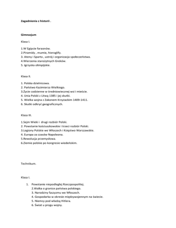 Zagadnienia z historii . Gimnazjum Klasa I. 1.W Egipcie faraonów. 2.Piramidy , mumie, hieroglify. 3. Ateny i Sparta , ustrój i organizacja społeczeństwa. 4.Wierzenia starożytnych Greków. 5. Igrzyska olimpijskie. Klasa II. 1. Polska dzielnicowa. 2. Państwo Kazimierza Wielkiego. 3.Życie codzienne w średniowiecznej wsi i mieście. 4. Unia Polski z Litwą 1385 i jej skutki. 5. Wielka wojna z Zakonem Krzyżackim 1409‐1411. 6. Skutki odkryć geograficznych. Klasa III. 1.Sejm Wieki i drugi rozbiór Polski. 2. Powstanie kościuszkowskie i trzeci rozbiór Polski. 3.Legiony Polskie we Włoszech i Księstwo Warszawskie. 4. Europa za czasów Napoleona. 5.Rewolucja przemysłowa. 6.Ziemie polskie po kongresie wiedeńskim. Technikum. Klasa I. 1. Powstanie niepodległej Rzeczpospolitej. 2.Walka o granice państwa polskiego. 3. Narodziny faszyzmu we Włoszech. 4. Gospodarka w okresie międzywojennym na świecie. 5. Niemcy pod władzą Hitlera. 6. Świat u progu wojny. Zagadnienia z wos. Klasa III. 1. Konstytucja RP i jej główne postanowienia. 2.Władza ustawodawcza w RP (sejm, senat) i jej główne funkcje. 3. Władza wykonawcza w RP(rząd, prezydent) i jej główne funkcje. 4. Władza sądownicza w RP i jej główne funkcje. 5.Główne polskie partie polityczne, program i przywódcy.