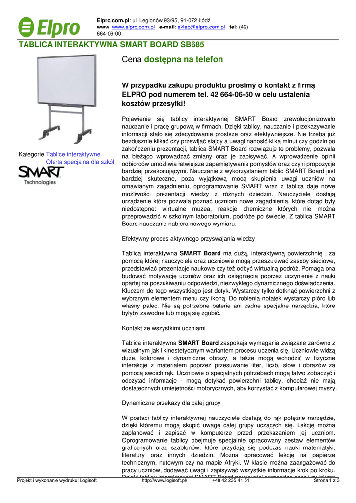 Elpro.com.pl: ul. Legionów 93/95, 91-072 Łódź www: www.elpro.com.pl e-mail: [email protected] tel: (42) 664-06-00 TABLICA INTERAKTYWNA SMART BOARD SB685 Cena dostępna na telefon W przypadku zakupu produktu prosimy o kontakt z firmą ELPRO pod numerem tel. 42 664-06-50 w celu ustalenia kosztów przesyłki! Kategorie Tablice interaktywne Oferta specjalna dla szkół Pojawienie się tablicy interaktywnej SMART Board zrewolucjonizowało nauczanie i pracę grupową w firmach. Dzięki tablicy, nauczanie i przekazywanie informacji stało się zdecydowanie prostsze oraz efektywniejsze. Nie trzeba już bezdusznie klikać czy przewijać slajdy a uwagi nanosić kilka minut czy godzin po zakończeniu prezentacji, tablica SMART Board rozwiązuje te problemy, pozwala na bieżąco wprowadzać zmiany oraz je zapisywać. A wprowadzenie opinii odbiorców umożliwia łatwiejsze zapamiętywanie pomysłów oraz czyni propozycje bardziej przekonującymi. Nauczanie z wykorzystaniem tablic SMART Board jest bardziej skuteczne, poza wyjątkową mocą skupienia uwagi uczniów na omawianym zagadnieniu, oprogramowanie SMART wraz z tablica daje nowe możliwości prezentacji wiedzy z różnych dziedzin. Nauczyciele dostają urządzenie które pozwala poznać uczniom nowe zagadnienia, które dotąd były niedostępne: wirtualne muzea, reakcje chemiczne których nie można przeprowadzić w szkolnym laboratorium, podróże po świecie. Z tablica SMART Board nauczanie nabiera nowego wymiaru. Efektywny proces aktywnego przyswajania wiedzy Tablica interaktywna SMART Board ma dużą, interaktywną powierzchnię , za pomocą której nauczyciele oraz uczniowie mogą przeszukiwać zasoby sieciowe, przedstawiać prezentacje naukowe czy też odbyć wirtualną podróż. Pomaga ona budować motywację uczniów oraz ich osiągnięcia poprzez uczynienie z nauki opartej na poszukiwaniu odpowiedzi, niezwykłego dynamicznego doświadczenia. Kluczem do tego wszystkiego jest dotyk. Wystarczy tylko dotknąć powierzchni z wybranym elementem menu czy ikoną. Do robienia notatek wystarczy pióro lub własny palec. Nie są potrzebne baterie ani żadne specjalne narzędzia, które byłyby zawodne lub mogą się zgubić. Kontakt ze wszystkimi uczniami Tablica interaktywna SMART Board zaspokaja wymagania związane zarówno z wizualnym jak i kinestetycznym wariantem procesu uczenia się. Uczniowie widzą duże, kolorowe i dynamiczne obrazy, a także mogą wchodzić w fizyczne interakcje z materiałem poprzez przesuwanie liter, liczb, słów i obrazów za pomocą swoich rąk. Uczniowie o specjalnych potrzebach mogą łatwo zobaczyć i odczytać informacje - mogą dotykać powierzchni tablicy, chociaż nie mają dostatecznych umiejętności motorycznych, aby korzystać z komputerowej myszy. Dynamiczne przekazy dla całej grupy Projekt i wykonanie wydruku: Logisoft W postaci tablicy interaktywnej nauczyciele dostają do rąk potężne narzędzie, dzięki któremu mogą skupić uwagę całej grupy uczących się. Lekcję można zaplanować i zapisać w komputerze przed przekazaniem jej uczniom. Oprogramowanie tablicy obejmuje specjalnie opracowany zestaw elementów graficznych oraz szablonów, które przydają się podczas nauki matematyki, literatury oraz innych dziedzin. Można opracować lekcję na papierze technicznym, nutowym czy na mapie Afryki. W klasie można zaangażować do pracy uczniów, dodawać uwagi i zapisywać wszystkie informacje krok po kroku. Dzięki tablicy interaktywnej SMART Board nauczyciel oszczędza czas i zwiększa http://www.logisoft.pl/ +48 42 235 41 51 Strona 1 z 3 szanse efektywnej nauki, i to w przypadku każdego z jego uczniów. Wersja produktu Cena TABLICA INTERAKTYWNA SMART BOARD SB685 0,00 PLN 0,00 PLN netto TABLICE INTERAKTYWNE - DANE TECHNICZNE TECHNOLOGIA Rezystancyjna POWIERZCHNIA Utwardzony poliester, powierzchnia zoptymalizowana do projekcji, pisania pisakami suchościeralnymi oraz łatwa w czyszczeniu, odporna na uszkodzenia SPOSÓB OBSŁUGI Za pomocą palca, długopisu bądź wskaźnika FORMAT TABLICY 16 / 10 GABARYTY (szer. x wys.) 196,9 × 125,7 cm POWIERZCHNIA ROBOCZA (szer. x wys.) 188 x 117,2 cm INTERFEJSY USB 2.0, Bluetooth (opcja), RS-232 (opcja) PASKI SKRÓTÓW Przyciski na półce na pisaki (dolna część tablicy) - klawiatura ekranowa, prawy przycisk myszy, centrum pomocy (realizowane za pomocą 3 przycisków - każdy z przycisków jest programowalny) na półce 4 pisaki (w kolorze niebieskim, czarnym, czerwonym i zielo WAGA 19,1 kg SYSTEM OPERACYJNY Windows 2000, Windows XP, Windows Vista, Mac OS X, Linux ZASILANIE Zasilanie uzyskiwane bezpośrednio z komputera poprzez kabel USB; pobór mocy jest mniejszy niż 1,5 W (300mA na 5V) SPOSÓB MOCOWANIA Montaż na ścianie AKCESORIA Zestaw do mocowania tablicy na ścianie wraz z kołkami, kabel USB 5m, podręcznik użytkownika i instrukcja instalacji, nośnik z oprogramowaniem SMART Board, nośnik z dodatkową galerią do oprogramowania, 4 pisaki i gąbka. Opcjonalnie: moduł RS-232 na USB, mo PRZEKĄTNA 87 1/8'' Projekt i wykonanie wydruku: Logisoft http://www.logisoft.pl/ +48 42 235 41 51 Strona 2 z 3 Galeria Projekt i wykonanie wydruku: Logisoft Powered by TCPDF (www.tcpdf.org) http://www.logisoft.pl/ +48 42 235 41 51 Strona 3 z 3