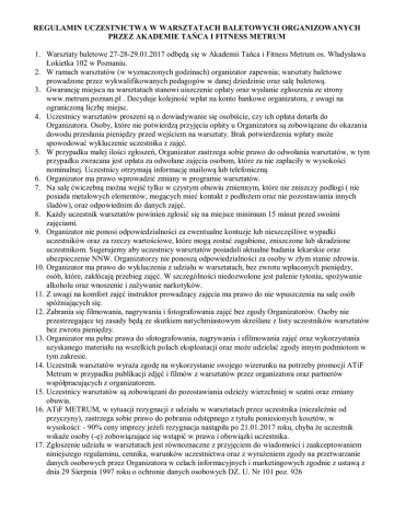 REGULAMIN UCZESTNICTWA W WARSZTATACH BALETOWYCH ORGANIZOWANYCH PRZEZ AKADEMIE TAŃCA I FITNESS METRUM 1. Warsztaty baletowe 27-28-29.01.2017 odbędą się w Akademii Tańca i Fitness Metrum os. Władysława Łokietka 102 w Poznaniu. 2. W ramach warsztatów (w wyznaczonych godzinach) organizator zapewnia; warsztaty baletowe prowadzone przez wykwalifikowanych pedagogów w danej dziedzinie oraz salę baletową. 3. Gwarancję miejsca na warsztatach stanowi uiszczenie opłaty oraz wysłanie zgłoszenia ze strony www.metrum.poznan.pl . Decyduje kolejność wpłat na konto bankowe organizatora, z uwagi na ograniczoną liczbę miejsc. 4. Uczestnicy warsztatów proszeni są o dowiadywanie się osobiście, czy ich opłata dotarła do Organizatora. Osoby, które nie potwierdzą przyjęcia opłaty u Organizatora są zobowiązane do okazania dowodu przesłania pieniędzy przed wejściem na warsztaty. Brak potwierdzenia wpłaty może spowodować wykluczenie uczestnika z zajęć. 5. W przypadku małej ilości zgłoszeń, Organizator zastrzega sobie prawo do odwołania warsztatów, w tym przypadku zwracana jest opłata za odwołane zajęcia osobom, które za nie zapłaciły w wysokości nominalnej. Uczestnicy otrzymają informację mailową lub telefoniczną. 6. Organizator ma prawo wprowadzić zmiany w programie warsztatów. 7. Na salę ćwiczebną można wejść tylko w czystym obuwiu zmiennym, które nie zniszczy podłogi ( nie posiada metalowych elementów, mogących mieć kontakt z podłożem oraz nie pozostawiania innych śladów), oraz odpowiednim do danych zajęć. 8. Każdy uczestnik warsztatów powinien zgłosić się na miejsce minimum 15 minut przed swoimi zajęciami. 9. Organizator nie ponosi odpowiedzialności za ewentualne kontuzje lub nieszczęśliwe wypadki uczestników oraz za rzeczy wartościowe, które mogą zostać zagubione, zniszczone lub skradzione uczestnikom. Sugerujemy aby uczestnicy warsztatów posiadali aktualne badania lekarskie oraz ubezpieczenie NNW. Organizatorzy nie ponoszą odpowiedzialności za osoby w złym stanie zdrowia. 10. Organizator ma prawo do wykluczenia z udziału w warsztatach, bez zwrotu wpłaconych pieniędzy, osób, które, zakłócają przebieg zajęć. W szczególności niedozwolone jest palenie tytoniu, spożywanie alkoholu oraz wnoszenie i zażywanie narkotyków. 11. Z uwagi na komfort zajęć instruktor prowadzący zajęcia ma prawo do nie wpuszczenia na salę osób spóźniających się. 12. Zabrania się filmowania, nagrywania i fotografowania zajęć bez zgody Organizatorów. Osoby nie przestrzegające tej zasady będą ze skutkiem natychmiastowym skreślane z listy uczestników warsztatów bez zwrotu pieniędzy. 13. Organizator ma pełne prawa do sfotografowania, nagrywania i sfilmowania zajęć oraz wykorzystania uzyskanego materiału na wszelkich polach eksploatacji oraz może udzielać zgody innym podmiotom w tym zakresie. 14. Uczestnik warsztatów wyraża zgodę na wykorzystanie swojego wizerunku na potrzeby promocji ATiF Metrum w przypadku publikacji zdjęć i filmów z warsztatów przez organizatora oraz partnerów współpracujących z organizatorem. 15. Uczestnicy warsztatów są zobowiązani do pozostawiania odzieży wierzchniej w szatni oraz zmiany obuwia. 16. ATiF METRUM, w sytuacji rezygnacji z udziału w warsztatach przez uczestnika (niezależnie od przyczyny), zastrzega sobie prawo do pobrania odstępnego z tytułu poniesionych kosztów, w wysokości: - 90% ceny imprezy jeżeli rezygnacja nastąpiła po 21.01.2017 roku, chyba że uczestnik wskaże osoby (-ę) zobowiązujące się wstąpić w prawa i obowiązki uczestnika. 17. Zgłoszenie udziału w warsztatach jest równoznaczne z przyjęciem do wiadomości i zaakceptowaniem niniejszego regulaminu, cennika, warunków uczestnictwa oraz z wyrażeniem zgody na przetwarzanie danych osobowych przez Organizatora w celach informacyjnych i marketingowych zgodnie z ustawą z dnia 29 Sierpnia 1997 roku o ochronie danych osobowych DZ. U. Nr 101 poz. 926