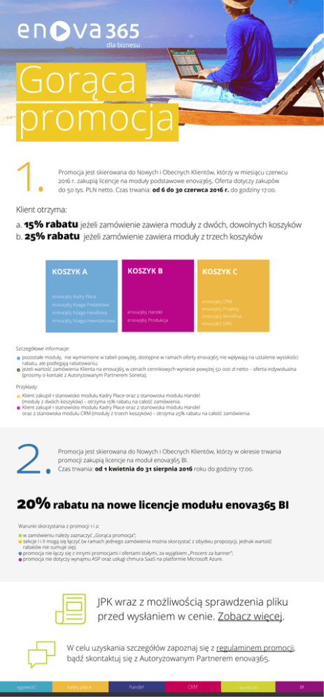 dla biznesu Gorąca promocja 1. Promocja jest skierowana do Nowych i Obecnych Klientów, którzy w miesiącu czerwcu 2016 r. zakupią licencje na moduły podstawowe enova365. Oferta dotyczy zakupów do 50 tys. PLN netto. Czas trwania: od 6 do 30 czerwca 2016 r. do godziny 17:00. Klient otrzyma: a. 15% rabatu jeżeli zamówienie zawiera moduły z dwóch, dowolnych koszyków b. 25% rabatu jeżeli zamówienie zawiera moduły z trzech koszyków KOSZYK B KOSZYK A KOSZYK C enova365 Kadry Płace enova365 CRM enova365 Księga Podatkowa enova365 Księga Handlowa enova365 Handel enova365 Księga Inwentarzowa enova365 Produkcja enova365 Projekty enova365 Workflow enova365 DMS Szczegółowe informacje: pozostałe moduły, nie wymienione w tabeli powyżej, dostępne w ramach oferty enova365 nie wpływają na ustalenie wysokości rabatu, ale podlegają rabatowaniu; jeżeli wartość zamówienia Klienta na enova365 w cenach cennikowych wyniesie powyżej 50 000 zł netto – oferta indywidualna (prosimy o kontakt z Autoryzowanym Partnerem Soneta); Przykłady: Klient zakupił 1 stanowisko modułu Kadry Płace oraz 2 stanowiska modułu Handel (moduły z dwóch koszyków) – otrzyma 15% rabatu na całość zamówienia. Klient zakupił 1 stanowisko modułu Kadry Płace oraz 2 stanowiska modułu Handel oraz 2 stanowiska modułu CRM (moduły z trzech koszyków) – otrzyma 25% rabatu na całość zamówienia. 2. Promocja jest skierowana do Nowych i Obecnych Klientów, którzy w okresie trwania promocji zakupią licencje na moduł enova365 BI. Czas trwania: od 1 kwietnia do 31 sierpnia 2016 roku do godziny 17:00. 20% rabatu na nowe licencje modułu enova365 BI Warunki skorzystania z promocji 1 i 2: w zamówieniu należy zaznaczyć „Gorąca promocja”; sekcje I i II mogą się łączyć (w ramach jednego zamówienia można skorzystać z obydwu propozycji, jednak wartość rabatów nie sumuje się); promocja nie łączy się z innymi promocjami i ofertami stałymi, za wyjątkiem „Procent za banner”; promocja nie dotyczy wynajmu ASP oraz usługi chmura SaaS na platformie Microsoft Azure. JPK wraz z możliwością sprawdzenia pliku przed wysłaniem w cenie. Zobacz więcej. W celu uzyskania szczegółów zapoznaj się z regulaminem promocji, bądź skontaktuj się z Autoryzowanym Partnerem enova365. handel CRM BI
