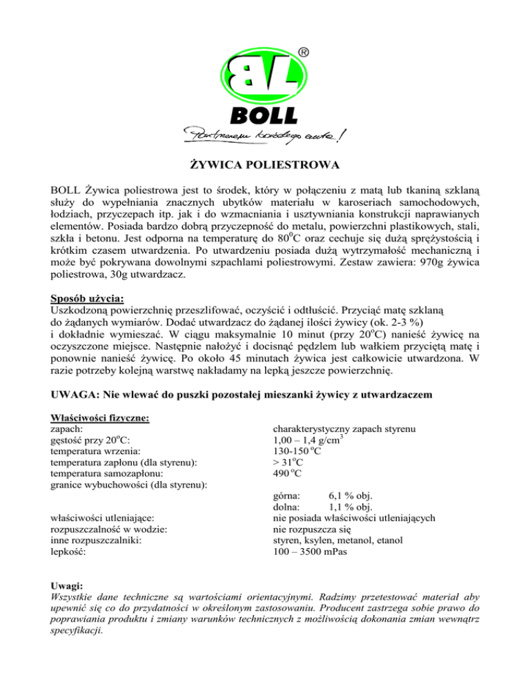 ŻYWICA POLIESTROWA BOLL Żywica poliestrowa jest to środek, który w połączeniu z matą lub tkaniną szklaną służy do wypełniania znacznych ubytków materiału w karoseriach samochodowych, łodziach, przyczepach itp. jak i do wzmacniania i usztywniania konstrukcji naprawianych elementów. Posiada bardzo dobrą przyczepność do metalu, powierzchni plastikowych, stali, szkła i betonu. Jest odporna na temperaturę do 800C oraz cechuje się dużą sprężystością i krótkim czasem utwardzenia. Po utwardzeniu posiada dużą wytrzymałość mechaniczną i może być pokrywana dowolnymi szpachlami poliestrowymi. Zestaw zawiera: 970g żywica poliestrowa, 30g utwardzacz. Sposób użycia: Uszkodzoną powierzchnię przeszlifować, oczyścić i odtłuścić. Przyciąć matę szklaną do żądanych wymiarów. Dodać utwardzacz do żądanej ilości żywicy (ok. 2-3 %) i dokładnie wymieszać. W ciągu maksymalnie 10 minut (przy 20oC) nanieść żywicę na oczyszczone miejsce. Następnie nałożyć i docisnąć pędzlem lub wałkiem przyciętą matę i ponownie nanieść żywicę. Po około 45 minutach żywica jest całkowicie utwardzona. W razie potrzeby kolejną warstwę nakładamy na lepką jeszcze powierzchnię. UWAGA: Nie wlewać do puszki pozostałej mieszanki żywicy z utwardzaczem Właściwości fizyczne: zapach: gęstość przy 20oC: temperatura wrzenia: temperatura zapłonu (dla styrenu): temperatura samozapłonu: granice wybuchowości (dla styrenu): właściwości utleniające: rozpuszczalność w wodzie: inne rozpuszczalniki: lepkość: charakterystyczny zapach styrenu 1,00 – 1,4 g/cm3 130-150 oC > 31oC 490 oC górna: 6,1 % obj. dolna: 1,1 % obj. nie posiada właściwości utleniających nie rozpuszcza się styren, ksylen, metanol, etanol 100 – 3500 mPas Uwagi: Wszystkie dane techniczne są wartościami orientacyjnymi. Radzimy przetestować materiał aby upewnić się co do przydatności w określonym zastosowaniu. Producent zastrzega sobie prawo do poprawiania produktu i zmiany warunków technicznych z możliwością dokonania zmian wewnątrz specyfikacji.