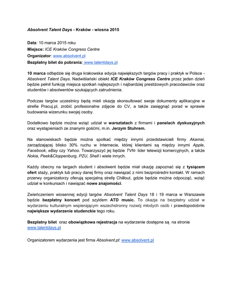 Absolvent Talent Days - Kraków - wiosna 2015 Data: 10 marca 2015 roku Miejsce: ICE Kraków Congress Centre Organizator: www.absolvent.pl Bezpłatny bilet do pobrania: www.talentdays.pl 10 marca odbędzie się druga krakowska edycja największych targów pracy i praktyk w Polsce Absolvent Talent Days. Nadwiślański obiekt ICE Kraków Congress Centre przez jeden dzień będzie pełnił funkcję miejsca spotkań najlepszych i najbardziej prestiżowych pracodawców oraz studentów i absolwentów szukających zatrudnienia. Podczas targów uczestnicy będą mieli okazję skonsultować swoje dokumenty aplikacyjne w strefie Pracuj.pl, zrobić profesionalne zdjęcie do CV, a także zasięgnąć porad w sprawie budowania wizerunku swojej osoby. Dodatkowo będzie można wziąć udział w warsztatach z firmami i panelach dyskusyjnych oraz wystąpieniach ze znanymi gośćmi, m.in. Jerzym Stuhrem. Na stanowiskach będzie można spotkać między innymi przedstawicieli firmy Akamai, zarządzającej blisko 30% ruchu w Internecie, której klientami są między innymi Apple, Facebook, eBay czy Yahoo. Towarzyszyć jej będzie TVN- lider telewizji komercyjnych, a także Nokia, Peek&Cloppenburg, PZU, Shell i wiele innych. Każdy obecny na targach student i absolwent będzie miał okazję zapoznać się z tysiącem ofert staży, praktyk lub pracy danej firmy oraz nawiązać z nimi bezprośredni kontakt. W ramach przerwy organizatorzy oferują specjalną strefę Chillout, gdzie będzie można odpocząć, wziąć udział w konkursach i nawiązać nowe znajomości. Zwieńczeniem wiosennej edycji targów Absolvent Talent Days 18 i 19 marca w Warszawie będzie bezpłatny koncert pod szyldem ATD music. To okazja na bezpłatny udział w wydarzeniu kulturalnym wspierającym wszechstronny rozwój młodych osób i prawdopodobnie największe wydarzenie studenckie tego roku. Bezpłatny bilet oraz obowiązkowa rejestracja na wydarzenie dostępne są na stronie www.talentdays.pl Organizatorem wydarzenia jest firma Absolvent.pl: www.absolvent.pl